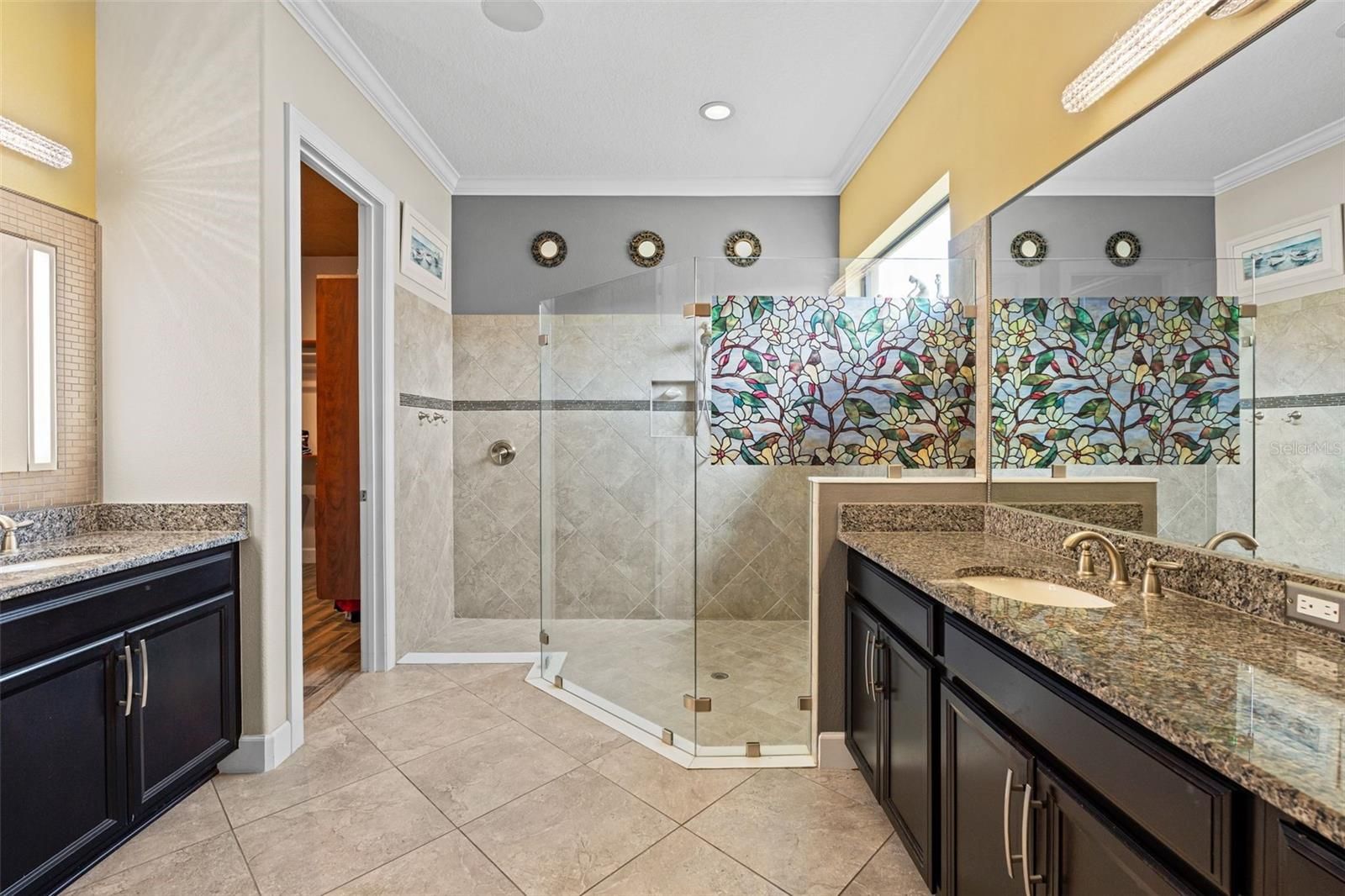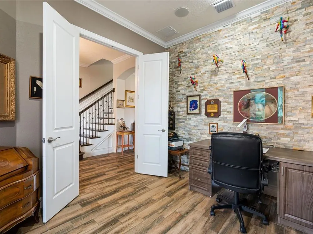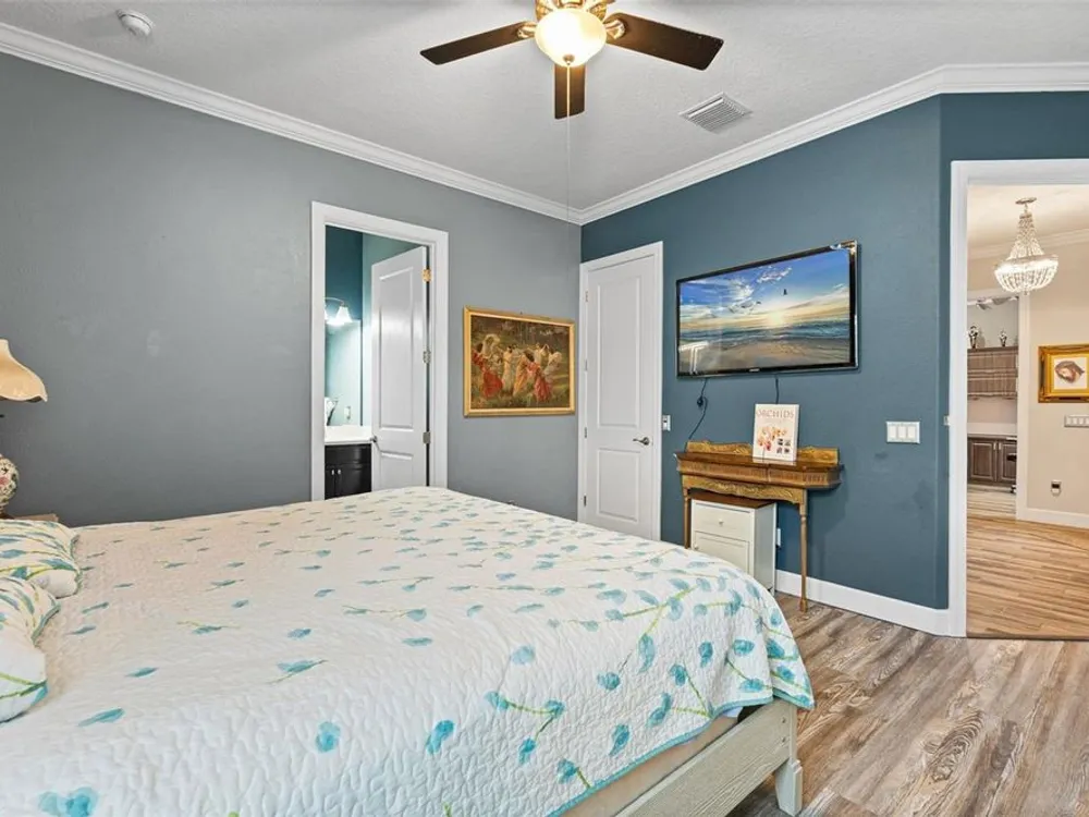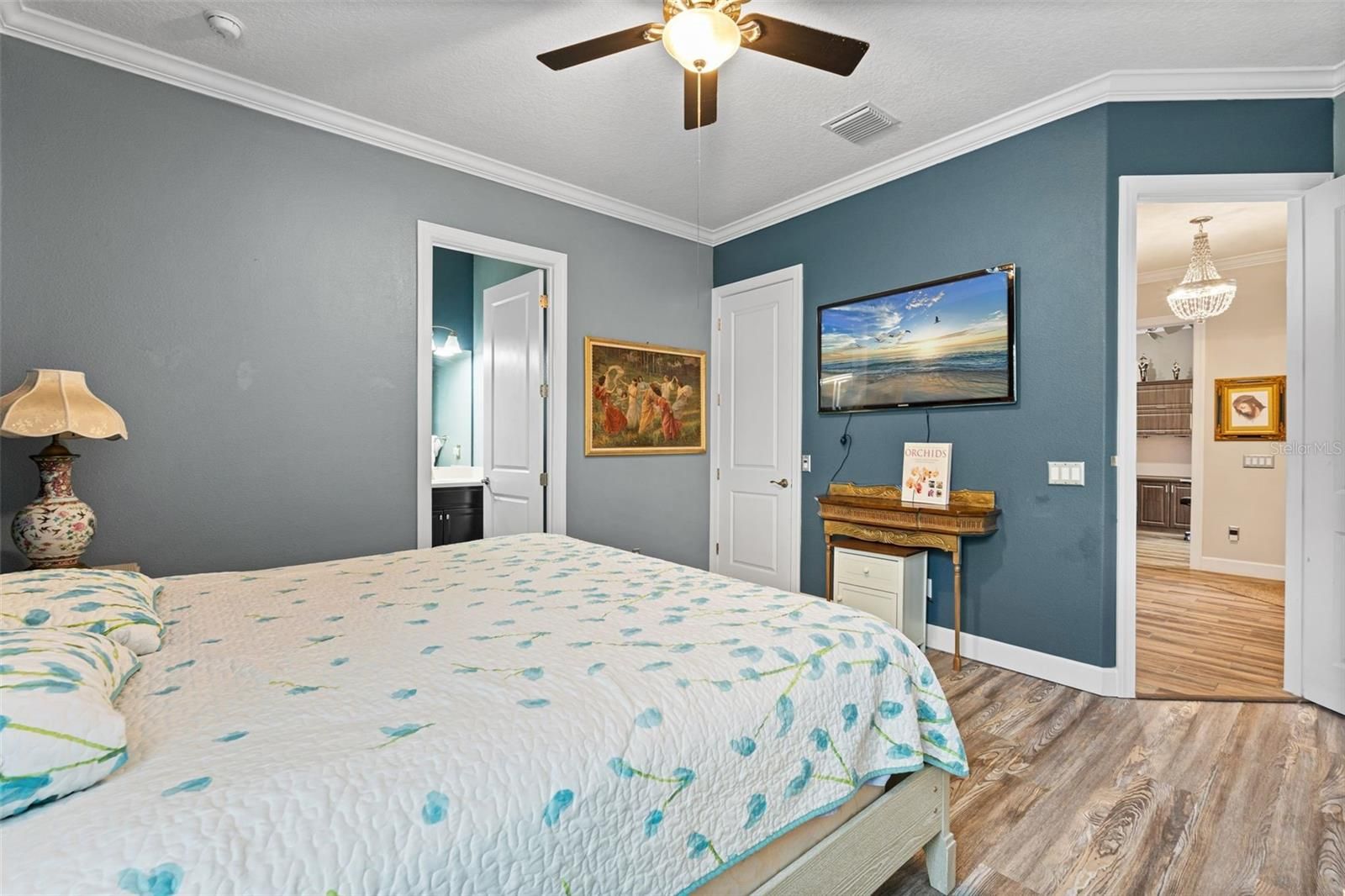 - Ceiling Fan(s), Central Vacuum, Chair Rail, Crown Molding, Dry Bar, Eat-in Kitchen, High Ceilings, Open Floorplan, Main Level Primary, Solid Surface Counters, Split Bedrooms, Walk-In Closet(s), Window Treatments