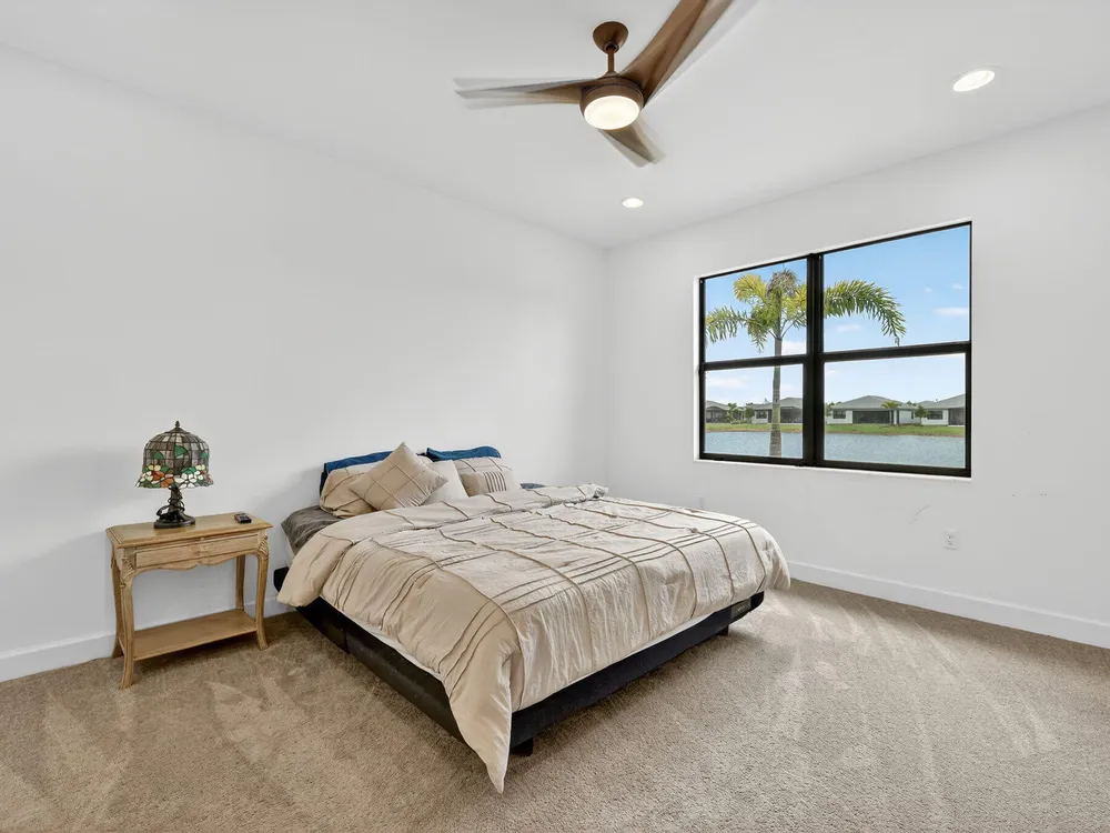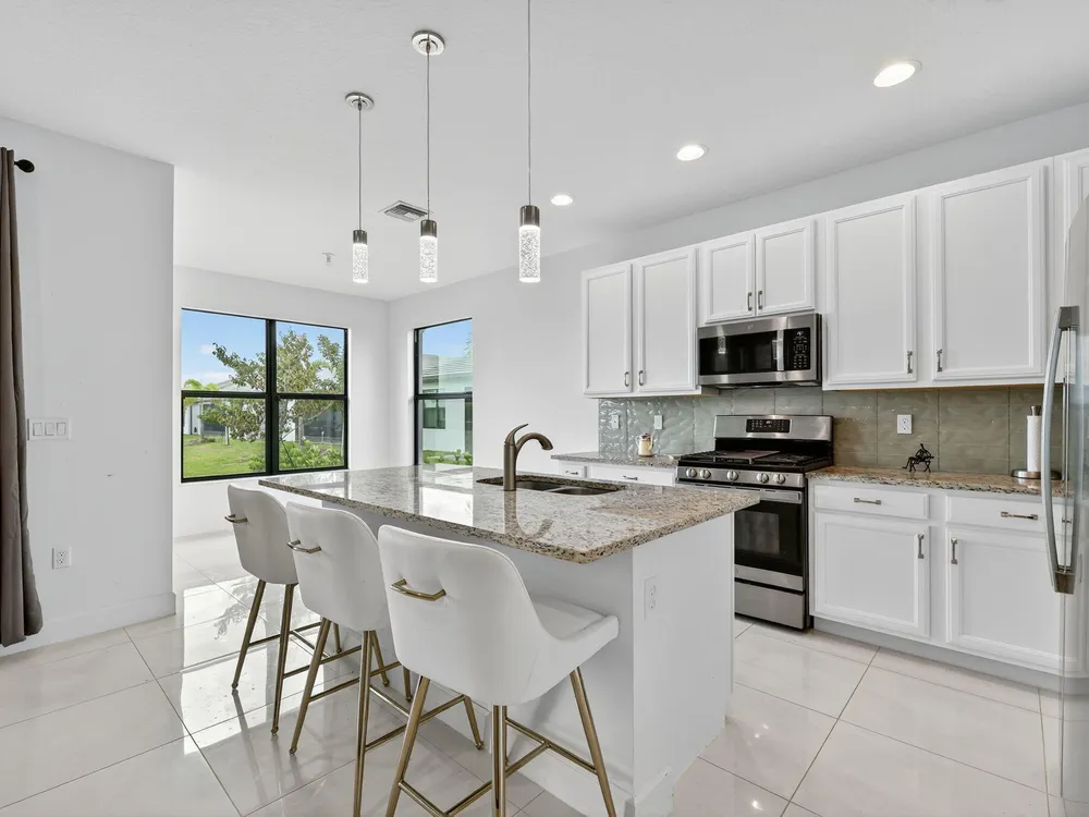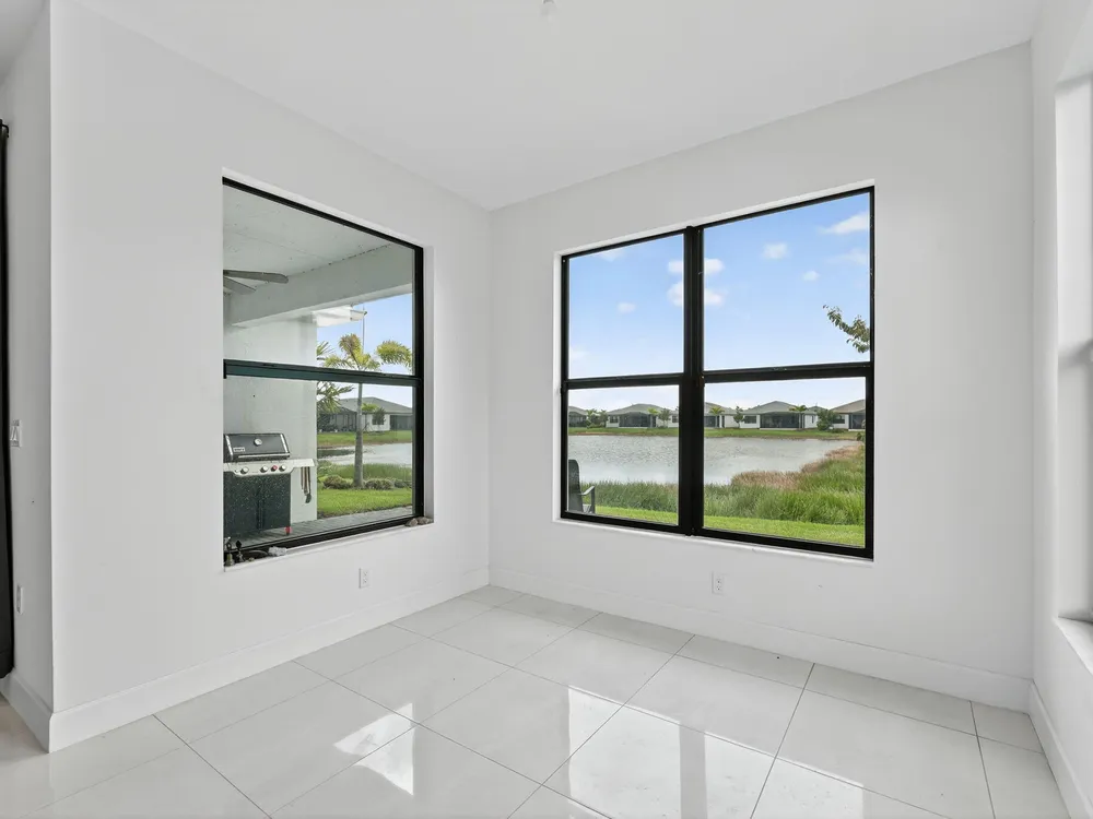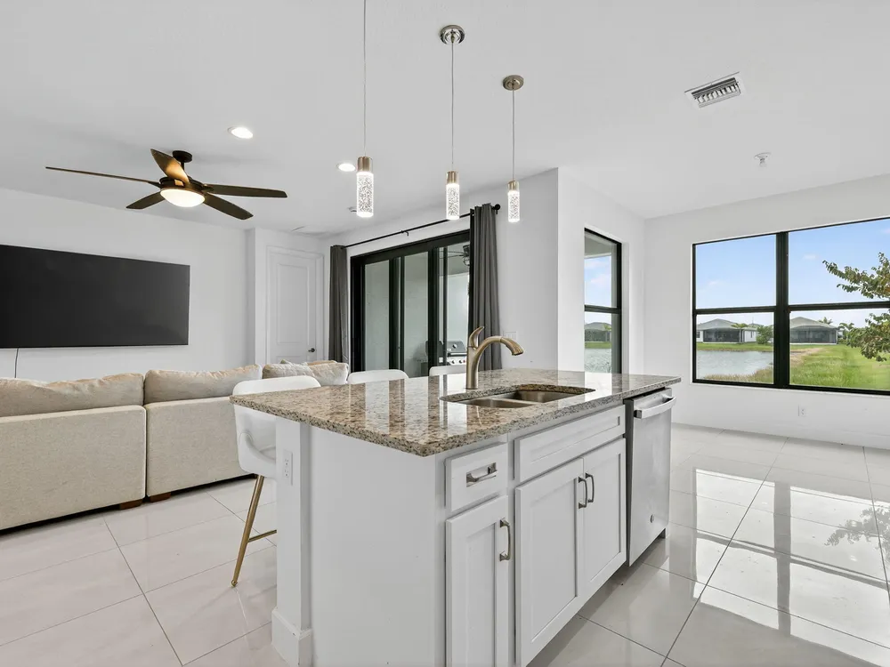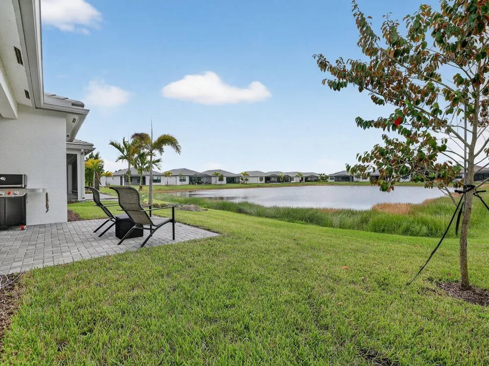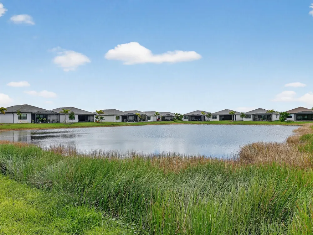 Light and bright single-story lakefront home in highly sought after Valencia Walk. Built in 2024, this beautiful residence features 12 by 24 rectified tile flooring, upgraded cabinetry, premium appliances, and stylish tile finishes throughout the kitchen and baths. The open concept layout includes a spacious kitchen with a large island and breakfast nook - perfect for entertaining - while offering serene lake views and abundant natural light. Designed with modern living in mind, the home is equipped with ample outlets to support today's technology needs. The den could easily be converted into a guest room or office as the pocket doors add versatility. Riverland is an active community with amenities galore and golf cart paths meandering throughout the different communities.
