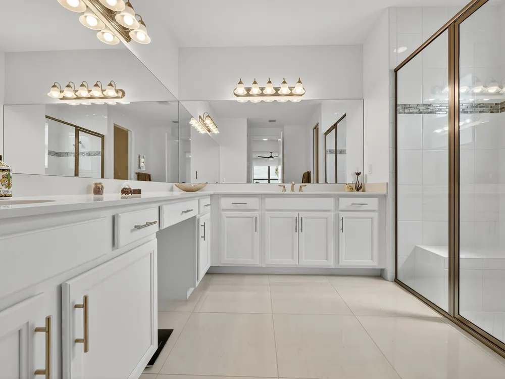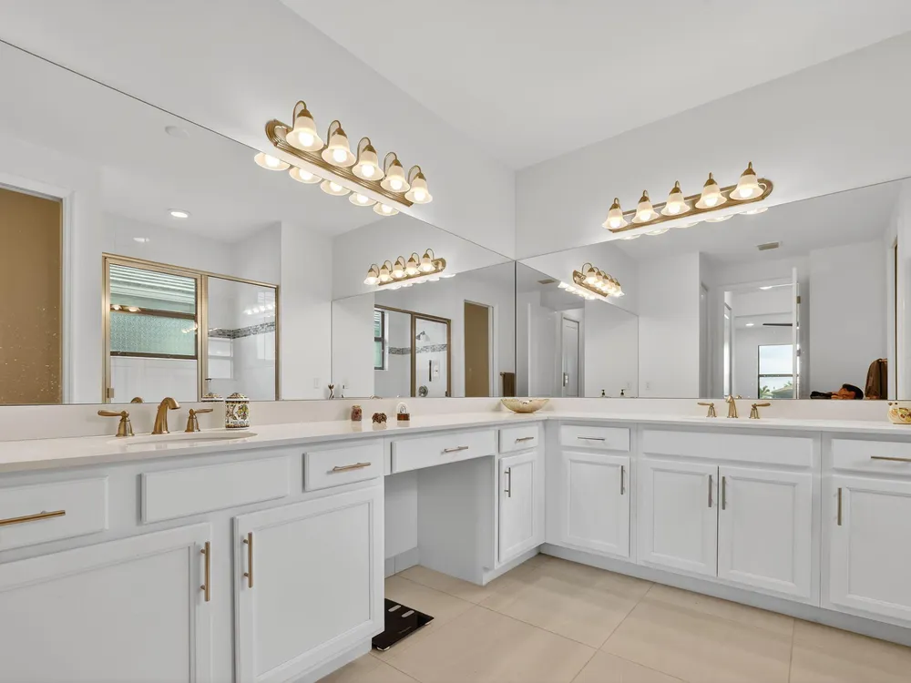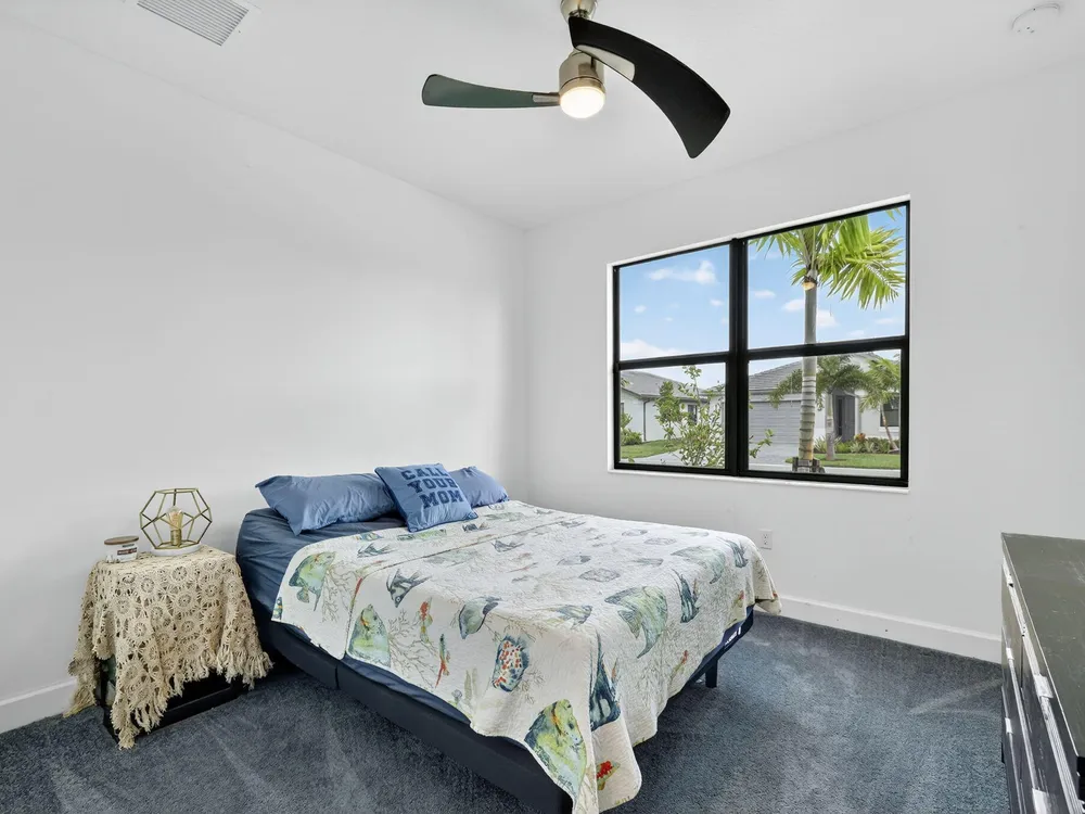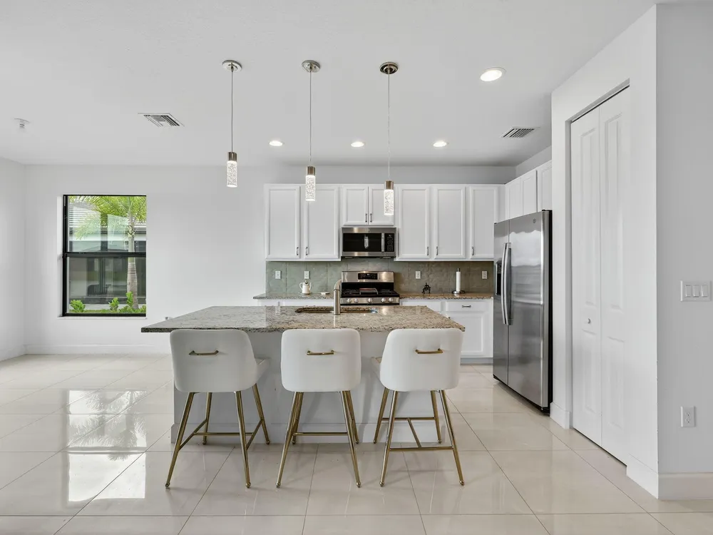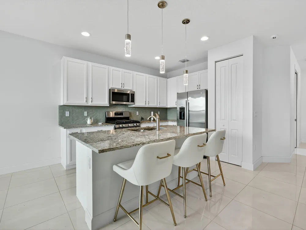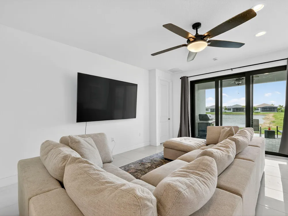 Light and bright single-story lakefront home in highly sought after Valencia Walk. Built in 2024, this beautiful residence features 12 by 24 rectified tile flooring, upgraded cabinetry, premium appliances, and stylish tile finishes throughout the kitchen and baths. The open concept layout includes a spacious kitchen with a large island and breakfast nook - perfect for entertaining - while offering serene lake views and abundant natural light. Designed with modern living in mind, the home is equipped with ample outlets to support today's technology needs. The den could easily be converted into a guest room or office as the pocket doors add versatility. Riverland is an active community with amenities galore and golf cart paths meandering throughout the different communities.