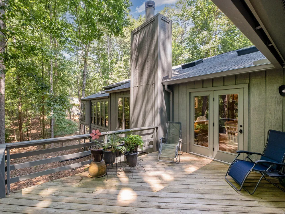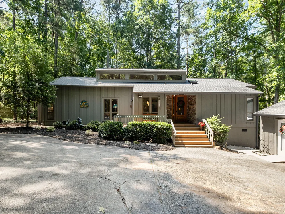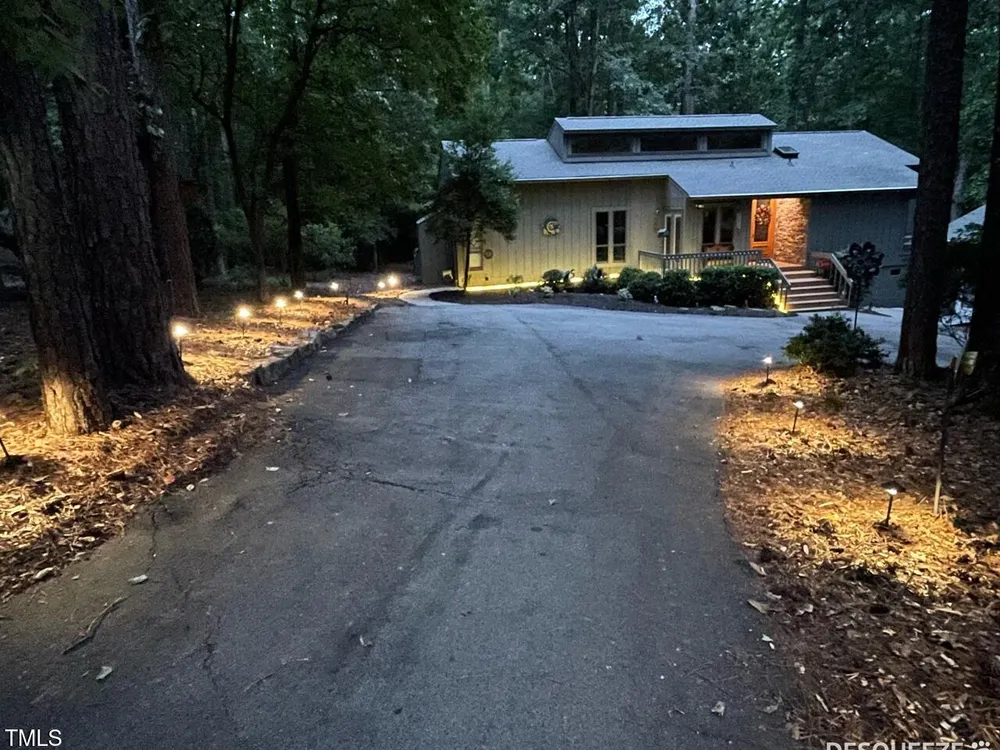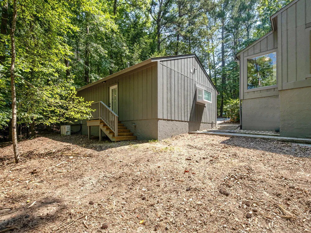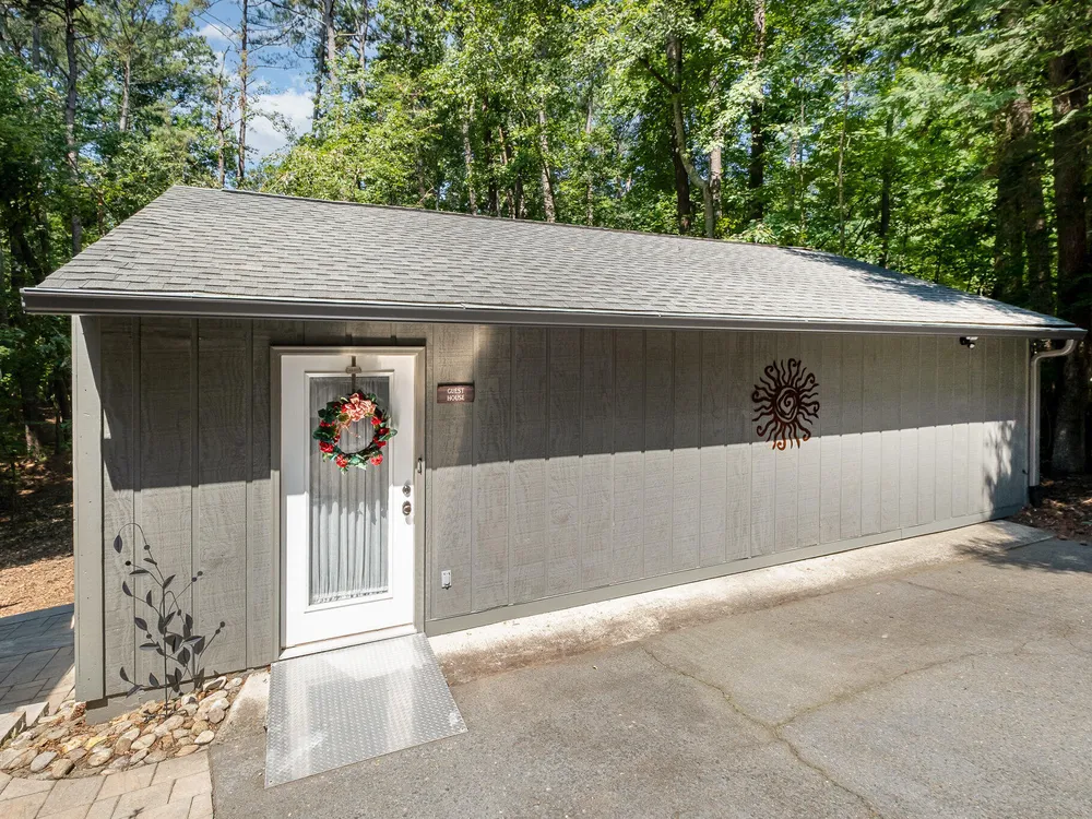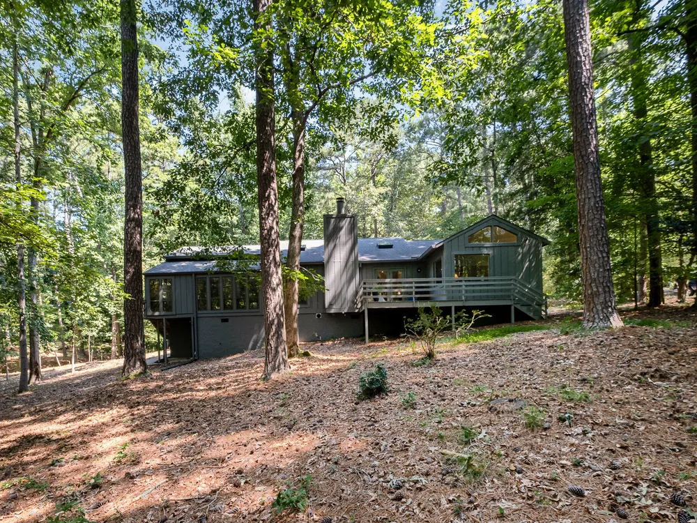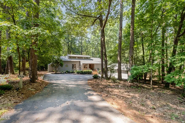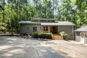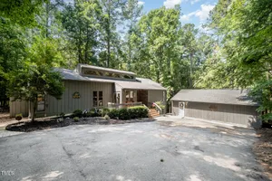 One-level contemporary home with a separate guest house/office/studio on a .9-acre lot in the ''historic district'' of Fearrington Village. This home blends into a wooded, natural setting and it has great privacy and views. Beautifully maintained and updated. The main house has an entry foyer, large living room with a wall of built-in shelving, fireplace, and vaulted ceiling with clerestory windows. The dining room can be at one end of the living room or in another space currently used as a sitting area adjacent to the kitchen. The kitchen features a well-organized pantry, an island, and a breakfast nook with a glass door that opens to the front deck. The primary bedroom suite is at one end of the house and includes a vaulted ceiling, private bath, walk-in closet, and a sunroom. The laundry room is conveniently located near the primary bedroom closet and provides a lot of storage space. The other two bedrooms and full bath are at the opposite end of the house. One of these bedrooms is quite large with room for a sitting area or study. There's a deck at the back of the house overlooking the woods. The separate guest house/office/studio has a full bath and a kitchenette. There is a walk-in area under the main house for storage and workshop space. Exterior storage closet for garden equipment. The main house has a 3-zone HVAC system, and the guest house has two mini-split HVAC units. Tankless water heater. Handicap accessible with cleverly placed ramps at the front entry deck and guest house.