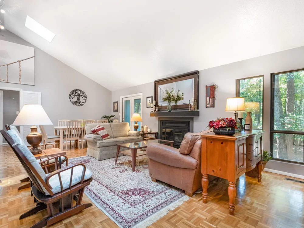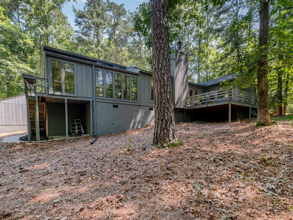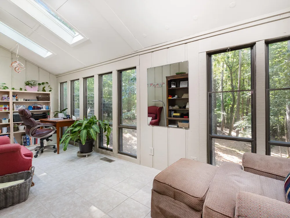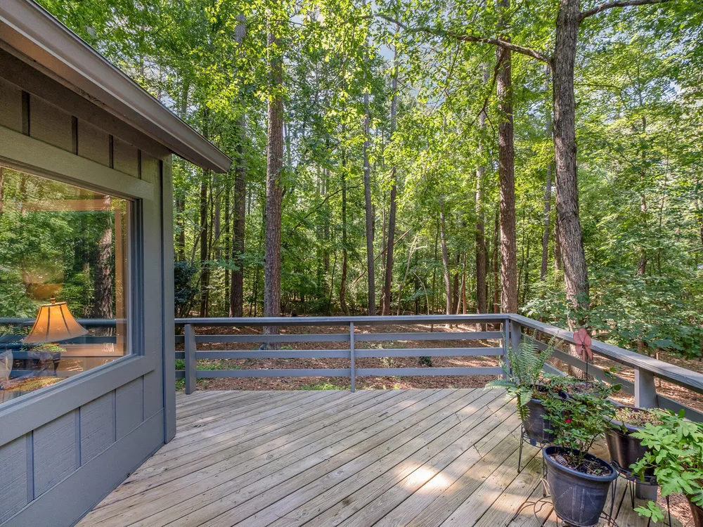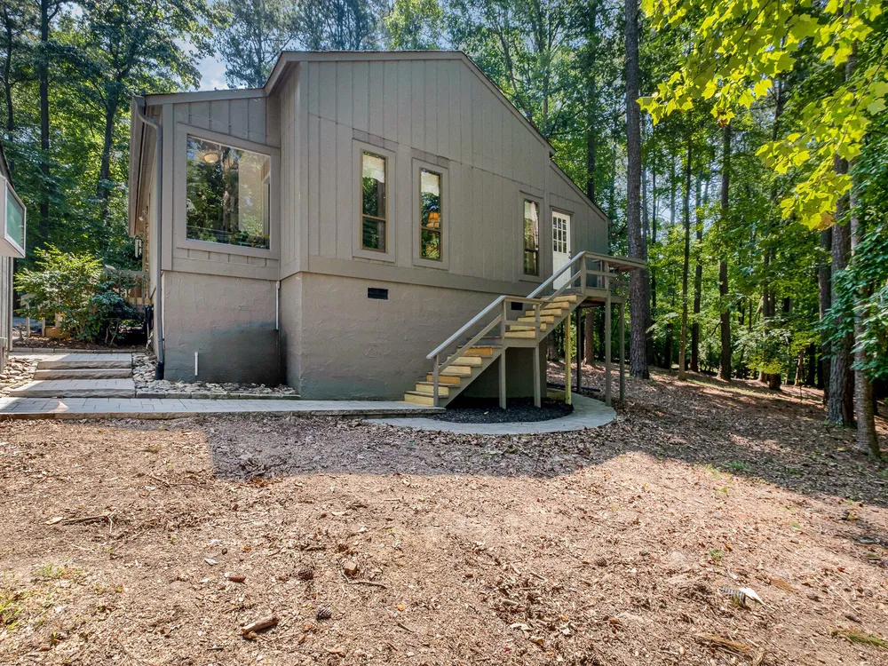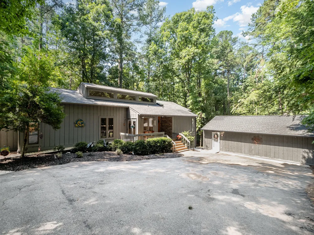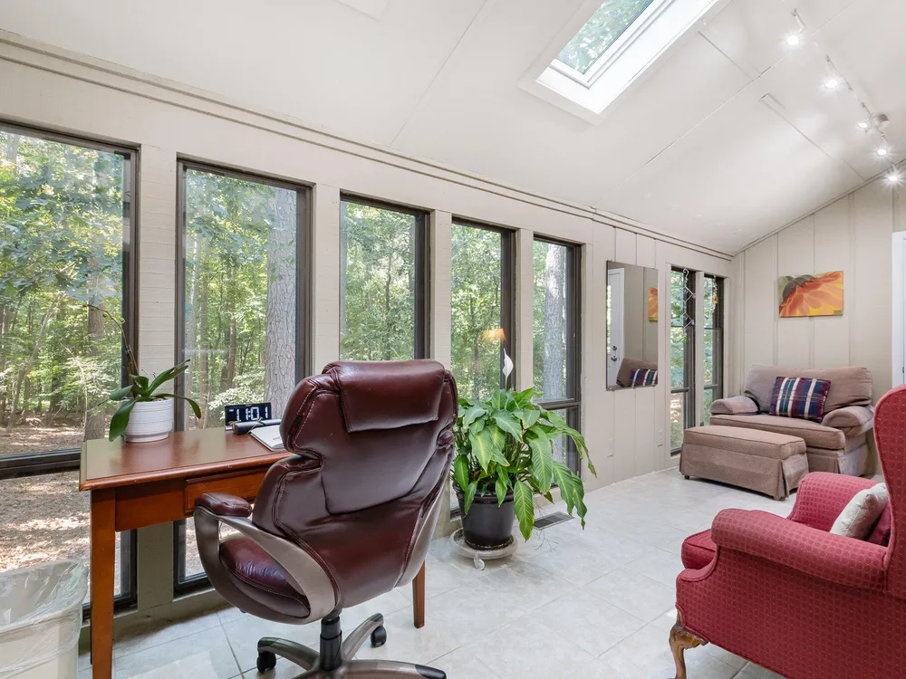 One-level contemporary home with a separate guest house/office/studio on a .9-acre lot in the ''historic district'' of Fearrington Village. This home blends into a wooded, natural setting and it has great privacy and views. Beautifully maintained and updated. The main house has an entry foyer, large living room with a wall of built-in shelving, fireplace, and vaulted ceiling with clerestory windows. The dining room can be at one end of the living room or in another space currently used as a sitting area adjacent to the kitchen. The kitchen features a well-organized pantry, an island, and a breakfast nook with a glass door that opens to the front deck. The primary bedroom suite is at one end of the house and includes a vaulted ceiling, private bath, walk-in closet, and a sunroom. The laundry room is conveniently located near the primary bedroom closet and provides a lot of storage space. The other two bedrooms and full bath are at the opposite end of the house. One of these bedrooms is quite large with room for a sitting area or study. There's a deck at the back of the house overlooking the woods. The separate guest house/office/studio has a full bath and a kitchenette. There is a walk-in area under the main house for storage and workshop space. Exterior storage closet for garden equipment. The main house has a 3-zone HVAC system, and the guest house has two mini-split HVAC units. Tankless water heater. Handicap accessible with cleverly placed ramps at the front entry deck and guest house.