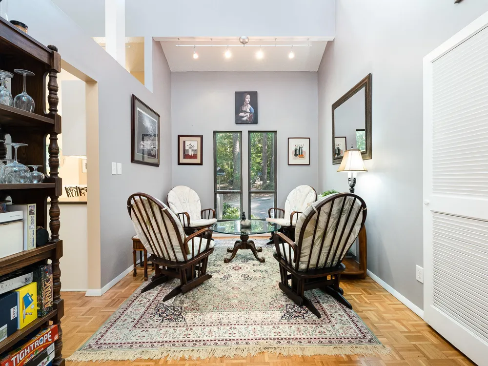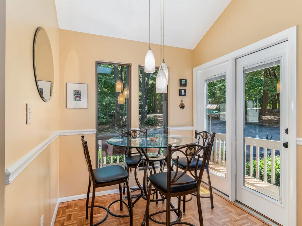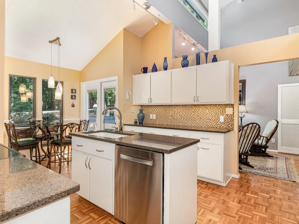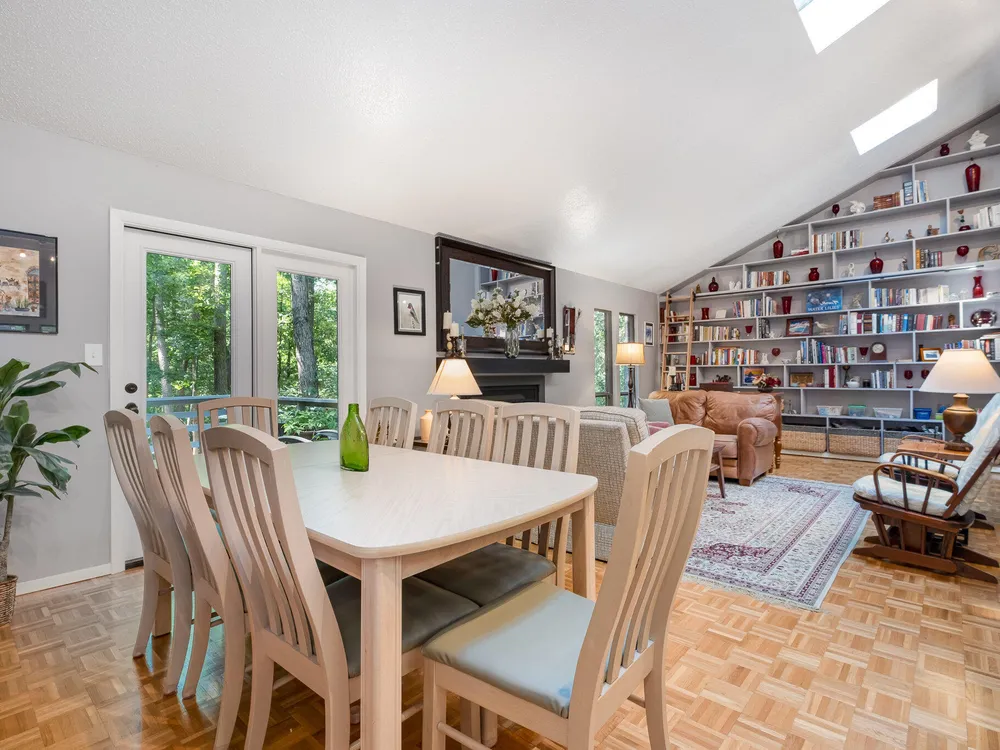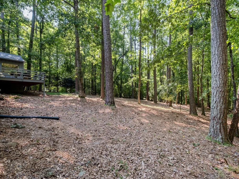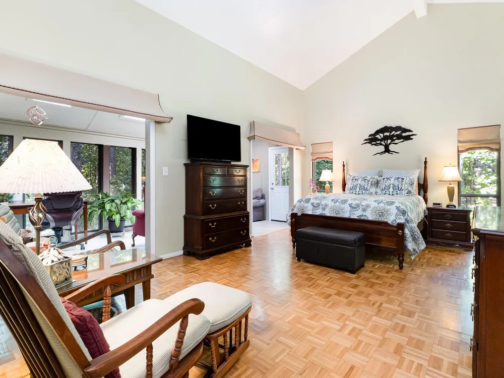 One-level contemporary home with a separate guest house/office/studio on a .9-acre lot in the ''historic district'' of Fearrington Village. This home blends into a wooded, natural setting and it has great privacy and views. Beautifully maintained and updated. The main house has an entry foyer, large living room with a wall of built-in shelving, fireplace, and vaulted ceiling with clerestory windows. The dining room can be at one end of the living room or in another space currently used as a sitting area adjacent to the kitchen. The kitchen features a well-organized pantry, an island, and a breakfast nook with a glass door that opens to the front deck. The primary bedroom suite is at one end of the house and includes a vaulted ceiling, private bath, walk-in closet, and a sunroom. The laundry room is conveniently located near the primary bedroom closet and provides a lot of storage space. The other two bedrooms and full bath are at the opposite end of the house. One of these bedrooms is quite large with room for a sitting area or study. There's a deck at the back of the house overlooking the woods. The separate guest house/office/studio has a full bath and a kitchenette. There is a walk-in area under the main house for storage and workshop space. Exterior storage closet for garden equipment. The main house has a 3-zone HVAC system, and the guest house has two mini-split HVAC units. Tankless water heater. Handicap accessible with cleverly placed ramps at the front entry deck and guest house.