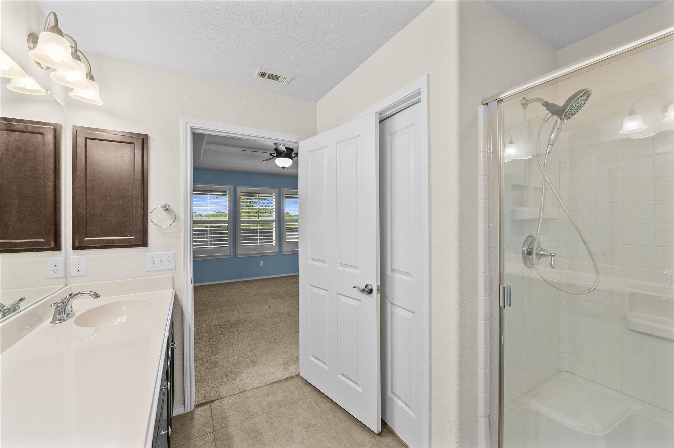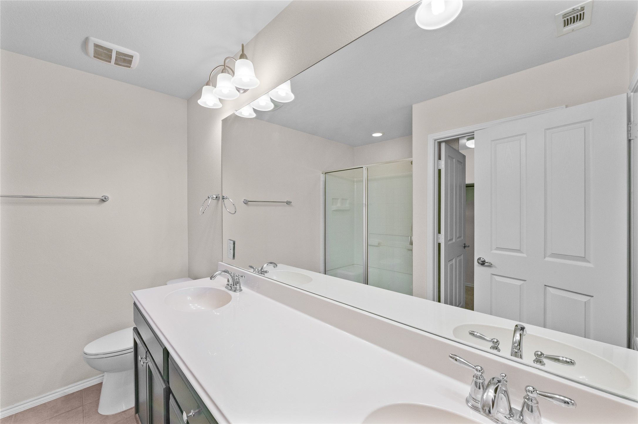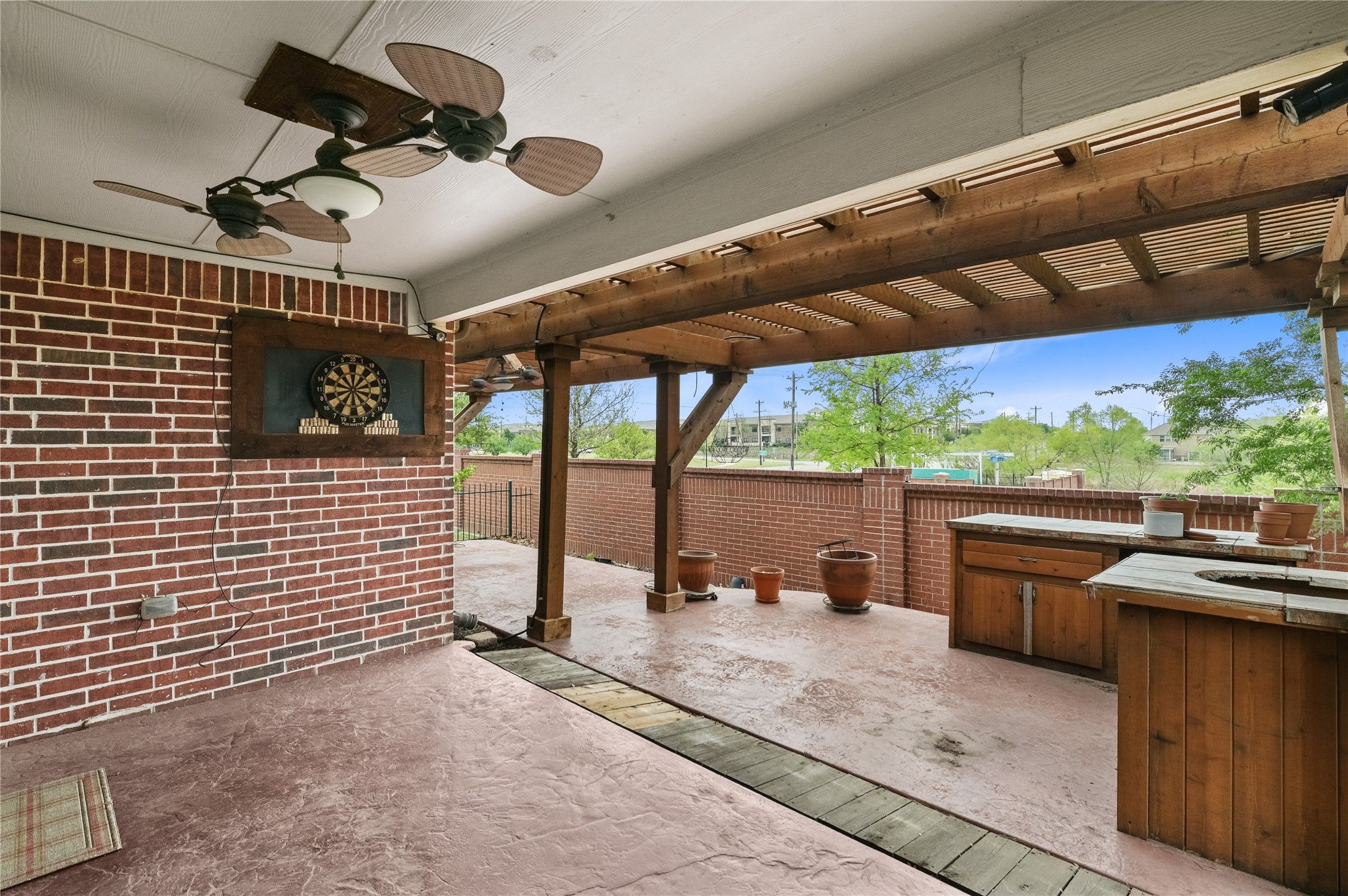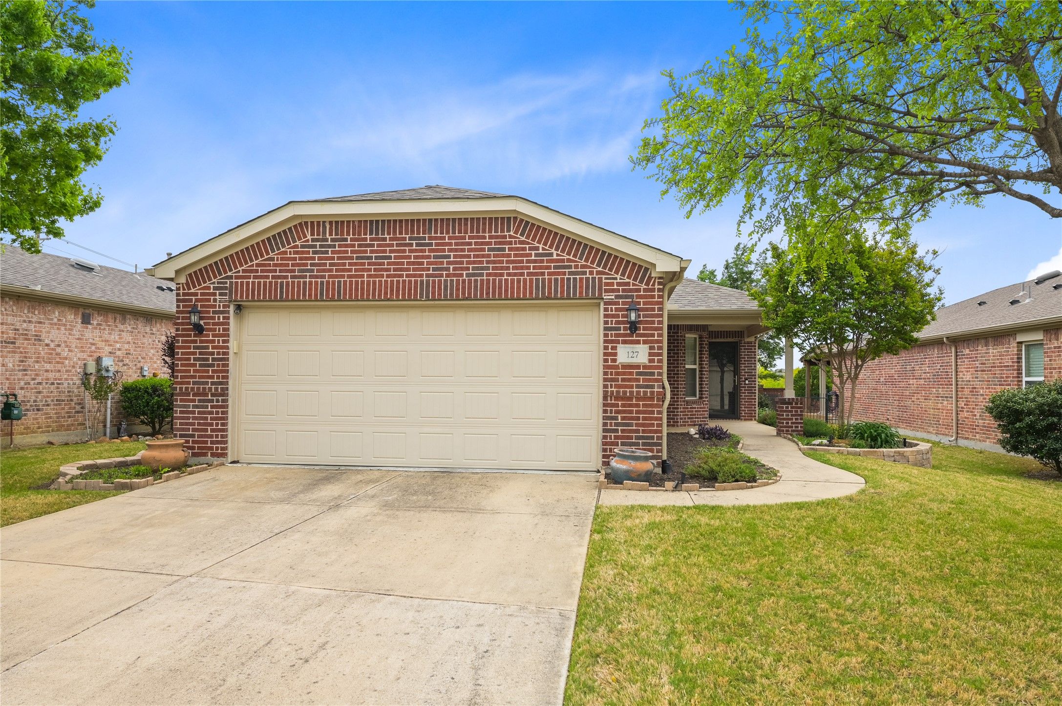 Charming 3-bedroom home in the popular 55+ Del Webb community in Frisco! This home backs to a beautiful greenbelt with mature trees and features an extended patio with pergola cover—perfect for relaxing outdoors. The open dining and living areas create a bright and spacious feel. The kitchen offers granite countertops and ample cabinet space. The primary suite is privately located at the back of the home and includes double sinks, a garden tub, and a separate shower. Secondary bedrooms are split for guest privacy. Additional features include tile flooring in wet areas, plantation shutters throughout, and an oversized garage with epoxy flooring. Refrigerator, washer, and dryer convey with the home. Frisco Lakes offers an exceptional active adult lifestyle with an 18-hole championship golf course, three clubhouses, fitness centers, indoor and outdoor pools, pickleball, tennis, bocce ball, walking trails, and a full calendar of social activities.