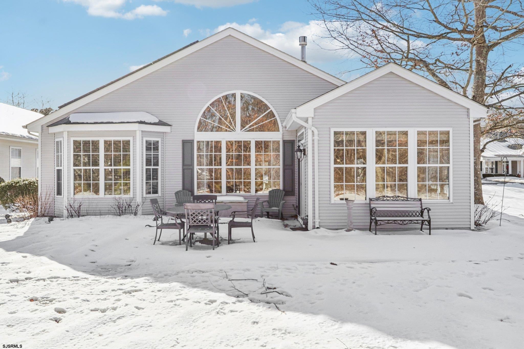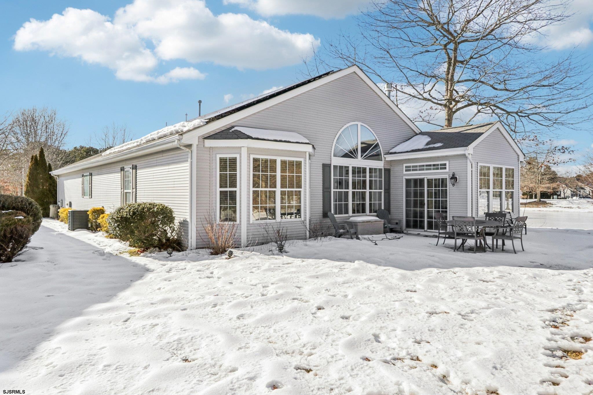 This is a one-of-a-kind home with a one-of-a-kind location; pond view and wood view lot, located at the end of the cul-de-sac! Exquisite open layout (Evergreen model) with amazing soaring cathedral ceilings and a huge Palladium/Sunburst window in the great room and 4 bay windows (one in each bedroom and one in the kitchen). There is a beautiful and desirable sunroom in the back with French doors to see and overlook the pond and wooded lot. Gorgeous kitchen with a 42” white cabinetry, Corian counters, and a pantry. This home offers new luxury vinyl flooring. Massive primary suite with his and hers closets with shelving/organization. Luxurious ensuite, consisting of double vanities, a large shower stall and a soaking tub with a stunning customized stained glass window above the tub. The other two bedrooms are located in the front area of the home for privacy. Fantastic natural light showers throughout this home. There is an oversized patio outback for outdoor entertaining with double-sided pavers. 24 highhats throughout the home. Large laundry room with washer and dryer. Two car garage with one double door and a much desired walk up attic for extra storage. Newer, HVAC and HWH (tankless) installed in 2020. Located in Devonshire Village, approximately 1 mile from The Four Seasons clubhouse. Solar panels for extra savings on utilities of $7/month on electric. Great landscaping with a stone raised planter in the front.