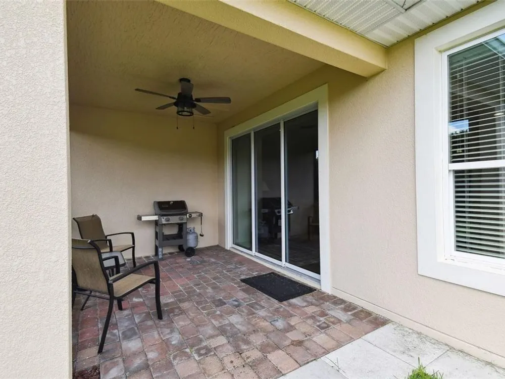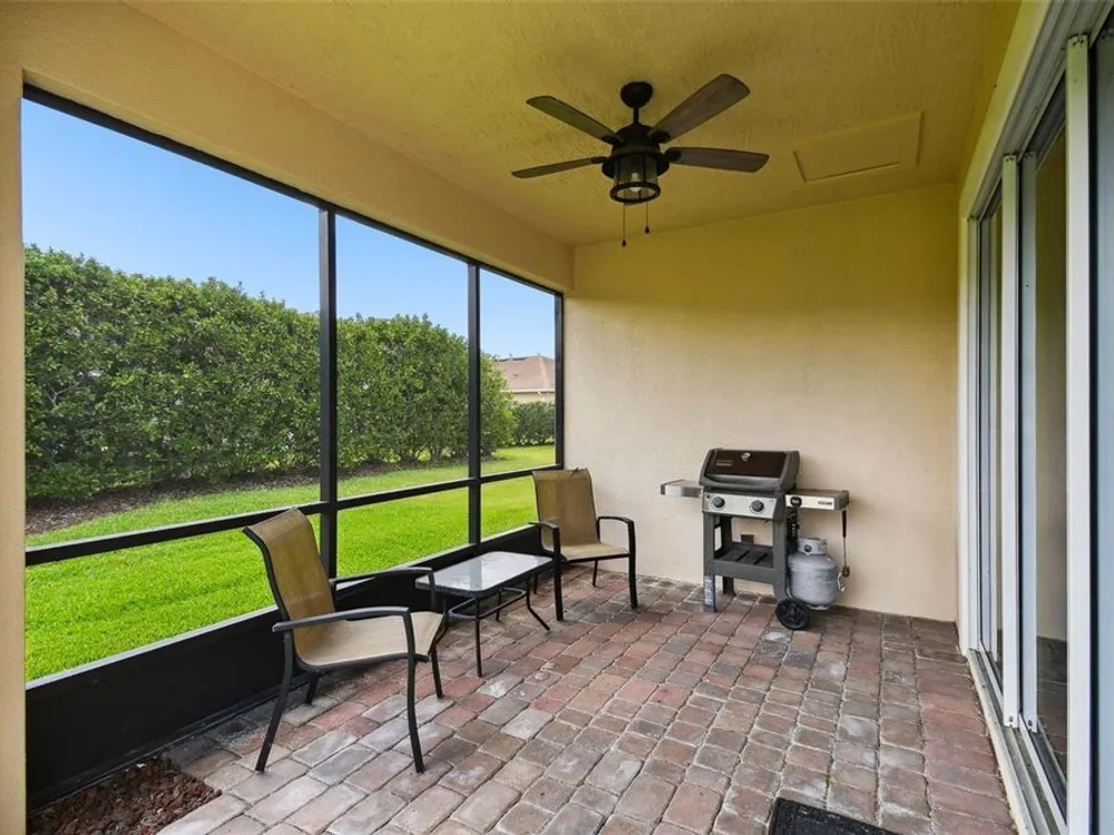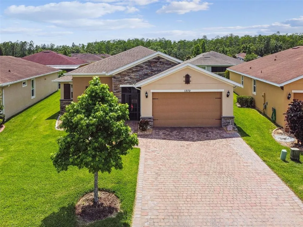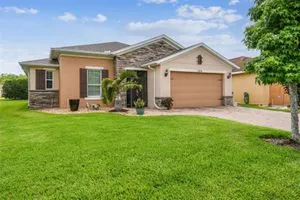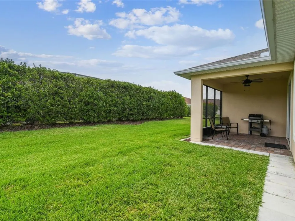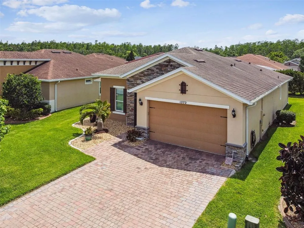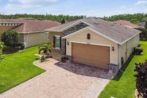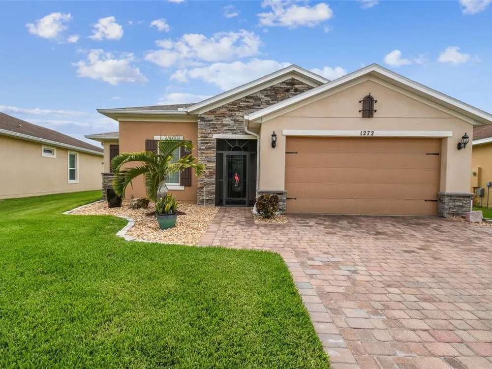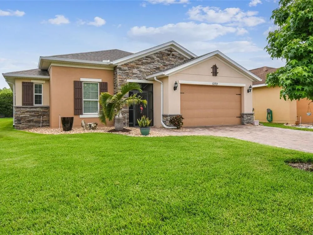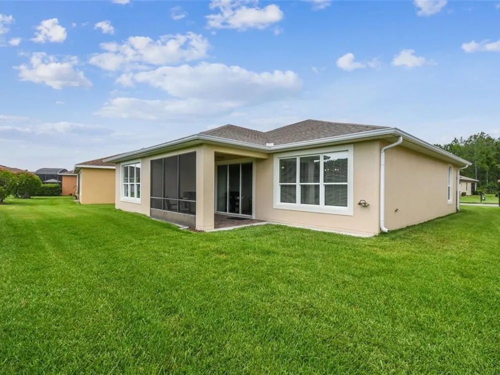 PRICE REDUCTION! Welcome to this beautifully maintained Cabella model, a 2-bedroom, 2-bathroom home that offers comfort, style, and thoughtful upgrades throughout. Located just moments from the Palms Resort Amenities Center, this home combines modern convenience with luxurious touches in a tranquil setting. The exterior of the home features a striking stone façade and upgraded landscaping, creating a warm and welcoming first impression. Entering through the screened front porch into the entryway you will notice the leaded glass door that adds an elegant touch to the entrance. Step inside to the spacious open-concept living and dining area, where wood-look luxury vinyl flooring and beautiful accent walls enhance the home’s modern charm. The seamless layout flows effortlessly, making it ideal for both entertaining and everyday living. The chef’s kitchen is a standout feature, designed with both style and functionality in mind. It boasts an eat-at bar, and custom cabinetry that provides extra storage to keep everything organized. Whether you're preparing a quick meal or hosting a dinner party, this kitchen is perfectly equipped to meet your needs. The primary bedroom is a private retreat, featuring brand-new carpet for added comfort. The en-suite bathroom offers dual sinks, an oversized walk-in shower with a built-in seat, and an extra-large walk-in closet, providing plenty of storage and a spa-like atmosphere to unwind. The split floor plan ensures privacy for both you and your guests. The special extra-large guest suite includes a dedicated sitting area and its own en-suite bathroom, making it a welcoming space for family or visitors. The screened and covered lanai is perfect for enjoying Florida’s beautiful weather in comfort. The spacious backyard provides plenty of room to add a pool or create a large fenced area for your furry family members, offering endless possibilities for outdoor living and entertainment. The laundry room is designed for convenience, featuring custom cabinets and a sink to make household tasks a breeze. The 2-car extended garage offers plenty of space for vehicles and storage, ensuring everything has its place, with an extra wide driveway. The home’s HVAC system, replaced in 2020, ensures reliable and efficient climate control year-round. This home has been meticulously maintained, making it move-in ready for its next owner. Solivita is known for its vibrant 55+ community, offering an abundance of activities and amenities for active adults. Whether you’re enjoying a round of golf, engaging in fitness classes, or simply strolling along scenic walking paths, this neighborhood promotes an active and fulfilling lifestyle with over 200 clubs, sports, and activities. Enjoy the community’s clubhouse, softball field, 14 swimming pools, an indoor walking track, and much more. Every day offers something new to explore and enjoy! This home also features easy access to nearby shops, dining, and health care, offering the perfect balance of convenience and privacy. Whether you’re relaxing at home or exploring the vibrant community, this home offers the perfect balance of privacy and lifestyle.