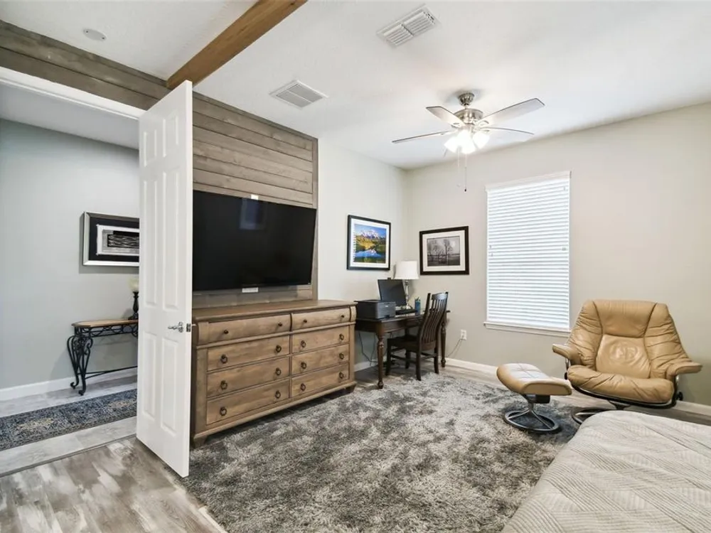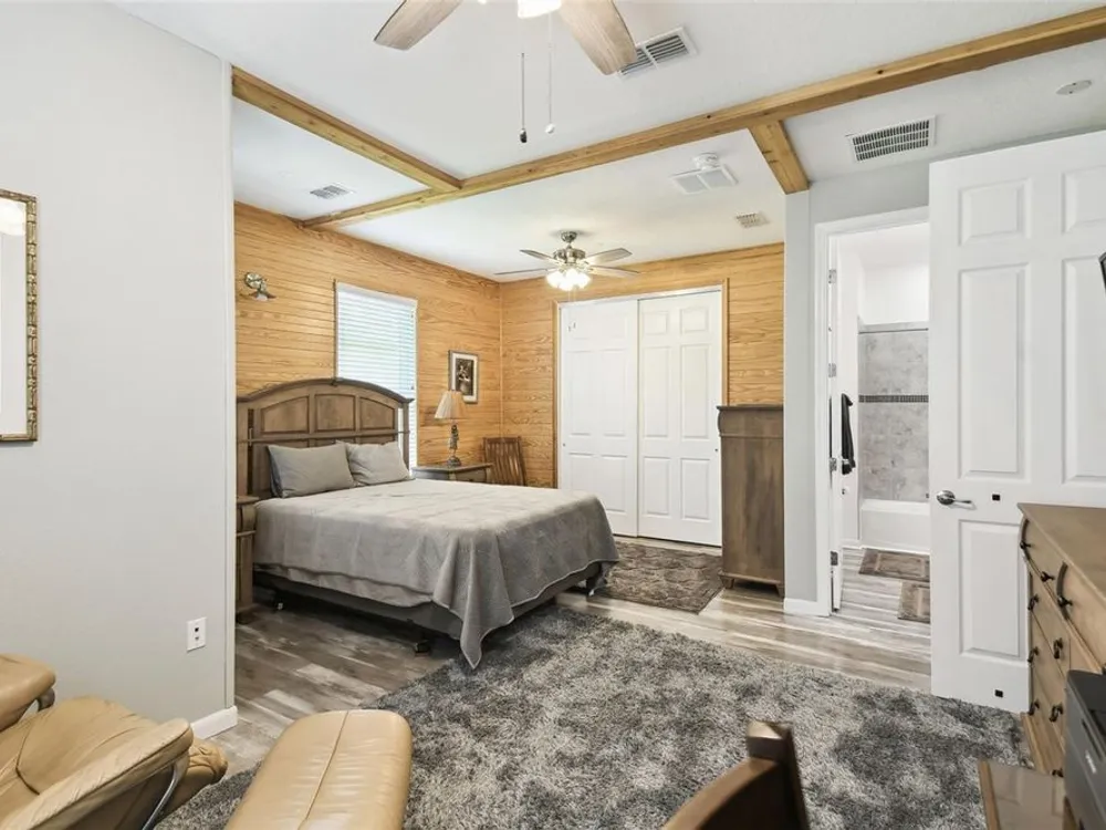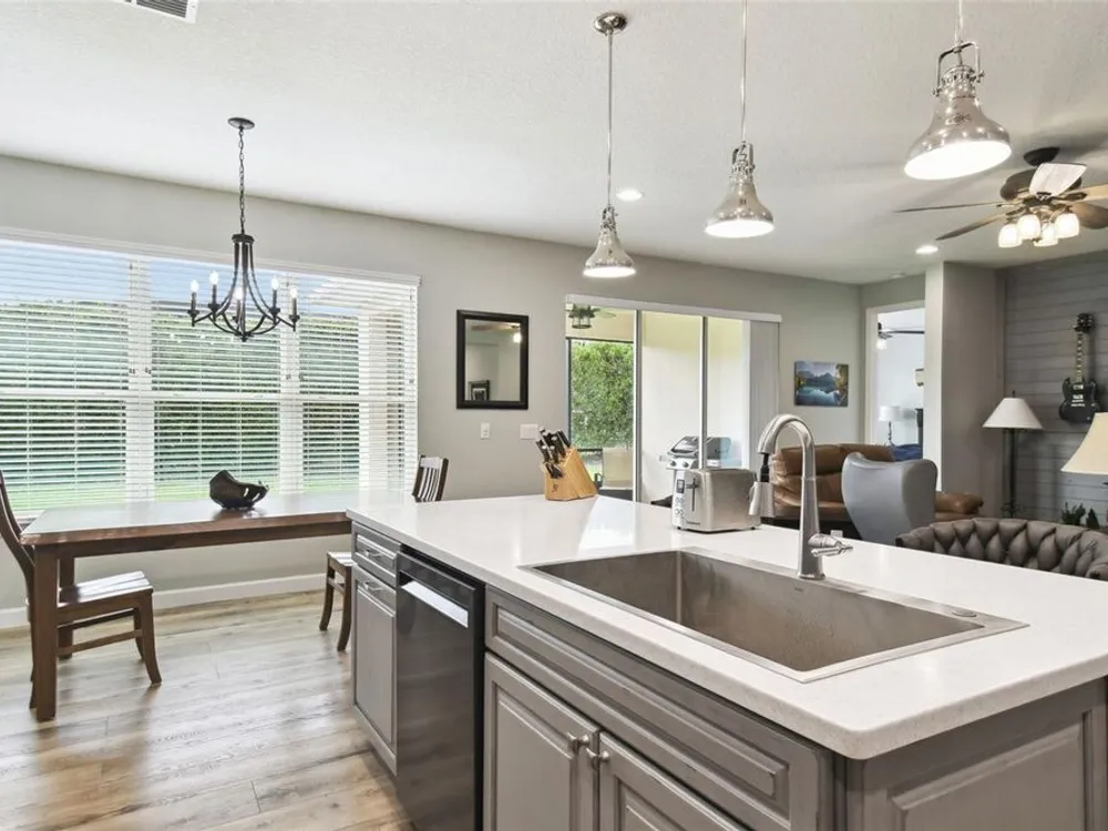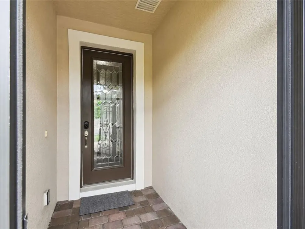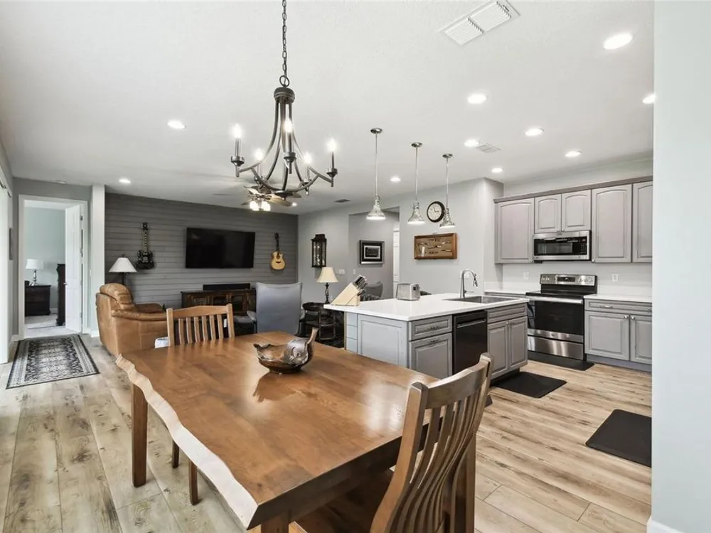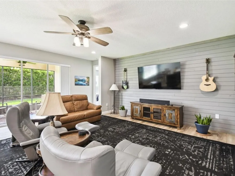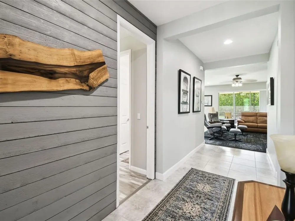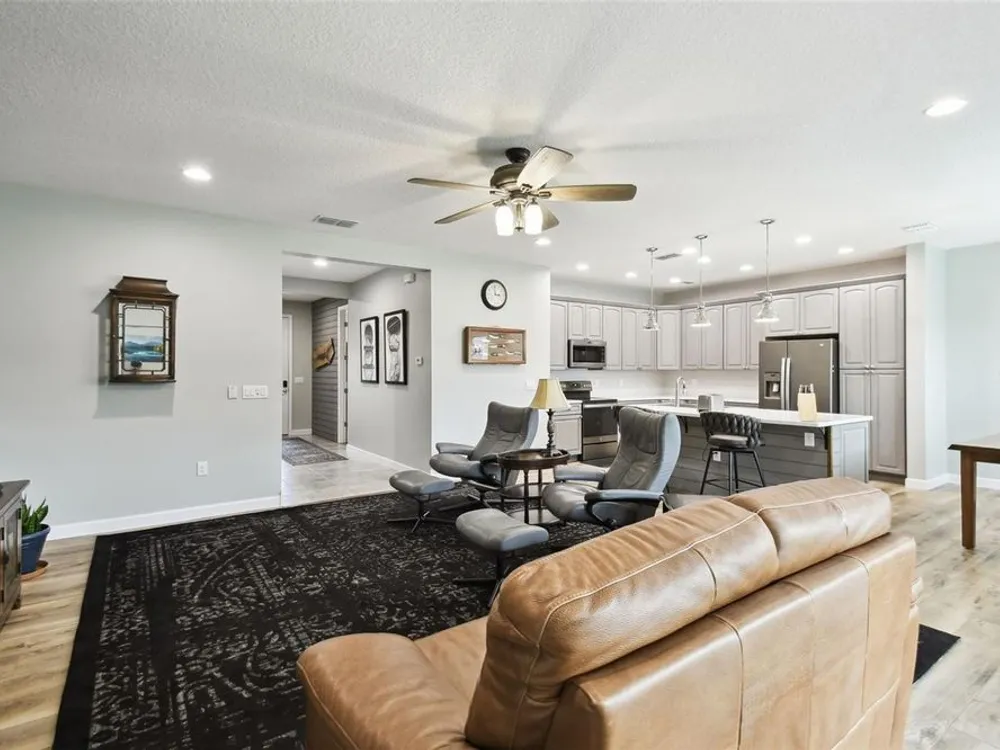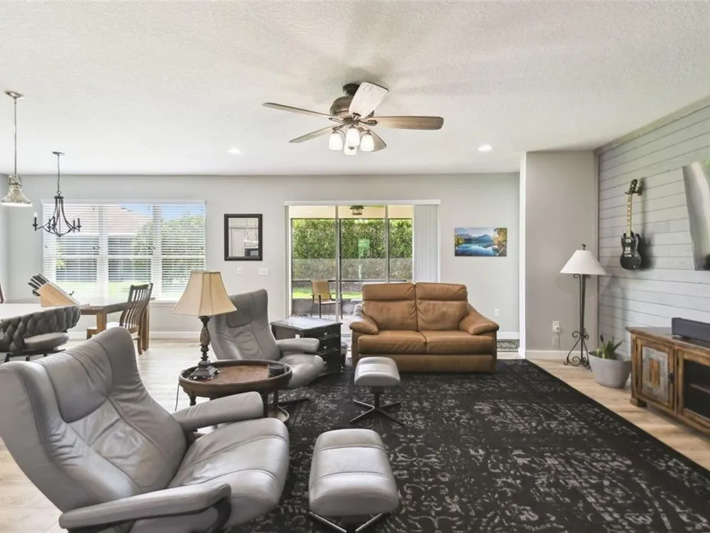 PRICE REDUCTION! Welcome to this beautifully maintained Cabella model, a 2-bedroom, 2-bathroom home that offers comfort, style, and thoughtful upgrades throughout. Located just moments from the Palms Resort Amenities Center, this home combines modern convenience with luxurious touches in a tranquil setting. The exterior of the home features a striking stone façade and upgraded landscaping, creating a warm and welcoming first impression. Entering through the screened front porch into the entryway you will notice the leaded glass door that adds an elegant touch to the entrance. Step inside to the spacious open-concept living and dining area, where wood-look luxury vinyl flooring and beautiful accent walls enhance the home’s modern charm. The seamless layout flows effortlessly, making it ideal for both entertaining and everyday living. The chef’s kitchen is a standout feature, designed with both style and functionality in mind. It boasts an eat-at bar, and custom cabinetry that provides extra storage to keep everything organized. Whether you're preparing a quick meal or hosting a dinner party, this kitchen is perfectly equipped to meet your needs. The primary bedroom is a private retreat, featuring brand-new carpet for added comfort. The en-suite bathroom offers dual sinks, an oversized walk-in shower with a built-in seat, and an extra-large walk-in closet, providing plenty of storage and a spa-like atmosphere to unwind. The split floor plan ensures privacy for both you and your guests. The special extra-large guest suite includes a dedicated sitting area and its own en-suite bathroom, making it a welcoming space for family or visitors. The screened and covered lanai is perfect for enjoying Florida’s beautiful weather in comfort. The spacious backyard provides plenty of room to add a pool or create a large fenced area for your furry family members, offering endless possibilities for outdoor living and entertainment. The laundry room is designed for convenience, featuring custom cabinets and a sink to make household tasks a breeze. The 2-car extended garage offers plenty of space for vehicles and storage, ensuring everything has its place, with an extra wide driveway. The home’s HVAC system, replaced in 2020, ensures reliable and efficient climate control year-round. This home has been meticulously maintained, making it move-in ready for its next owner. Solivita is known for its vibrant 55+ community, offering an abundance of activities and amenities for active adults. Whether you’re enjoying a round of golf, engaging in fitness classes, or simply strolling along scenic walking paths, this neighborhood promotes an active and fulfilling lifestyle with over 200 clubs, sports, and activities. Enjoy the community’s clubhouse, softball field, 14 swimming pools, an indoor walking track, and much more. Every day offers something new to explore and enjoy! This home also features easy access to nearby shops, dining, and health care, offering the perfect balance of convenience and privacy. Whether you’re relaxing at home or exploring the vibrant community, this home offers the perfect balance of privacy and lifestyle.
