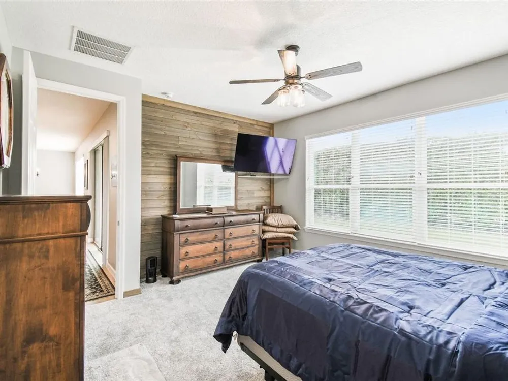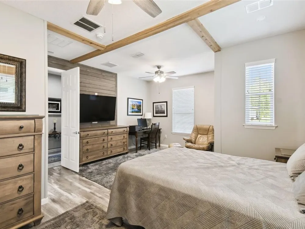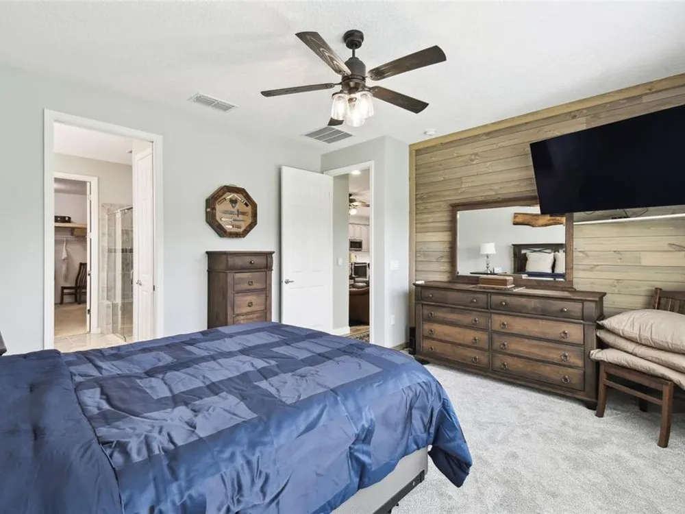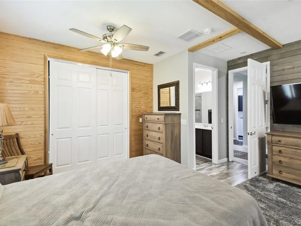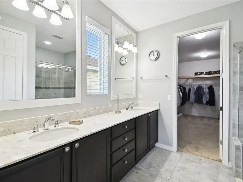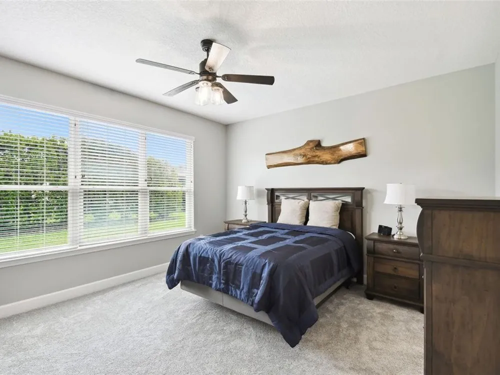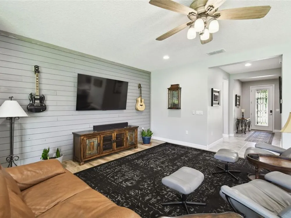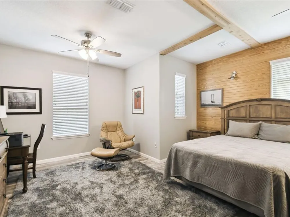 PRICE REDUCTION! Welcome to this beautifully maintained Cabella model, a 2-bedroom, 2-bathroom home that offers comfort, style, and thoughtful upgrades throughout. Located just moments from the Palms Resort Amenities Center, this home combines modern convenience with luxurious touches in a tranquil setting. The exterior of the home features a striking stone façade and upgraded landscaping, creating a warm and welcoming first impression. Entering through the screened front porch into the entryway you will notice the leaded glass door that adds an elegant touch to the entrance. Step inside to the spacious open-concept living and dining area, where wood-look luxury vinyl flooring and beautiful accent walls enhance the home’s modern charm. The seamless layout flows effortlessly, making it ideal for both entertaining and everyday living. The chef’s kitchen is a standout feature, designed with both style and functionality in mind. It boasts an eat-at bar, and custom cabinetry that provides extra storage to keep everything organized. Whether you're preparing a quick meal or hosting a dinner party, this kitchen is perfectly equipped to meet your needs. The primary bedroom is a private retreat, featuring brand-new carpet for added comfort. The en-suite bathroom offers dual sinks, an oversized walk-in shower with a built-in seat, and an extra-large walk-in closet, providing plenty of storage and a spa-like atmosphere to unwind. The split floor plan ensures privacy for both you and your guests. The special extra-large guest suite includes a dedicated sitting area and its own en-suite bathroom, making it a welcoming space for family or visitors. The screened and covered lanai is perfect for enjoying Florida’s beautiful weather in comfort. The spacious backyard provides plenty of room to add a pool or create a large fenced area for your furry family members, offering endless possibilities for outdoor living and entertainment. The laundry room is designed for convenience, featuring custom cabinets and a sink to make household tasks a breeze. The 2-car extended garage offers plenty of space for vehicles and storage, ensuring everything has its place, with an extra wide driveway. The home’s HVAC system, replaced in 2020, ensures reliable and efficient climate control year-round. This home has been meticulously maintained, making it move-in ready for its next owner. Solivita is known for its vibrant 55+ community, offering an abundance of activities and amenities for active adults. Whether you’re enjoying a round of golf, engaging in fitness classes, or simply strolling along scenic walking paths, this neighborhood promotes an active and fulfilling lifestyle with over 200 clubs, sports, and activities. Enjoy the community’s clubhouse, softball field, 14 swimming pools, an indoor walking track, and much more. Every day offers something new to explore and enjoy! This home also features easy access to nearby shops, dining, and health care, offering the perfect balance of convenience and privacy. Whether you’re relaxing at home or exploring the vibrant community, this home offers the perfect balance of privacy and lifestyle.