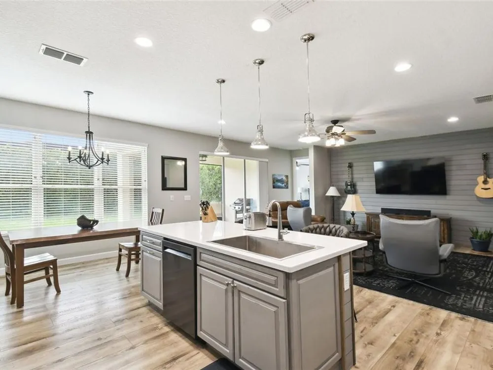 Reimagined CABELLA model built in 2016 in the Volare subdivision of Solivita. SPOTLESS & WELL MAINTAINED. UPGRADES include: 8' doors, 5 1/2" baseboards and DOUBLE PANE WINDOWS with blinds throughout. Heat Pump/Air Compressor new in 2020. 6' X 9" LUXURY VINYL PLANK floors in the Great Room, Dining Room & Kitchen, Upgraded carpet in Primary Bedroom. Redesigned HUGE 2nd Bedroom has Pergo Laminate floors. 18" CERAMIC TILE in Foyer, Bathrooms & Laundry Room. Wood panel ACCENT WALLS throughout the house in the foyer, bedrooms and Great room. ARCHITECTURAL STONE accents on the front of the home with stones in the flower beds paver borders. Front Entryway is screened and the Front Door has a LEADED GLASS INSERT. Kitchen features CORIAN counters, a single bowl deep stainless steel sink, Gooseneck Faucet, STAINLESS STEEL APPLIANCES including a GE SLATE Fingerprint Resistant refrigerator, RECESSED & PENDANT lights, CUSTOM Gray cabinets new in 2021 with SOFT CLOSE doors & drawers, Lazy Susan organizers in the lower & upper cabinets, pull out drawers in the lower cabinets and 42" upper cabinets with crown molding and a custom pantry. Primary Bedroom has newer plush carpet. The bathroom features QUARTZ counters, DUAL SINKS, wood-framed mirrors, a walk-in shower with bench and SEAMLESS, THICKER GLASS enclosure and tile walls with Listello accents. There also is a SUPERSIZED WALK IN CLOSET with shelves and a cedar wall panel. Second Bedroom was redesigned to incorporate the den creating a true suite with an ensuite bathroom. The room has a sitting area. Laundry Room includes a washer & dryer, sink and built in cabinets. BIG PLUS: Garage is EXTENDED 4 FEET and includes shelving & cabinet, a MyQ garage door motor and a whole house surge suppressor. Lanai is partially screened and covered. Backyard has tall shrubbery for privacy. Make this your home today! **See the FULL LENGTH VIDEO on Tour Link 1.** ***Solivita is an active adult 55+ community located in Kissimmee, Florida. It is approximately 50 minutes from Disney World & the Orlando International Airport. Solivita has a total of 5,470 homes. Approximately 10,000 - 11,000 people live in Solivita during the winter while approximately 7,500 live in Solivita during the summer. Enjoy your active years in this piece of paradise. Solivita's amenities include: - a manicured SOFTBALL diamond & field - 36 holes of CHAMPIONSHIP GOLF that can be played by joining the Stonegate Golf Club or paying as you go - 2 STATE of the Art AMENITY centers with updated exercise equipment, yoga studio & meeting rooms - 3 restaurants - 14 HEATED POOLS - 17 PICKLEBALL courts - 9 TENNIS courts - 4 BOCCE BALL courts - 4 SHUFFLEBOARD courts - 3 HORSESHOE pits - a BILLIARDS room - miles of bike paths - 2 DOG PARKS (Small & Large Dogs) - Corn Hole - Tot Lot PLAYGROUND - COMMUNITY GARDEN - over 250 resident clubs. The HOA: - maintains the LANDSCAPING & IRRIGATION systems in the common areas as well as at individual homesites. PROVIDES SECURITY with gate guards and mobile patrols including the Polk County Sheriff - allows AUTOMATED GATE ACCESS. Fiber Optic Internet & TV service provided.***Poinciana Lakes Plaza is a MAJOR NEW SHOPPING CENTER that directly across from the Solivita Main Gate. It features Sprouts Grocery, TJ MAXX, Ross, Burlington, Rack Room Shoes, 5 Below, Ulta, Outback, First Watch, 5 Guys, Urgent Care, Papa Johns, Panda Express, Cold Stone Creamery, Dentist, TD Bank, Petco & Hair Cuttery PLUS MORE TO COME.***