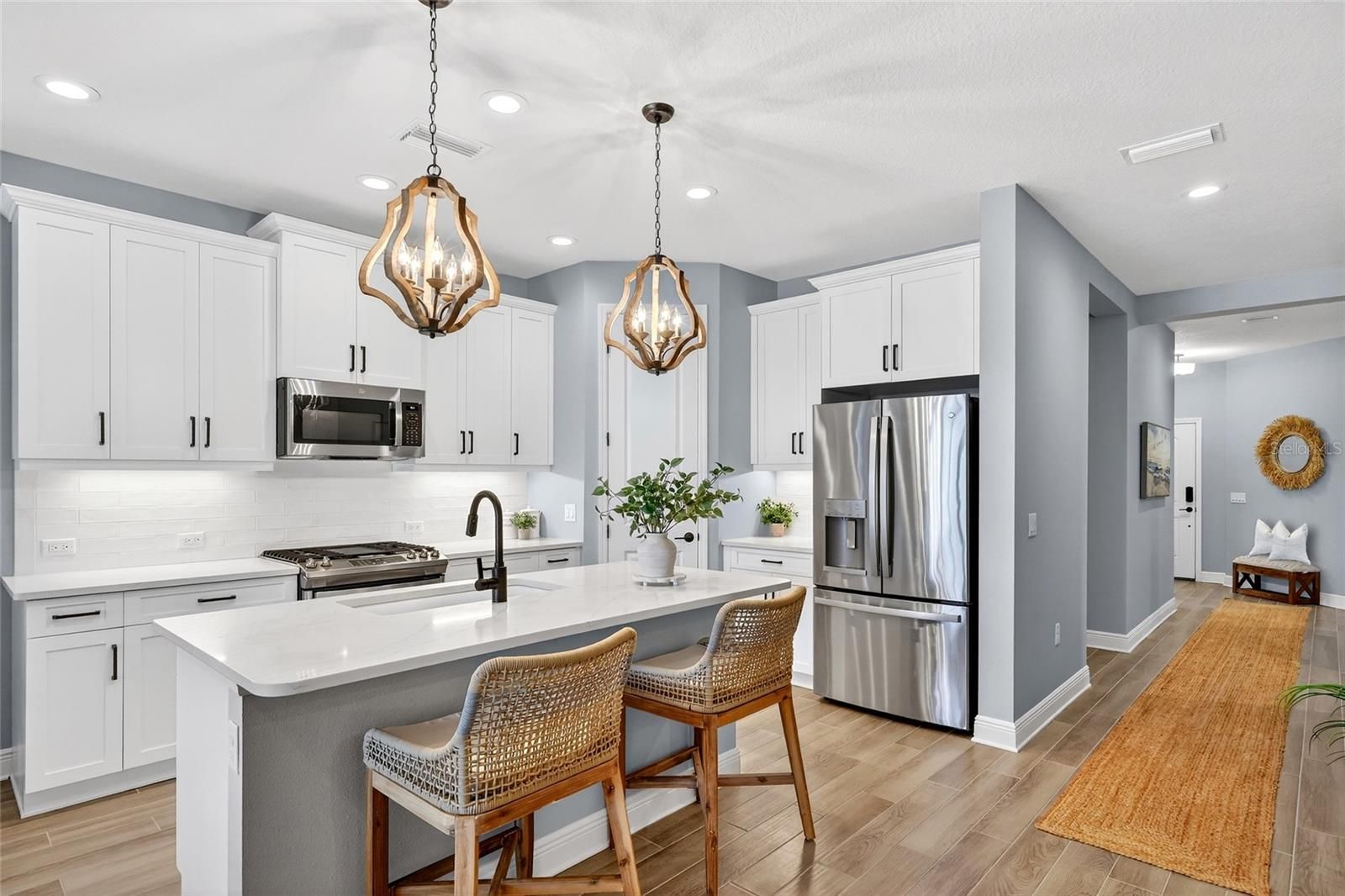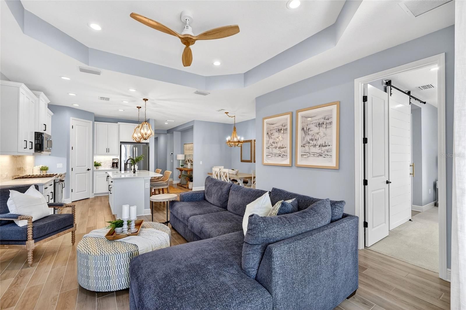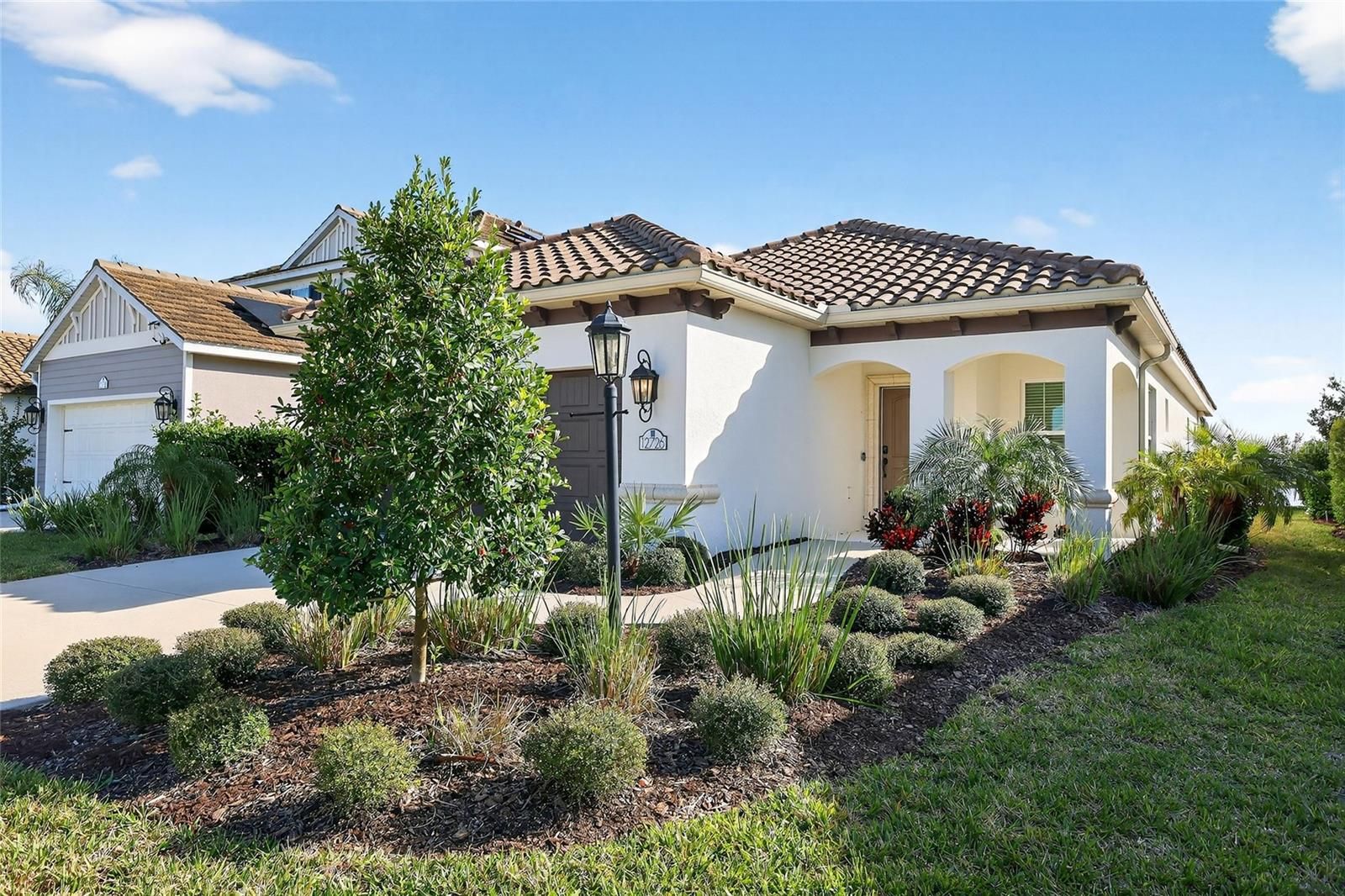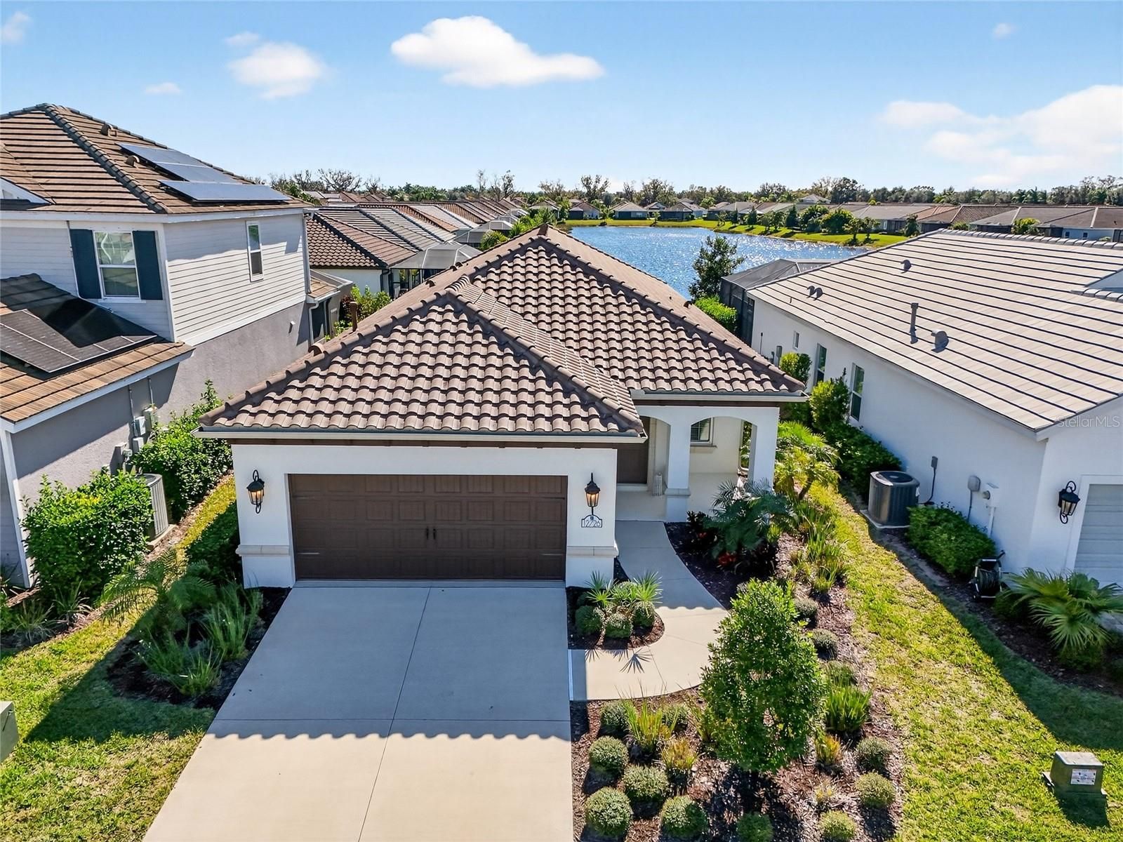 This 3-bedroom, 2-bath home with a den offers a pool, a water view, and standout storm protection with impact windows and doors plus automated hurricane screens on the covered lanai. Enjoy an easy indoor-outdoor layout with a pocket sliding door that opens wide to the lanai and view. The kitchen is finished with quartz countertops, stainless appliances, an island, a single-basin undermount sink, upgraded pendants and chandelier, and a custom pantry. Inside, wood-look tile flooring pairs with tray ceiling detail, quartz countertops throughout, and upgraded carpet in the bedrooms. The primary suite includes a barn door and a custom walk-in closet. Comfort and efficiency upgrades include a smart thermostat, UV light in the furnace, and spray foam insulation. Outdoors, the pavered lanai is set up for an outdoor kitchen with pre-plumb, complemented by the pool and water view, plus a Google Nest doorbell. The laundry room includes added cabinetry, and the garage features epoxy floors. HOA COVERS: Lawn care, Swimming Pool and Spa, Fitness Center, Clubhouse with Catering Kitchen, PickleBall, Bocce Ball, Manager, Onsite Activities Director, Security Gates. LOCATION: Centrally located. Just outside the gates are A+ schools, Gullett Elementary, Lakewood Ranch High School, and Mona Jain Middle School, LECOM, & Manatee Tech East Campus. Minutes to shopping, restaurants, gyms, salons, bars, etc. Minutes to downtown, Sarasota International Airport, the top rated beaches in the country, UTC Shopping.
