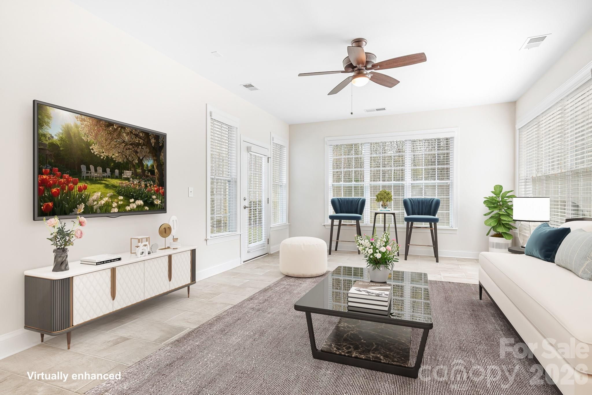 A private retreat wrapped in warmth, light, and wooded serenity—perfectly positioned in the heart of “downtown” Baileys Glen, just moments from the clubhouse, the true heartbeat of this vibrant 55+ community. This charming brick-front home welcomes you with a rocking chair front porch and an inviting entry, where an expansive foyer and soft natural light from solar tubes create an immediate sense of warmth. Inside, hardwood floors flow through the main living areas, complemented by ceiling fans throughout and a cozy gas fireplace that anchors the space. The kitchen blends style and function with an island perfect for entertaining or casual dining, granite countertops, a neutral subway tile backsplash, stainless steel appliances, and a built-in writing desk. The breakfast nook is perfectly positioned to take in peaceful wooded views, while a stunning wall of windows extends from the kitchen toward the primary suite—bringing the beauty of the outdoors into everyday living. At the heart of the home, the expanded sunroom is a standout feature with tile flooring and glass French doors, offering a light-filled retreat that feels like a private escape. Whether hosting friends or enjoying a quiet morning coffee, this space seamlessly connects indoor comfort with the natural beauty beyond. Step outside to a serene backyard oasis on one of the community’s premier lots, where a manicured lawn is framed by mature trees and wooded privacy—an ideal setting for relaxing evenings, entertaining, or simply unwinding in your own peaceful retreat. The spacious primary suite is a sanctuary of its own, featuring a full wall of windows, dual walk-in closets with a laundry chute, and a spa-inspired ensuite with dual sinks, a walk-in shower with seating and grab bar, and exceptional storage. Two additional bedrooms, a full guest bath, and a flexible bonus space provide room for guests, hobbies, or a home office. Designed with intention, the home offers 12 customized closets and pantries, along with a laundry room featuring extra storage. Additional highlights include an in-ground irrigation system and a whole-house hot water recirculating system for added efficiency and convenience. A beautifully appointed home where thoughtful design, luxury touches, and a peaceful, private setting come together seamlessly.