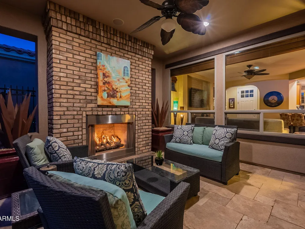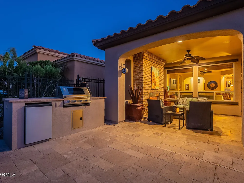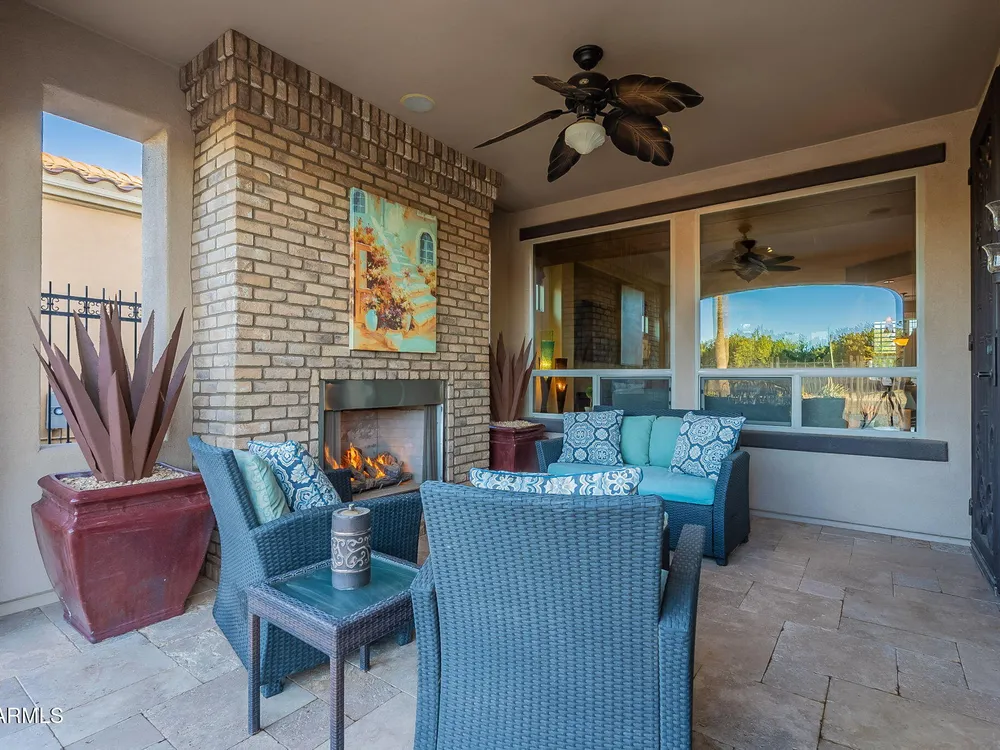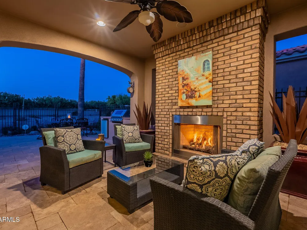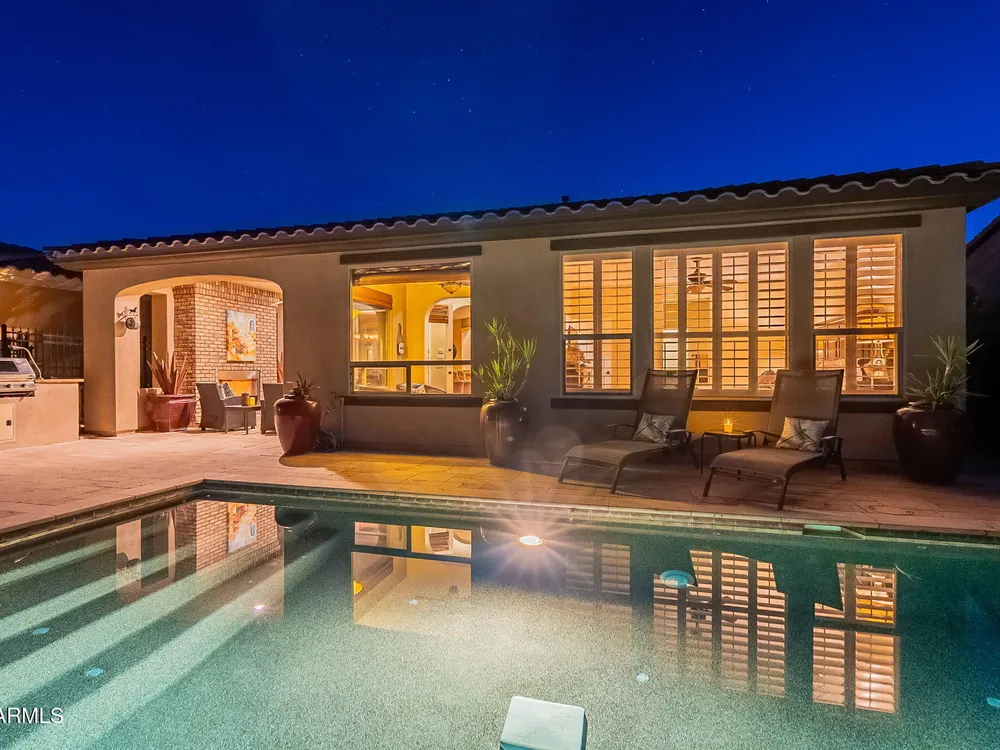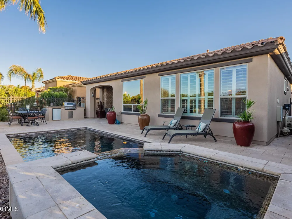This rare cul-de-sac and view lot Monaco Floorplan home in Encanterra offers an exceptional opportunity for privacy and resort-style living. Situated on a premium lot with no direct neighbors behind, the fenced backyard is a true retreat, featuring a heated pool and spa, travertine decking, built-in BBQ, and a cozy patio with a gas fireplace. Step through the inviting front courtyard into an open-concept layout designed for both comfort and functionality. The charming kitchen, highlighted by bay windows, includes a breakfast nook, island, and built-in beverage fridge. The generous primary suite boasts an ensuite bath and a spacious walk-in closet. A versatile den off the main living area offers views of the backyard and adjacent park. Don't miss your chance to own this special home!