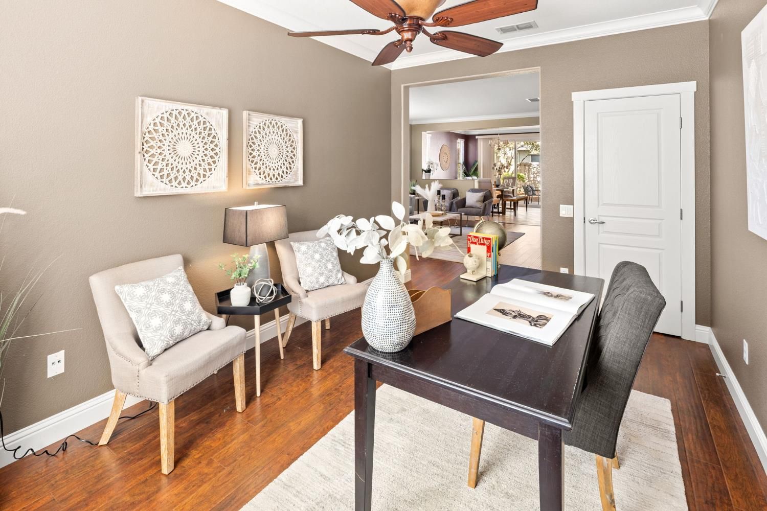 2 bedroom 2 bath Trinity Floorplan with a spacious possible third bedroom/den space. The Trinity is one of the few homes with a large picture window over the kitchen sink looking out toward the backyard, immersing your workspace in natural light! Seller just updated the front and back yards and rebarked! Beautiful cherrywood style engineered flooring with tile entry and tile in wet areas. Newish carpeting in the Main bedroom. Kitchen has tile counters, oak cabinetry, and stainless appliances with a large stainless fridge included. One eating area for formal and casual dining which gives way for other rooms to be spacious. Great orientation on the lot so you can enjoy and every season! This is a must see!