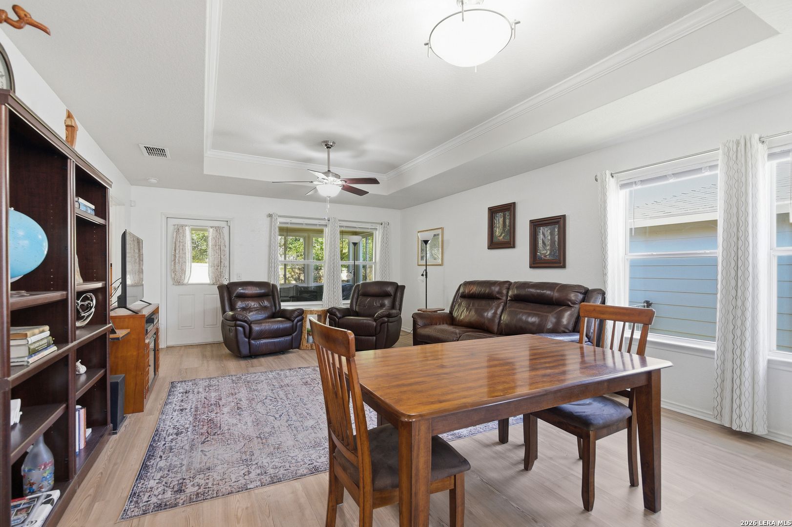 Welcome to Hill Country Retreat, a vibrant 55+ Del Webb community! This thoughtfully designed home features 2BR/2BTH and an additional flex-space currently used as a home office. The open layout is perfect for both relaxing and entertaining, with a spacious living area, a modern kitchen with breakfast nook, gas cooking, granite countertops, and new SS dishwasher. Peaceful primary suite with a walk-in closet and en-suite bath, no carpet throughout! Enjoy your morning coffee in the screened sunroom, or watched the evening sunset on the flagstone patio on greenbelt lot. Roof under 3 years old. Resort-style amenities include a clubhouse, fitness center, indoor and outdoor pools, pickleball and tennis courts, walking trails, and a full calendar of social activities and events. This community offers the perfect balance of comfort, connection, and convenience. Located near shopping, dining, healthcare, and major highways, this home offers everything you need to live your best life!
