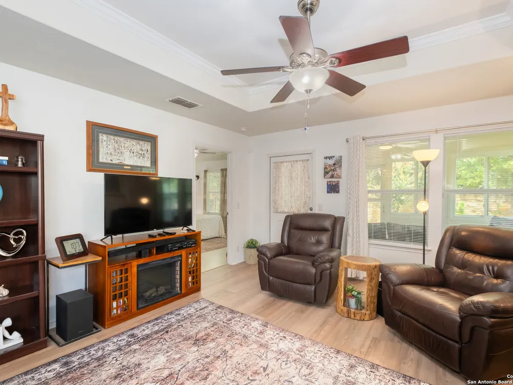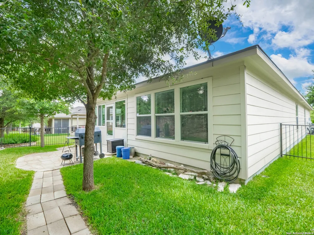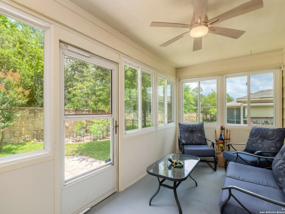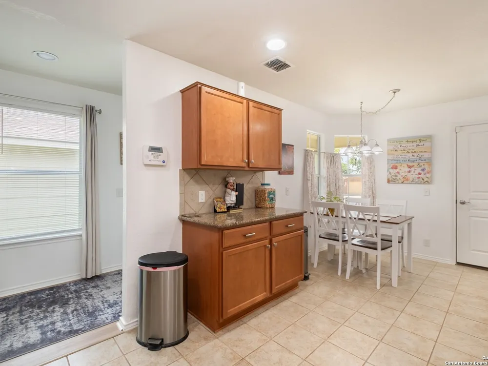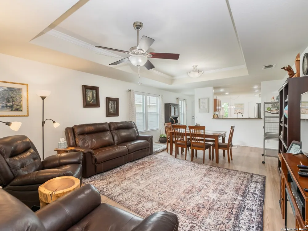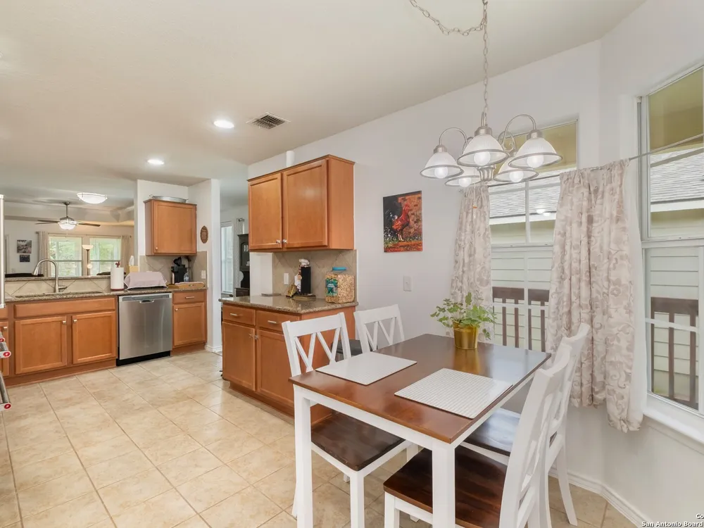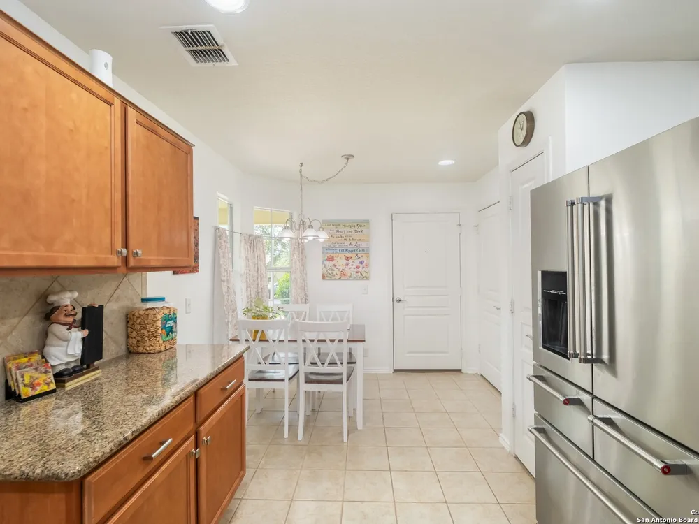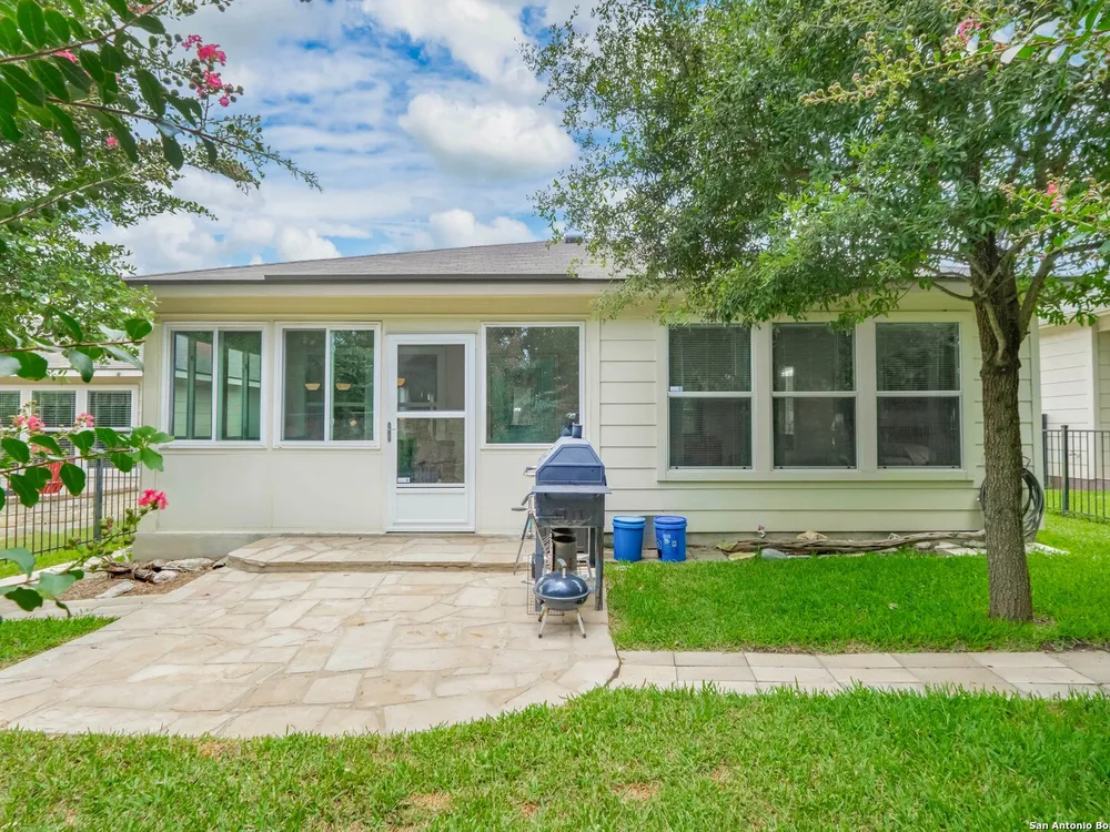Beautiful Hill Country Retreat home located in the highly desirable Alamo Ranch area. This well-maintained 2-bedroom, 2-bath residence offers 1,393 square feet of living space on a 0.11-acre lot with a 2-car attached garage. Inside, the home features an open floor plan with two living areas, including a flexible family room currently used as both an office and a sitting area. The main living room includes a tray ceiling, and the entire home has tile flooring throughout. The kitchen is outfitted with granite countertops, a breakfast nook, and a pantry, creating a functional and inviting space for everyday living. The owners suite also showcases a tray ceiling and includes a walk-in closet and an ensuite bath with a walk-in shower and dual vanity. Outdoor features include a covered lanai, a patio slab, and a fully landscaped yard with a sprinkler system front and back. With no rear neighbor due to a dedicated easement, you can enjoy added privacy and peaceful surroundings. Residents of this gated 55+ community enjoy a resort-style amenity center featuring two outdoor pools, one indoor pool, a ballroom, meeting rooms, and scenic walking trails. Whether you're looking for comfort, convenience, or a vibrant social lifestyle, this home and community offer it all.