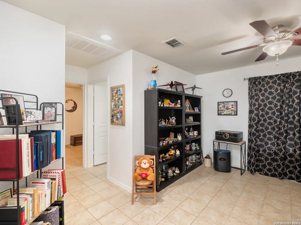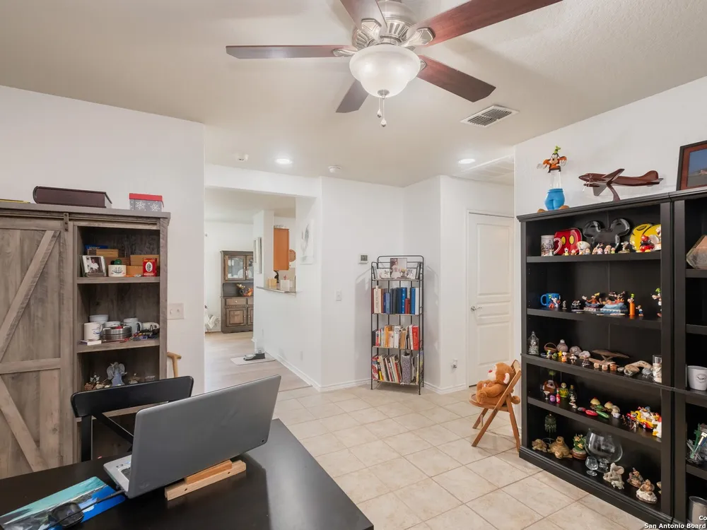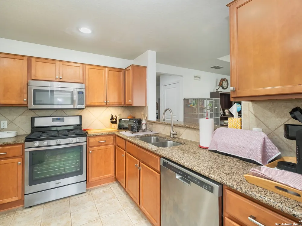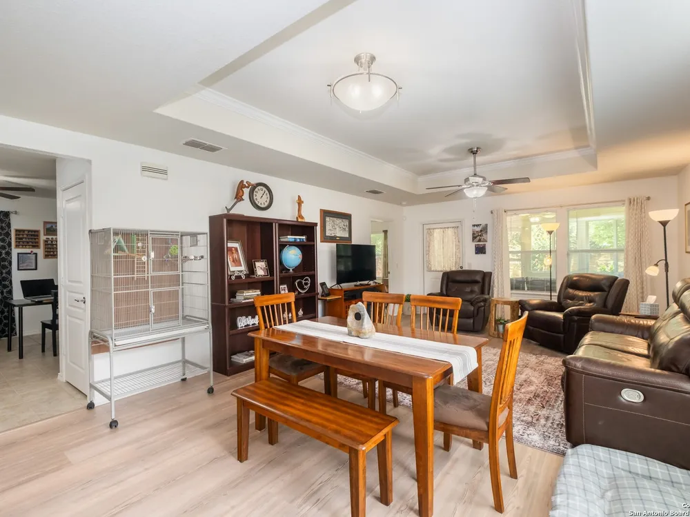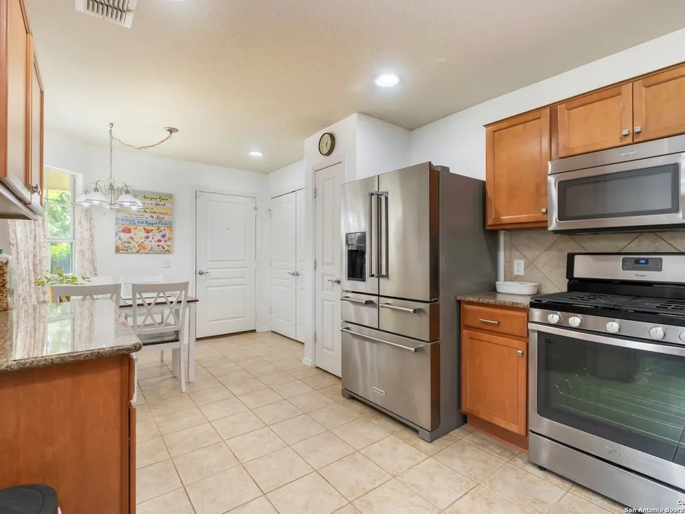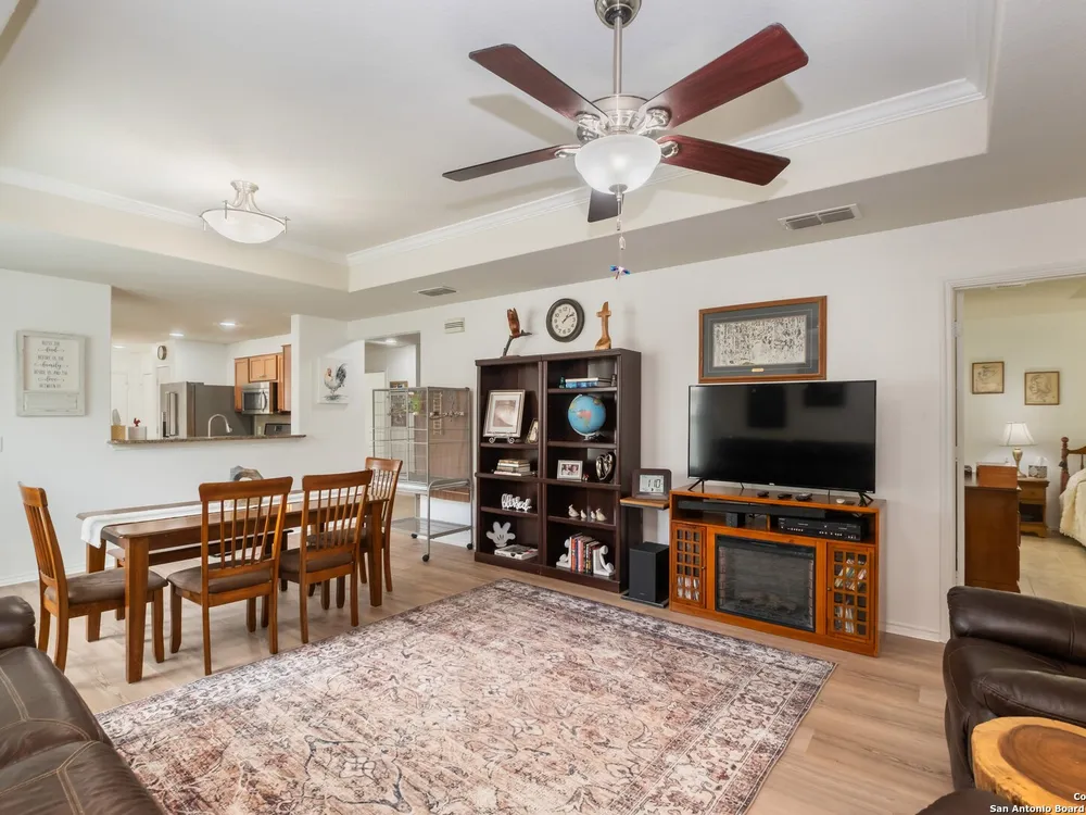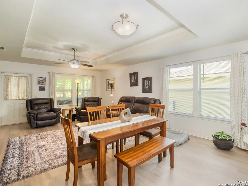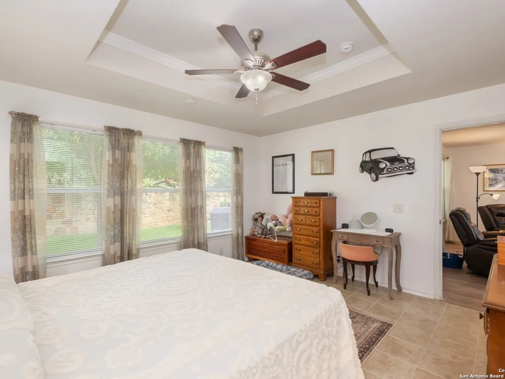 Beautiful Hill Country Retreat home located in the highly desirable Alamo Ranch area. This well-maintained 2-bedroom, 2-bath residence offers 1,393 square feet of living space on a 0.11-acre lot with a 2-car attached garage. Inside, the home features an open floor plan with two living areas, including a flexible family room currently used as both an office and a sitting area. The main living room includes a tray ceiling, and the entire home has tile flooring throughout. The kitchen is outfitted with granite countertops, a breakfast nook, and a pantry, creating a functional and inviting space for everyday living. The owners suite also showcases a tray ceiling and includes a walk-in closet and an ensuite bath with a walk-in shower and dual vanity. Outdoor features include a covered lanai, a patio slab, and a fully landscaped yard with a sprinkler system front and back. With no rear neighbor due to a dedicated easement, you can enjoy added privacy and peaceful surroundings. Residents of this gated 55+ community enjoy a resort-style amenity center featuring two outdoor pools, one indoor pool, a ballroom, meeting rooms, and scenic walking trails. Whether you're looking for comfort, convenience, or a vibrant social lifestyle, this home and community offer it all.