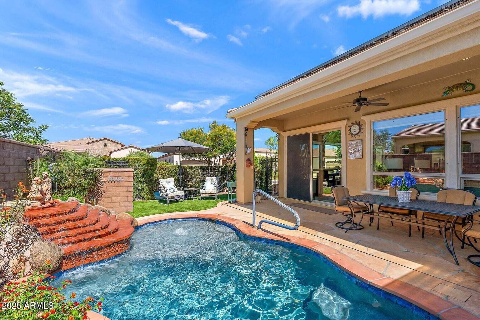 Host, cook, relax, repeat! This popular floor plan features a gourmet kitchen with granite counters and rich cabinetry that flows seamlessly into a bright, open great room with warm, inviting floors. Step outside to your backyard oasis with a therapy jet pool and cascading waterfall, perfect for entertaining or quiet evenings. Rare true 3-car garage and a prepaid solar lease fully paid—no monthly payments make energy costs worry-free. Positioned on a premium corner lot, you're just steps from Encanterra's golf, dining, fitness, and resort-style amenities. Every detail blends comfort, style, and luxury—creating the lifestyle you've been dreaming about. Experience firsthand what this home has to offer!