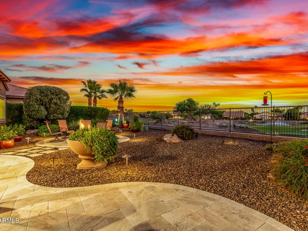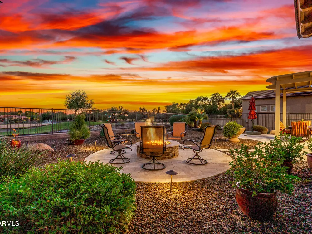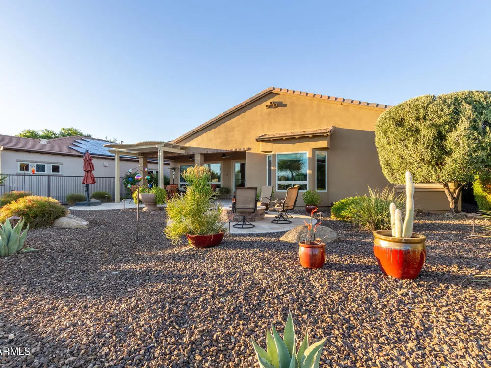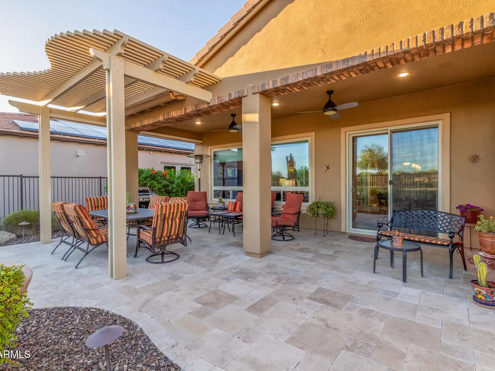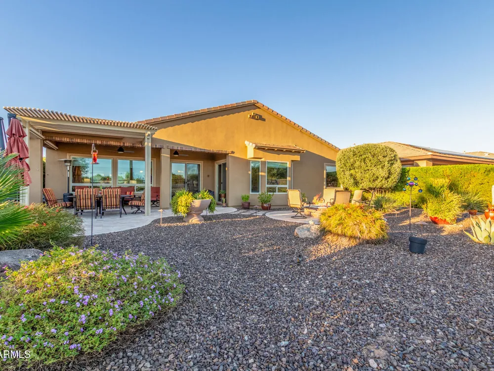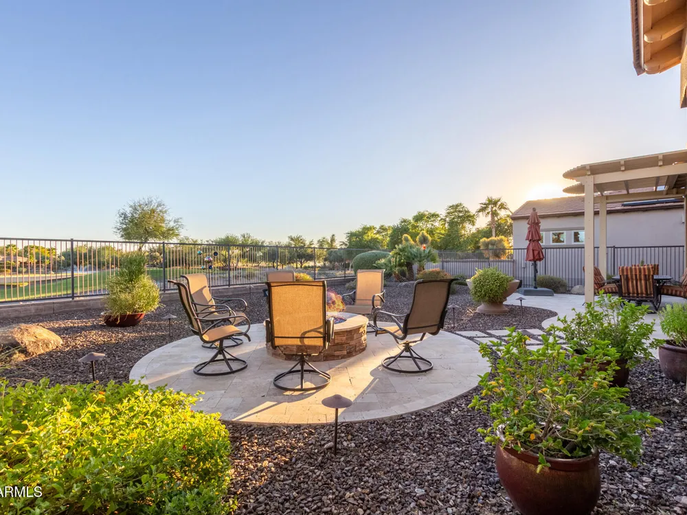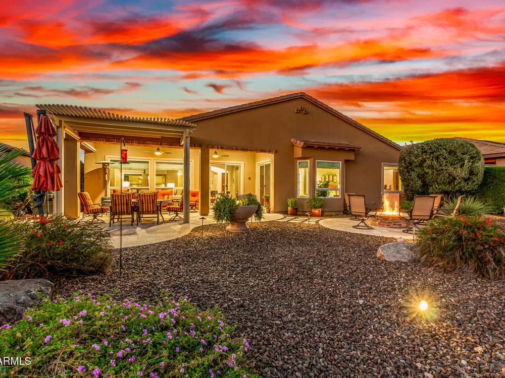 ELEVATED LOT WITH BREATHTAKING UNOBSTRUCTED VIEWS OF WATER, GOLF COURSE & WATER FOUNTAIN! Perfectly positioned on a cul-de-sac street and on one of the most premier lots in Trilogy at Vistancia ($150K LOT PREMIUM), this SOLAR-POWERED Tarragona plan offers 2BR + Den + Bonus Room / 2.5 Baths / 2.5-Car Garage and lives large with views from nearly every angle. Located just 6 homes away from a path that leads directly to the Kiva Club. Inside, refined finishes include crown molding, an upgraded entry ''tile rug,'' inside-wall insulation, surround sound in the great room/primary bedroom/patio, a bay window in the primary suite, built-in closet organizers, an expanded laundry room with sink, and a chef's kitchen with upgraded cooktop, newer dishwasher, and a 46-bottle wine cooler. Practical upgrades abound: central vacuum, home security system, UV/heat-resistant courtyard windows with exterior solar shade, and PREPAID leased solar for excellent energy savings. The SOUTH-FACING OVERSIZED BACKYARD is a showpiece with an extended patio, firepit, pergola with lattice cover, fenced yard, and smart irrigation via a Rachio controller with upgraded PVC lines. The garage is dialed-in with epoxy flooring, cabinets and shelving, a mini-split A/C & heat unit, and EV-charger wiring. From sunrise reflections on the lake to sunset views over the fairway, this home delivers a rare combination of privacy, beauty, and resort-style living. Welcome to the active adult community of Trilogy at Vistancia where you will find outstanding amenities, including 2 clubhouses, pickleball, tennis, bocce ball, fitness centers, swimming & golf, just to name a few! Trilogy is part of the community of Vistancia, a master-planned development that includes beautiful homes, parks & hiking trails, award-winning community centers & golf courses, commercial & retail shops, along with incredible rolling hills & desert landscape all around! The future 320-acre 5 North at Vistancia commercial core is coming soon, home to the new ALA K-12 charter school. Vistancia has ranked as the #1 Master Planned Community in AZ for 12 years in a row (2013-2024)! Resort-style living at its best. Come & see why!