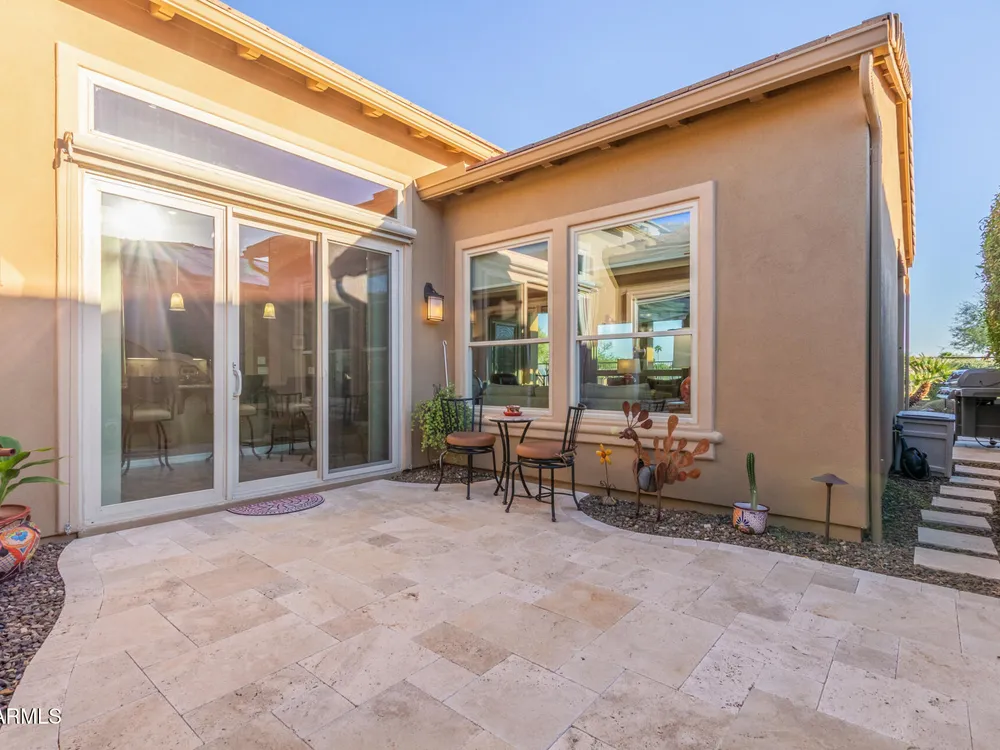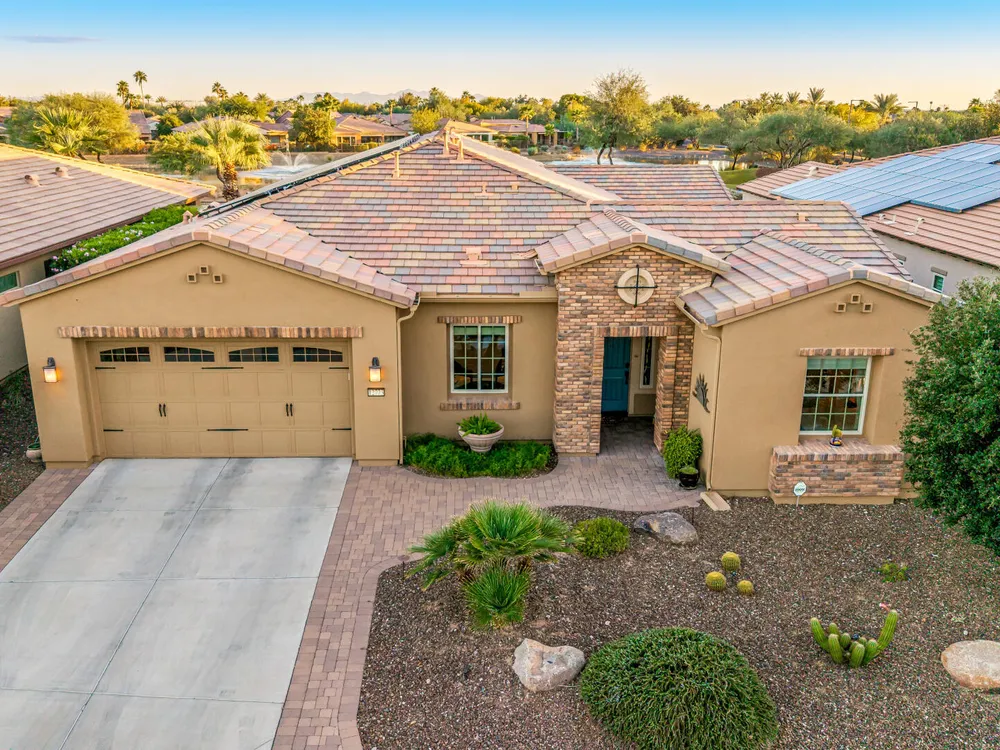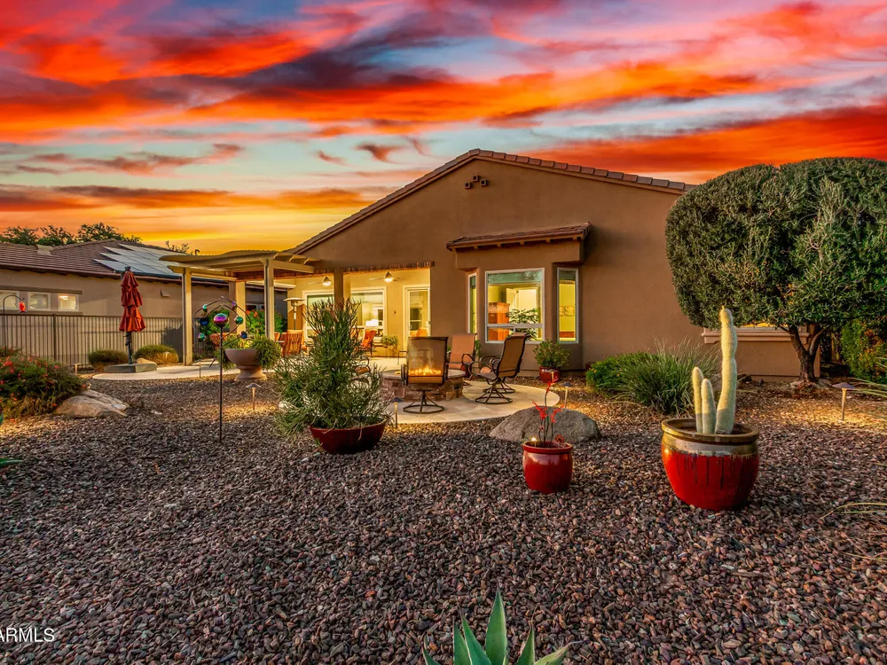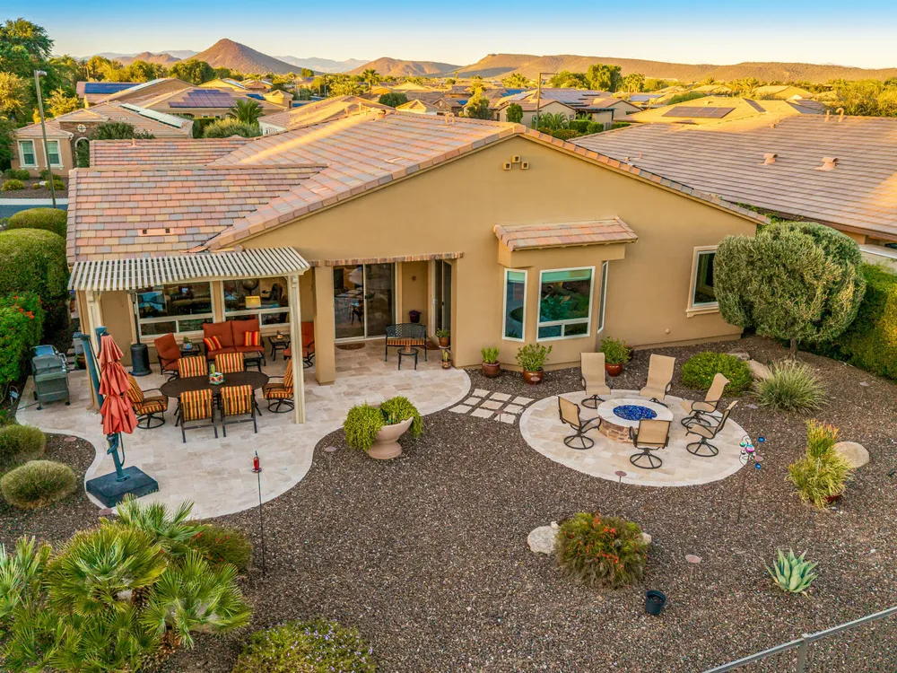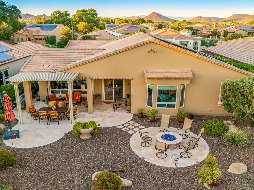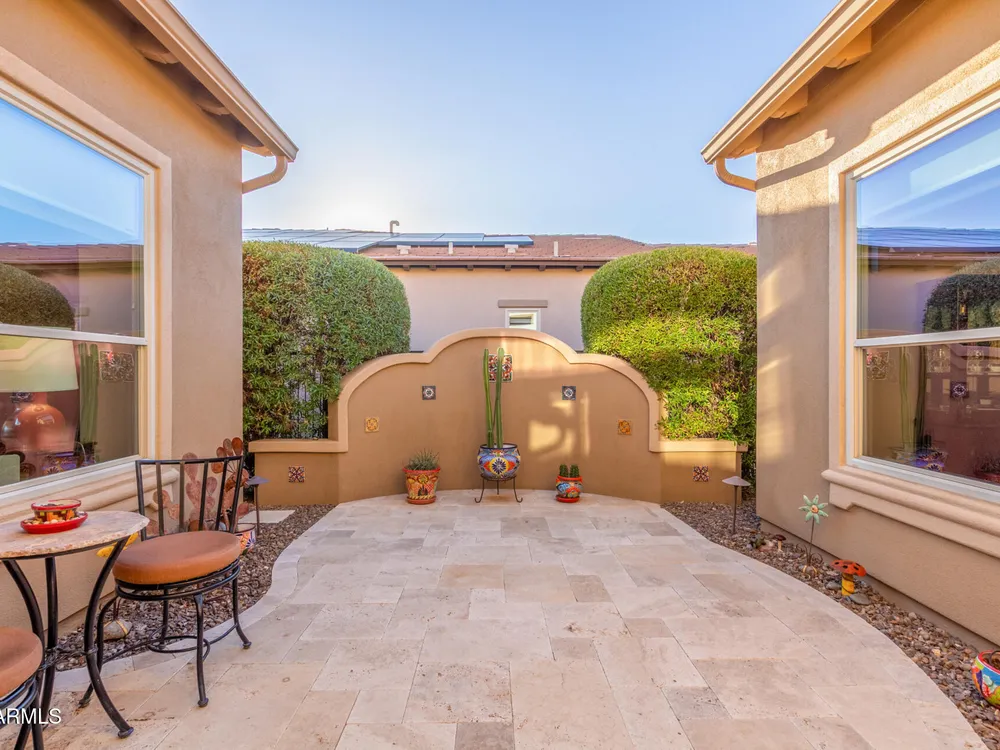 ELEVATED LOT WITH BREATHTAKING UNOBSTRUCTED VIEWS OF WATER, GOLF COURSE & WATER FOUNTAIN! Perfectly positioned on a cul-de-sac street and on one of the most premier lots in Trilogy at Vistancia ($150K LOT PREMIUM), this SOLAR-POWERED Tarragona plan offers 2BR + Den + Bonus Room / 2.5 Baths / 2.5-Car Garage and lives large with views from nearly every angle. Located just 6 homes away from a path that leads directly to the Kiva Club. Inside, refined finishes include crown molding, an upgraded entry ''tile rug,'' inside-wall insulation, surround sound in the great room/primary bedroom/patio, a bay window in the primary suite, built-in closet organizers, an expanded laundry room with sink, and a chef's kitchen with upgraded cooktop, newer dishwasher, and a 46-bottle wine cooler. Practical upgrades abound: central vacuum, home security system, UV/heat-resistant courtyard windows with exterior solar shade, and PREPAID leased solar for excellent energy savings. The SOUTH-FACING OVERSIZED BACKYARD is a showpiece with an extended patio, firepit, pergola with lattice cover, fenced yard, and smart irrigation via a Rachio controller with upgraded PVC lines. The garage is dialed-in with epoxy flooring, cabinets and shelving, a mini-split A/C & heat unit, and EV-charger wiring. From sunrise reflections on the lake to sunset views over the fairway, this home delivers a rare combination of privacy, beauty, and resort-style living. Welcome to the active adult community of Trilogy at Vistancia where you will find outstanding amenities, including 2 clubhouses, pickleball, tennis, bocce ball, fitness centers, swimming & golf, just to name a few! Trilogy is part of the community of Vistancia, a master-planned development that includes beautiful homes, parks & hiking trails, award-winning community centers & golf courses, commercial & retail shops, along with incredible rolling hills & desert landscape all around! The future 320-acre 5 North at Vistancia commercial core is coming soon, home to the new ALA K-12 charter school. Vistancia has ranked as the #1 Master Planned Community in AZ for 12 years in a row (2013-2024)! Resort-style living at its best. Come & see why!
