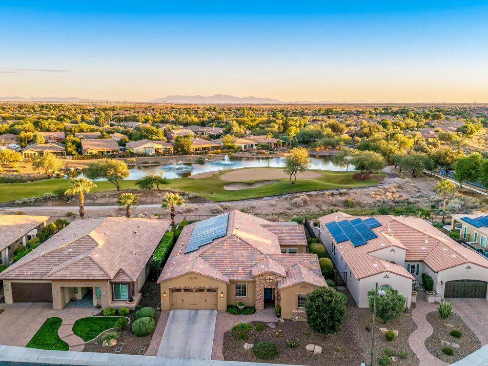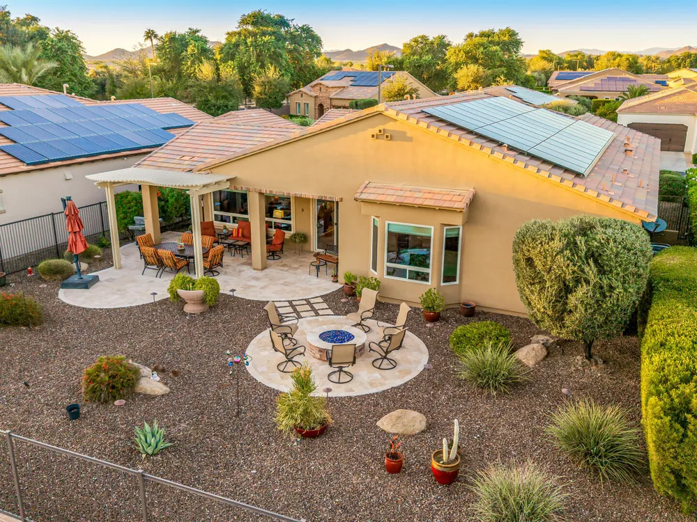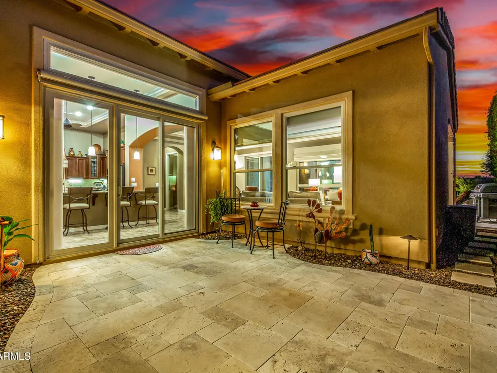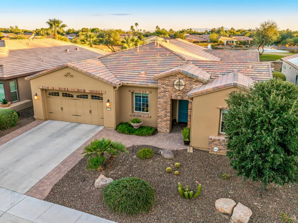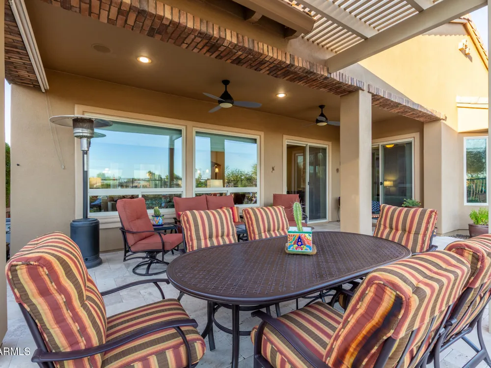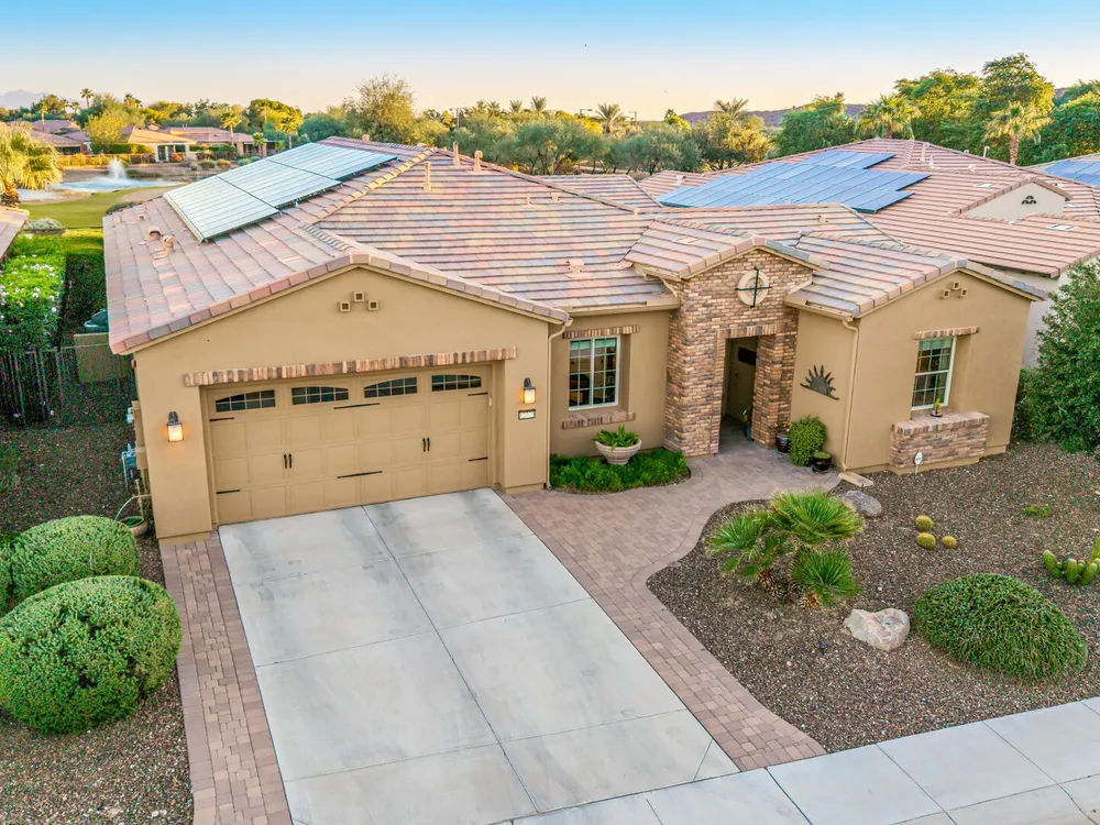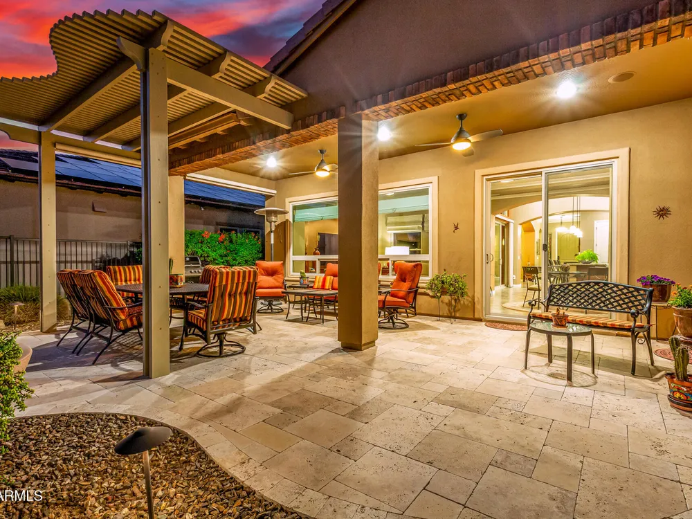 ELEVATED LOT WITH BREATHTAKING UNOBSTRUCTED VIEWS OF WATER, GOLF COURSE & WATER FOUNTAIN! Perfectly positioned on a cul-de-sac street and on one of the most premier lots in Trilogy at Vistancia ($150K LOT PREMIUM), this SOLAR-POWERED Tarragona plan offers 2BR + Den + Bonus Room / 2.5 Baths / 2.5-Car Garage and lives large with views from nearly every angle. Located just 6 homes away from a path that leads directly to the Kiva Club. Inside, refined finishes include crown molding, an upgraded entry ''tile rug,'' inside-wall insulation, surround sound in the great room/primary bedroom/patio, a bay window in the primary suite, built-in closet organizers, an expanded laundry room with sink, and a chef's kitchen with upgraded cooktop, newer dishwasher, and a 46-bottle wine cooler. Practical upgrades abound: central vacuum, home security system, UV/heat-resistant courtyard windows with exterior solar shade, and PREPAID leased solar for excellent energy savings. The SOUTH-FACING OVERSIZED BACKYARD is a showpiece with an extended patio, firepit, pergola with lattice cover, fenced yard, and smart irrigation via a Rachio controller with upgraded PVC lines. The garage is dialed-in with epoxy flooring, cabinets and shelving, a mini-split A/C & heat unit, and EV-charger wiring. From sunrise reflections on the lake to sunset views over the fairway, this home delivers a rare combination of privacy, beauty, and resort-style living. Welcome to the active adult community of Trilogy at Vistancia where you will find outstanding amenities, including 2 clubhouses, pickleball, tennis, bocce ball, fitness centers, swimming & golf, just to name a few! Trilogy is part of the community of Vistancia, a master-planned development that includes beautiful homes, parks & hiking trails, award-winning community centers & golf courses, commercial & retail shops, along with incredible rolling hills & desert landscape all around! The future 320-acre 5 North at Vistancia commercial core is coming soon, home to the new ALA K-12 charter school. Vistancia has ranked as the #1 Master Planned Community in AZ for 12 years in a row (2013-2024)! Resort-style living at its best. Come & see why!