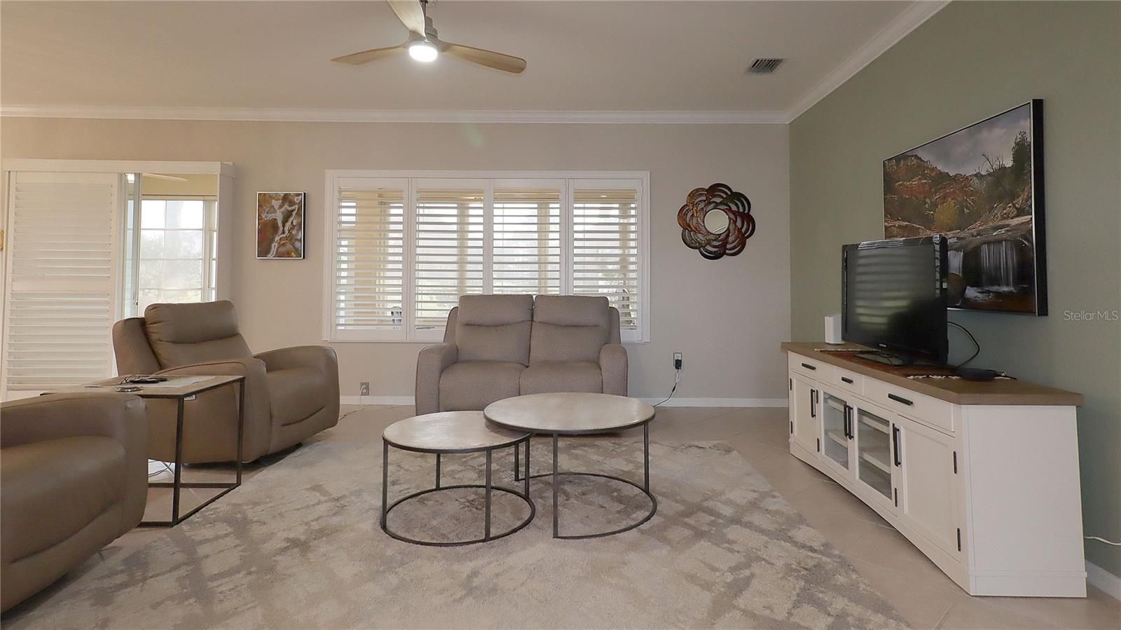 - Ceiling Fan(s), Crown Molding, High Ceilings, Kitchen/Family Room Combo, Open Floorplan, Main Level Primary, Solid Surface Counters, Solid-Wood Cabinets, Walk-In Closet(s), Window Treatments