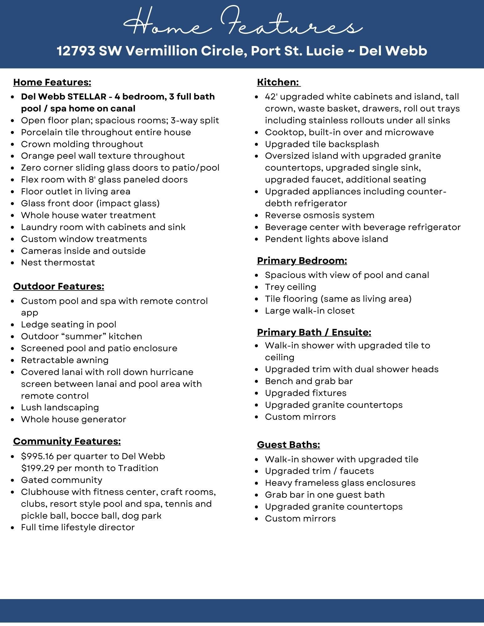 Beautifully upgraded home in Del Webb Tradition, Port St. Lucie's premier 55+ active adult community! This move-in ready residence features designer tile flooring, upgraded kitchen with stainless appliances and premium cabinetry, custom lighting and window treatments, smart-home wiring, pool and spa, and an extended screened lanai for outdoor living. Enjoy resort-style amenities including a clubhouse, fitness center, pool, pickleball, and tennis. Live the vibrant Tradition lifestyle close to dining, shopping, and medical facilities. Experience luxury, comfort, and community in Del Webb Tradition, Port St. Lucie, FL--where every day feels like vacation.