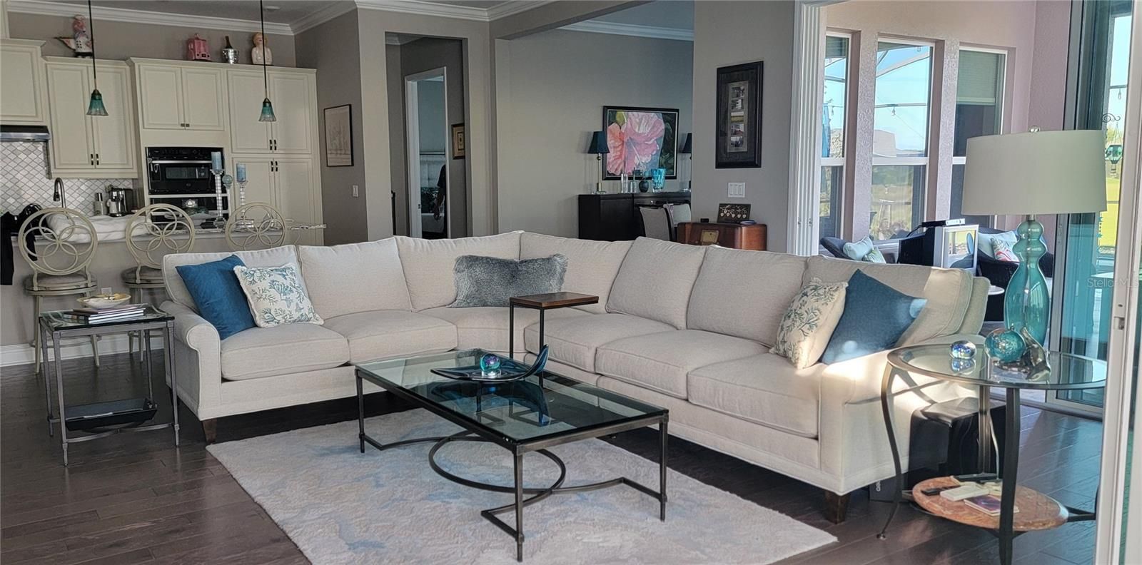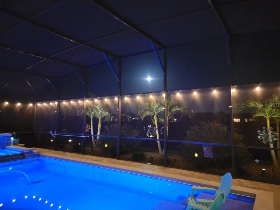 A rare find in the premier neighborhood of Trilogy in Groveland (aka Cascades of Groveland)! Beautiful courtyard leading to beveled glass entry door opening up to a fabulous open floorplan with wood floors, crown molding, a chef's dream kitchen, custom wood cornices and window coverings, smart-space in laundry room, water purification system, 3-car garage and tons of upgrades! And if that isn't enough, an all-weather patio with acrylic windows and electronic shade that leads to the gorgeous, screened in heated saltwater pool and spa with sun shelf and pool sweep. Between the pool light that can be set to different colors and the commercial lights around the pool, you will feel like you are in a resort. Very private lot and beautiful landscaping complete the backyard. The community features clubhouse, pool & spa, pickle ball courts, state-of-the art gym, and best of all, a restaurant and bar onsite. HOA includes, internet, cable, telephone, gated entry, alarm monitoring, lawn maintenance and all the wonderful amenities.