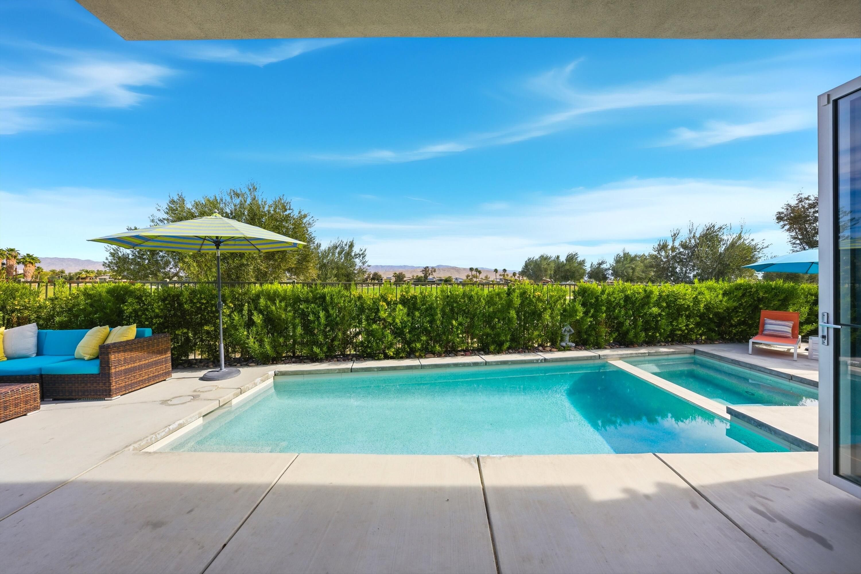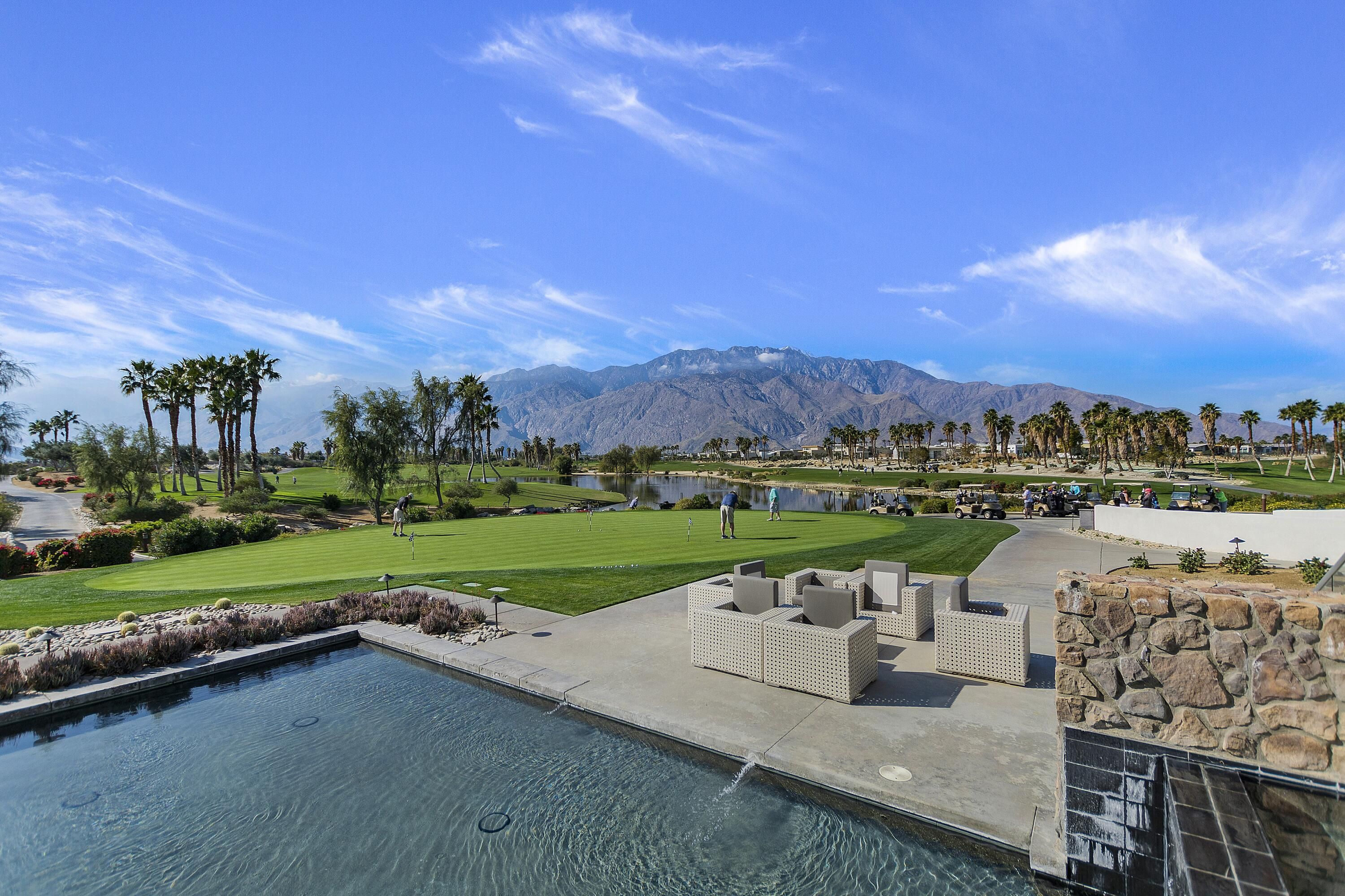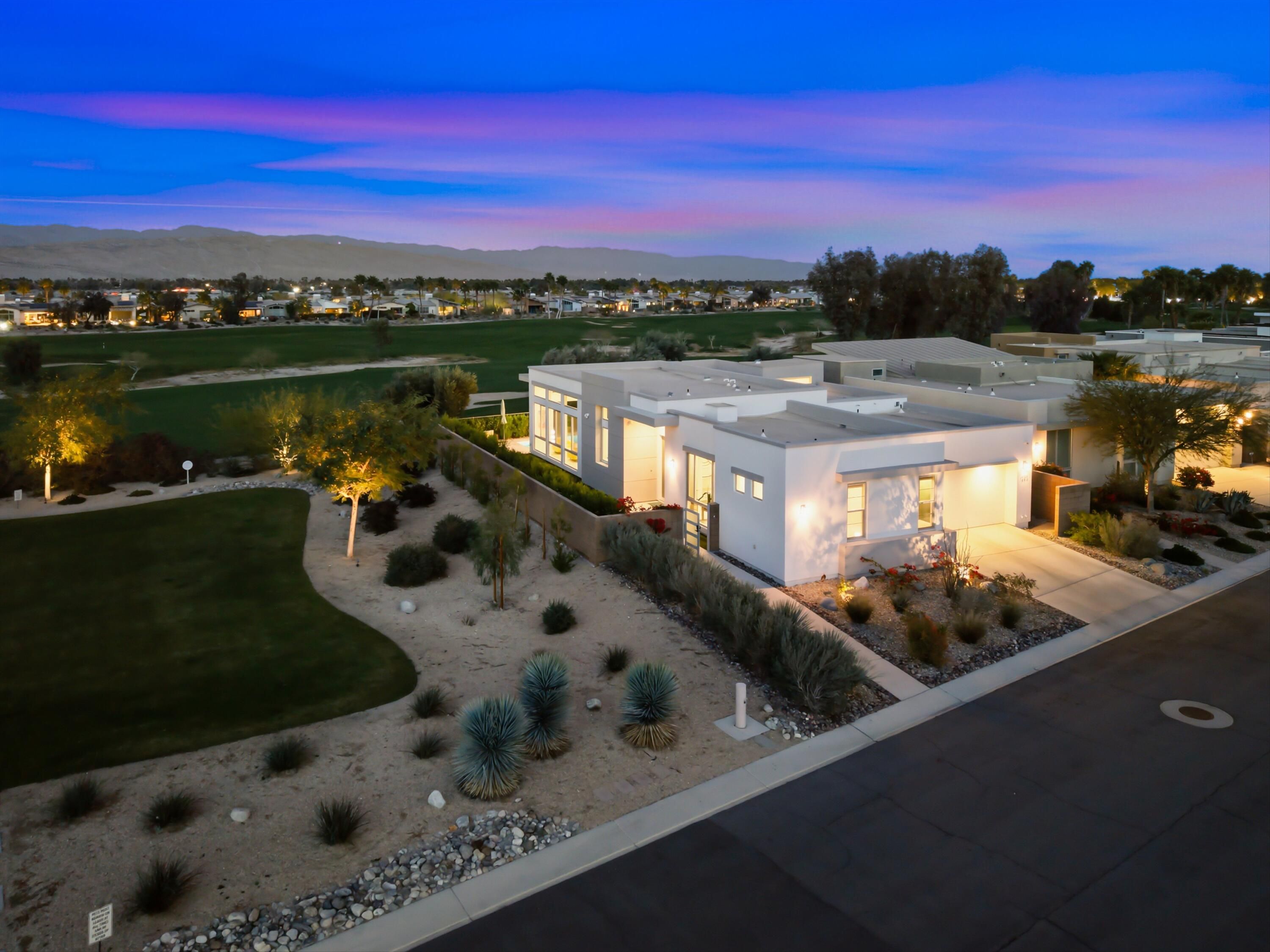 This stunning, elegant modern home with panoramic mountain views is in the gated community of Escena. Built in 2020, the 2,561 sq. ft. residence offers luxurious living space on a corner lot situated on the 2nd fairway of the esteemed Escena golf course in Palm Springs. Featuring 3 bedrooms and 3 bathrooms, this highly upgraded home showcases an open-concept design with dramatic 12-foot ceilings and expansive living spaces filled with natural light. Elegant La Faenza Italian porcelain tile flooring flows throughout, creating a sleek, modern aesthetic. The chef's kitchen showcases premium KitchenAid commercial-grade stainless steel appliances, an oversized center island, quartz countertops, marble tile backsplash, upgraded fixtures and under-cabinet lighting. The heart of the home opens beautifully to the outdoors with a retractable wall of La Cantina bifold stacking doors creating a seamless transition to the patio and pool area - perfect for true indoor-outdoor living. The primary suite features a spa-inspired bath with an expansive walk-in rain shower, custom Carrara marble tile walls and heated floors. The suite is completed with dual vanities, a large walk-in closet designed by California Closets and automated blackout blinds. A second guest bedroom offers privacy and comfort with its own ensuite bath, dual vanity, custom shower, and blackout blinds. The third bedroom is versatile - ideal as an office or guest space - highlighted by a custom 9-foot solid double door entry. Step outside to your private resort-style backyard complete with a pool and spillover spa, enhanced by a Pentair pool and spa automation system for effortless control, a generous 720 sq ft of pet-friendly artificial turf, providing low-maintenance beauty and play space. Both the front and back yards have been newly landscaped, and the front door & custom front gate includes an internet-enabled lock for modern security and convenience. Additional features include Control 4 home automation system, water filtration & softening system, separate laundry room with built-in cabinetry and utility sink, and a 2-car garage with an insulated door & level 2 EV car charger. Set directly on the golf course within one of Palm Springs' most desirable gated communities, this home delivers contemporary elegance, smart technology, and true resort-style living.