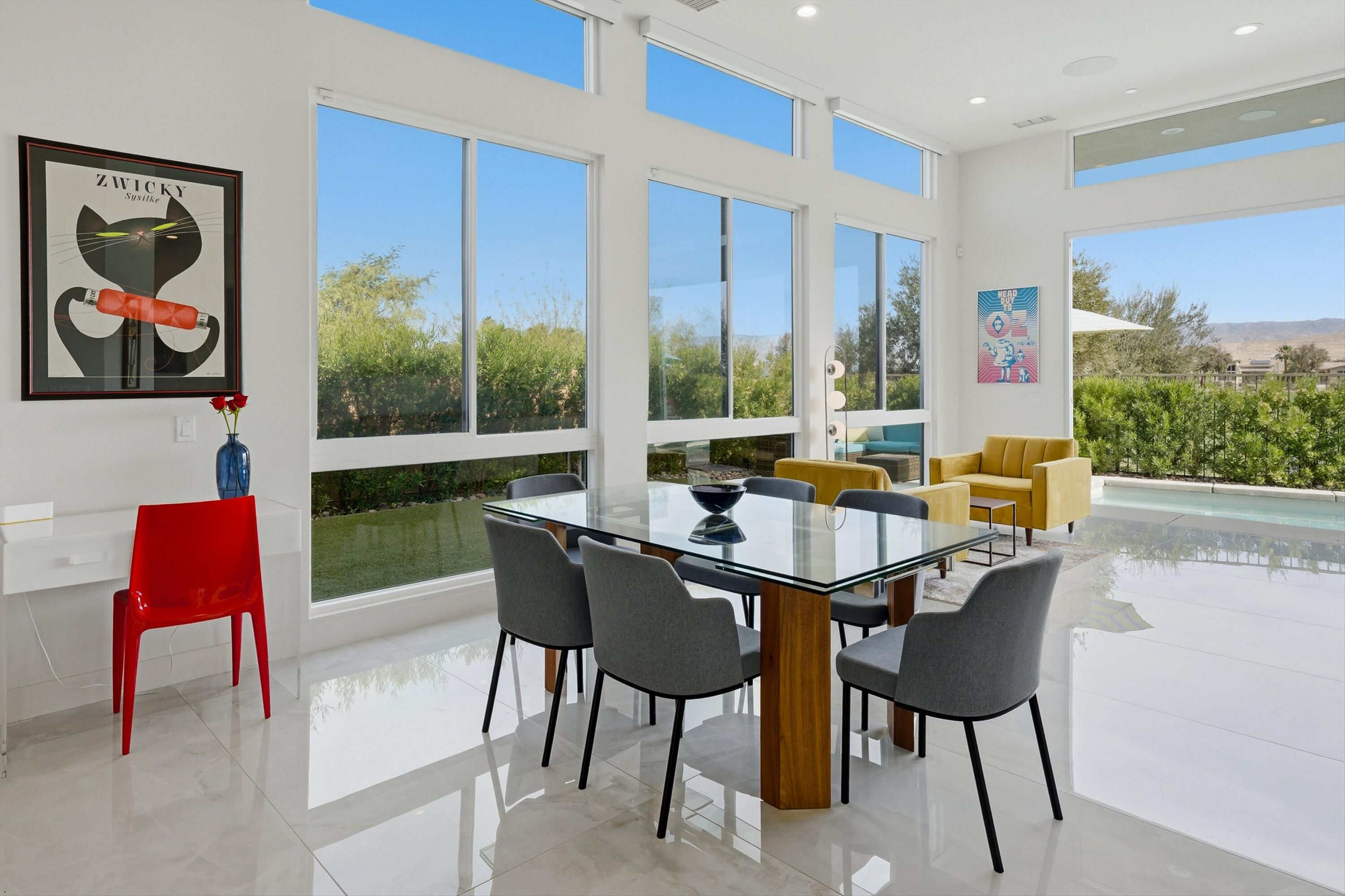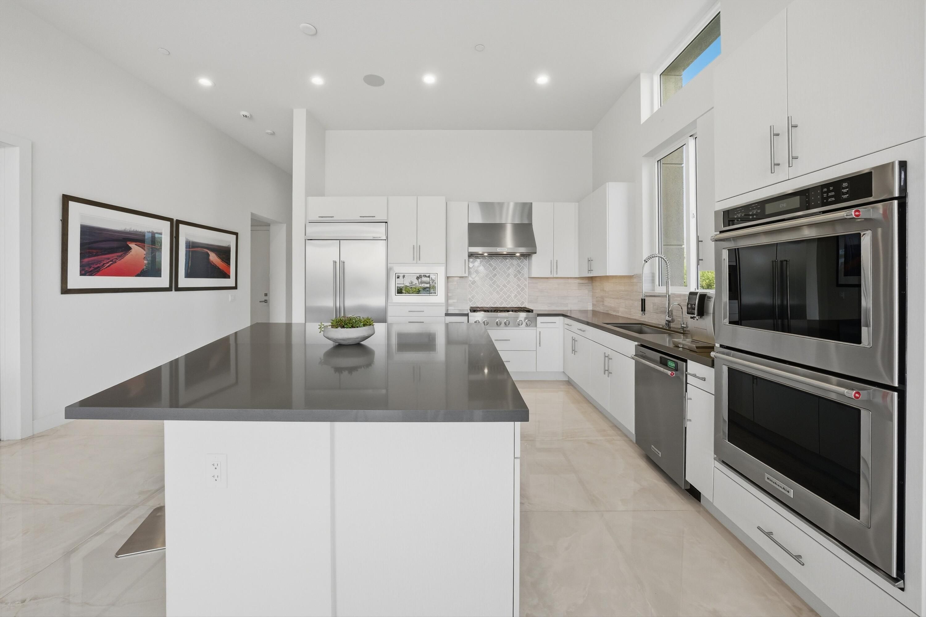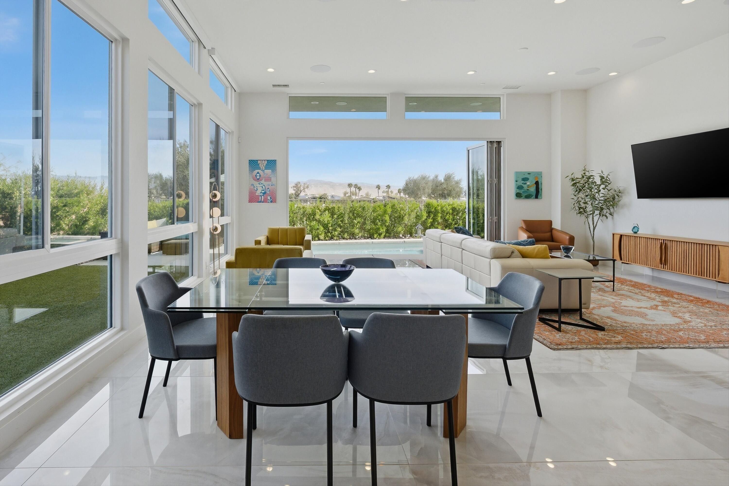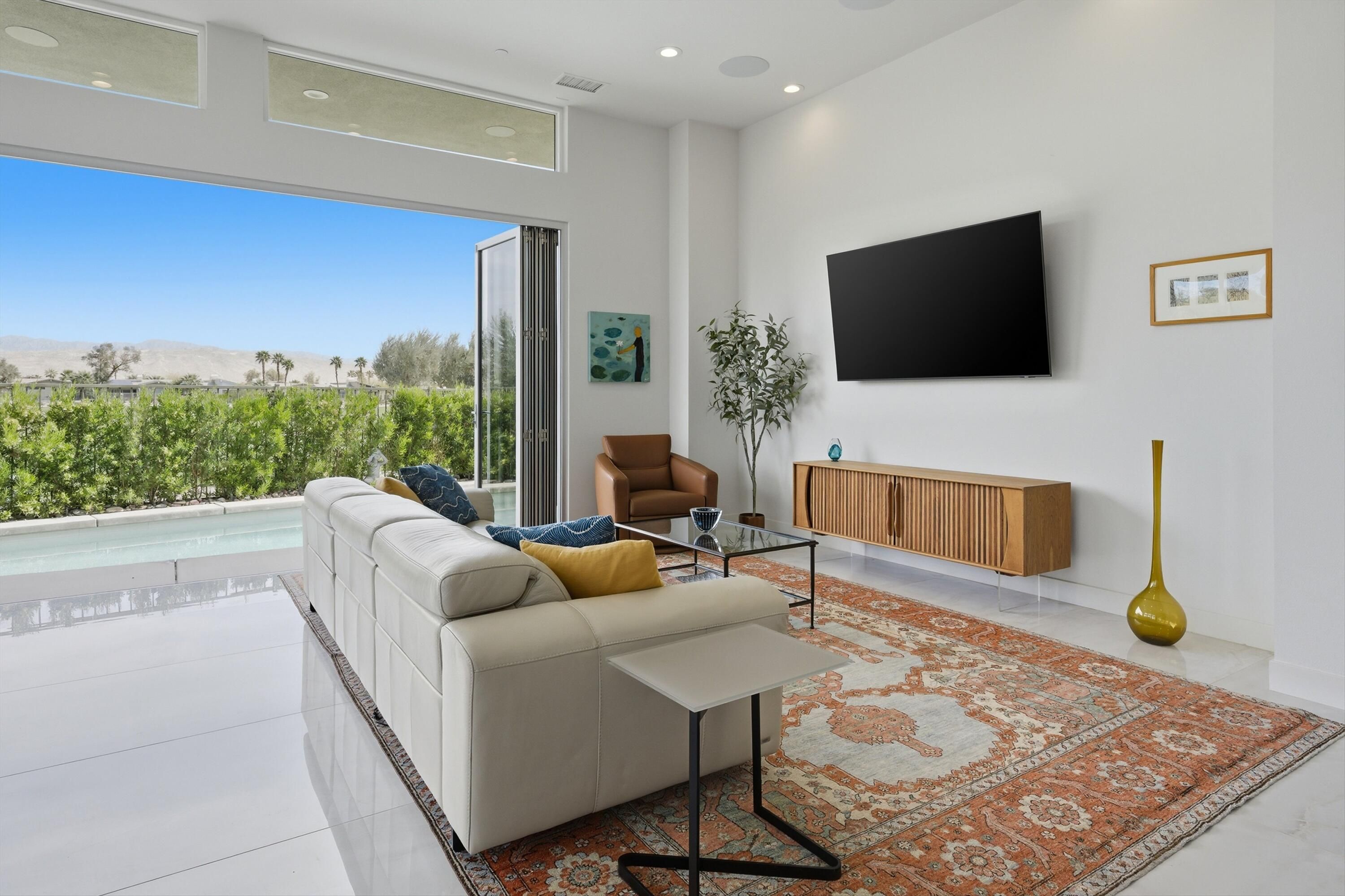 This stunning, elegant modern home with panoramic mountain views is in the gated community of Escena. Built in 2020, the 2,561 sq. ft. residence offers luxurious living space on a corner lot situated on the 2nd fairway of the esteemed Escena golf course in Palm Springs. Featuring 3 bedrooms and 3 bathrooms, this highly upgraded home showcases an open-concept design with dramatic 12-foot ceilings and expansive living spaces filled with natural light. Elegant La Faenza Italian porcelain tile flooring flows throughout, creating a sleek, modern aesthetic. The chef's kitchen showcases premium KitchenAid commercial-grade stainless steel appliances, an oversized center island, quartz countertops, marble tile backsplash, upgraded fixtures and under-cabinet lighting. The heart of the home opens beautifully to the outdoors with a retractable wall of La Cantina bifold stacking doors creating a seamless transition to the patio and pool area - perfect for true indoor-outdoor living. The primary suite features a spa-inspired bath with an expansive walk-in rain shower, custom Carrara marble tile walls and heated floors. The suite is completed with dual vanities, a large walk-in closet designed by California Closets and automated blackout blinds. A second guest bedroom offers privacy and comfort with its own ensuite bath, dual vanity, custom shower, and blackout blinds. The third bedroom is versatile - ideal as an office or guest space - highlighted by a custom 9-foot solid double door entry. Step outside to your private resort-style backyard complete with a pool and spillover spa, enhanced by a Pentair pool and spa automation system for effortless control, a generous 720 sq ft of pet-friendly artificial turf, providing low-maintenance beauty and play space. Both the front and back yards have been newly landscaped, and the front door & custom front gate includes an internet-enabled lock for modern security and convenience. Additional features include Control 4 home automation system, water filtration & softening system, separate laundry room with built-in cabinetry and utility sink, and a 2-car garage with an insulated door & level 2 EV car charger. Set directly on the golf course within one of Palm Springs' most desirable gated communities, this home delivers contemporary elegance, smart technology, and true resort-style living.