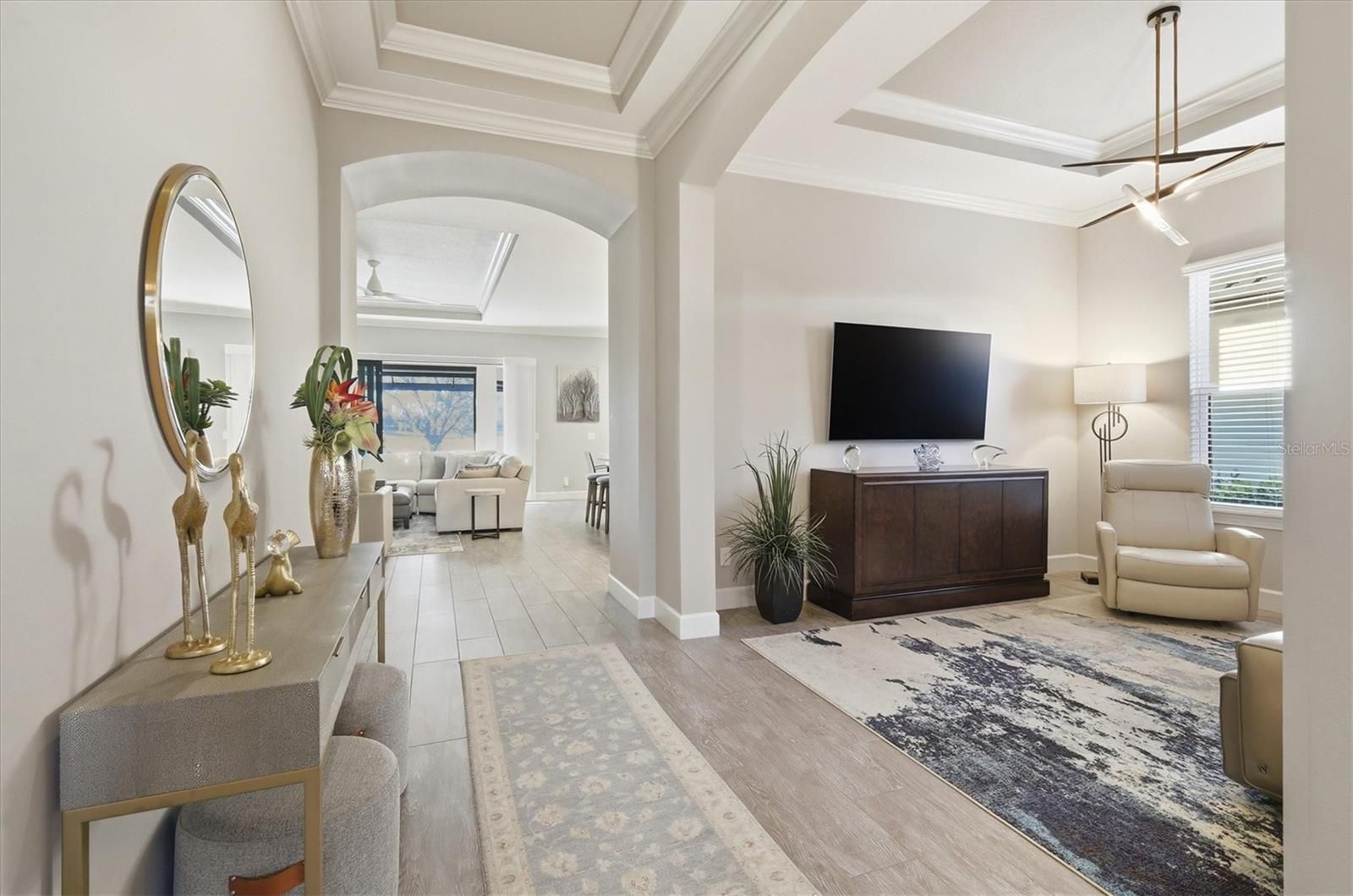 In Lakewood Ranch’s prestigious Esplanade Golf and Country Club, this elegant residence offers a balance of resort living and refined design. Overlooking the golf course, the home offers a deeded golf membership and is positioned on a golf-front lot to capture expansive views and remarkable sunsets. Impact glass windows and doors add lasting value and protection. A custom-designed pool with an infinity-edge champagne spa highlights the outdoor living area, complemented by a granite summer kitchen and the rich texture of matte pale gray marble tile across the lanai. Interior and exterior automated solar shades enhance comfort and privacy, while decorative window treatments and room-darkening shades in the primary bedroom add a refined touch. Inside, light wood-look porcelain tile flooring, crown molding and custom-designed closets underscore attention to detail. The spacious kitchen features neutral pale gray cabinetry, quartz countertops, a reverse osmosis water system, and a casual breakfast area that overlooks the lanai, ideal for casual dining or enjoying serene mornings. Additional features include automated garage storage shelving and thoughtfully integrated technology throughout. Residents enjoy an active country club lifestyle that includes tennis, pickleball, resident- run interest groups, community- sponsored social events, two large resort-style pools, two clubhouses, state-of-the-art fitness centers, the Barrel House Bistro, Bahama Bar and on-site dining at the Culinary Center. This residence reflects the exceptional quality and luxury living that defines Esplanade Golf and Country Club in Lakewood Ranch, just moments from the cultural attractions and coastal beauty of Sarasota.