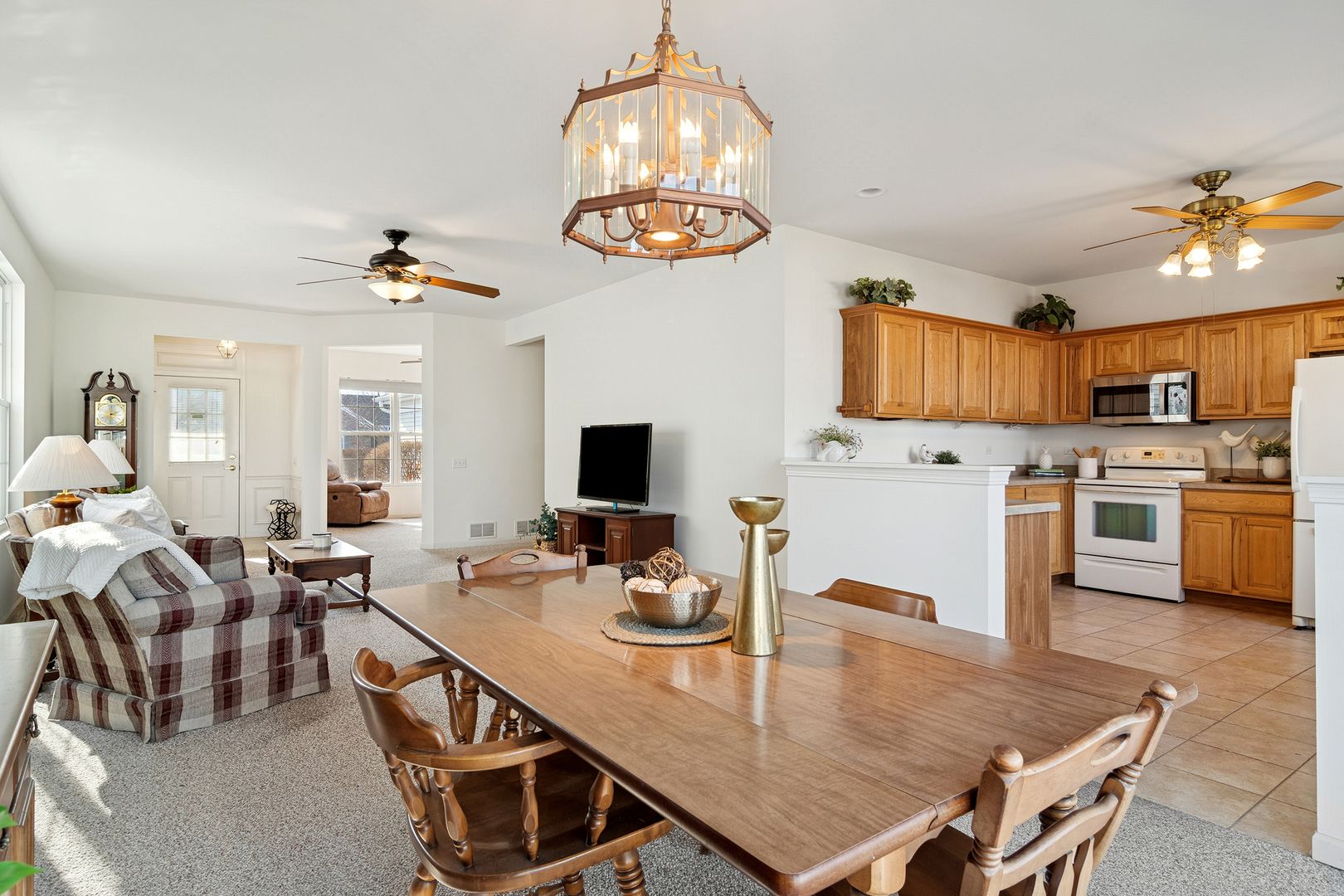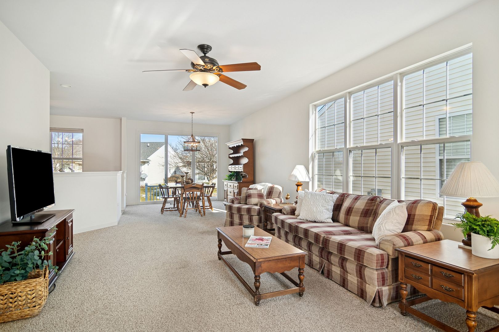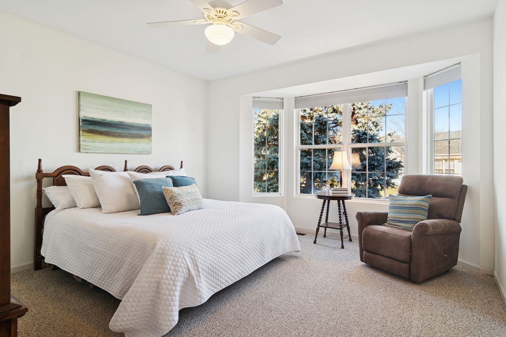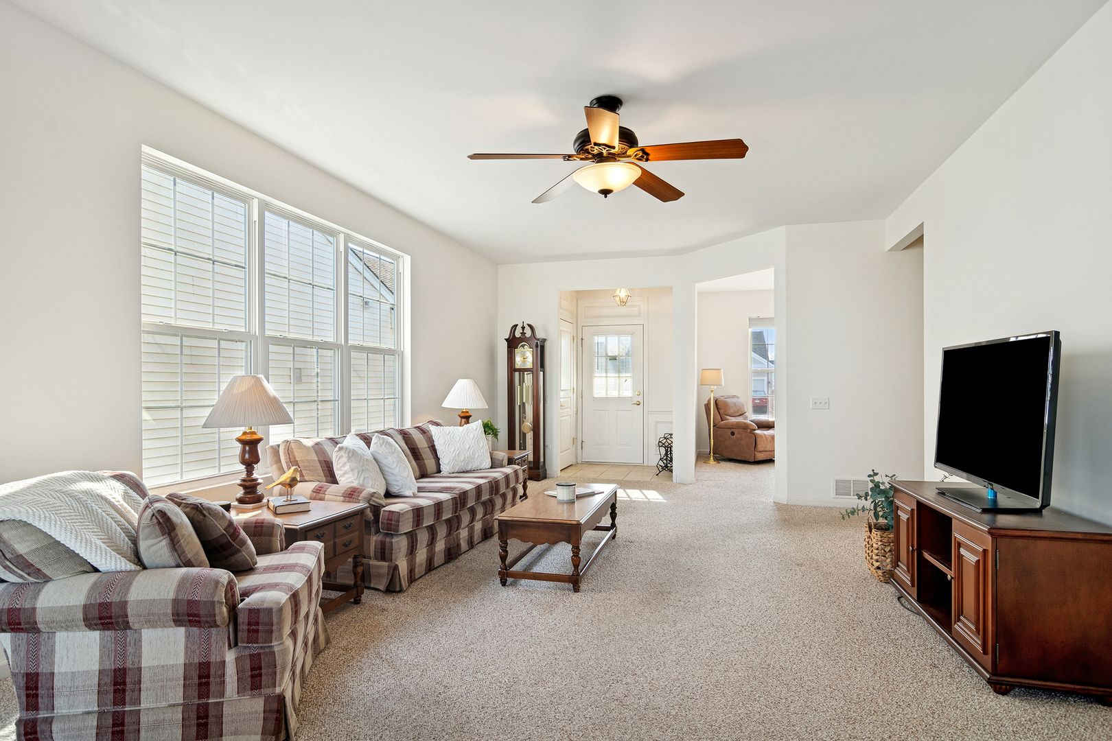 You don't have to give up extra space for hobbies or storage when you move into this lovely ranch-style home. The main level is perfectly set up for one-level living, plus you'll have the bonus of a full basement, giving you flexibility for additional living or recreation space, or a place to store your treasures. You'll love the natural light spilling in from abundant windows that also offer lovely outdoor views to enjoy throughout the seasons. The home flows easily and is built for everyday living and entertaining. You'll appreciate having a good size kitchen with abundant cabinetry, pantry, and eating area that overlooks the yard. Valuable counter space provides an opportunity for multiple prep & serving areas, or even a dedicated coffee station. The den is the perfect place to relax and get lost in a good book or your favorite show while enjoying the views through the oversized windows. It could also be set up as an office, exercise space, or combination. The generously sized primary bedroom features a bay window, large walk-in closet, and an en-suite bathroom. The basement features an established workshop area and great built-in shelving making it easy to organize and store your things. You'll love the welcoming back patio-a lovely spot to relax and enjoy the outdoors or hone your grilling skills. This home is the perfect package of everything you need to move right in and start enjoying all the amenities this active adult 55+ community has to offer!
