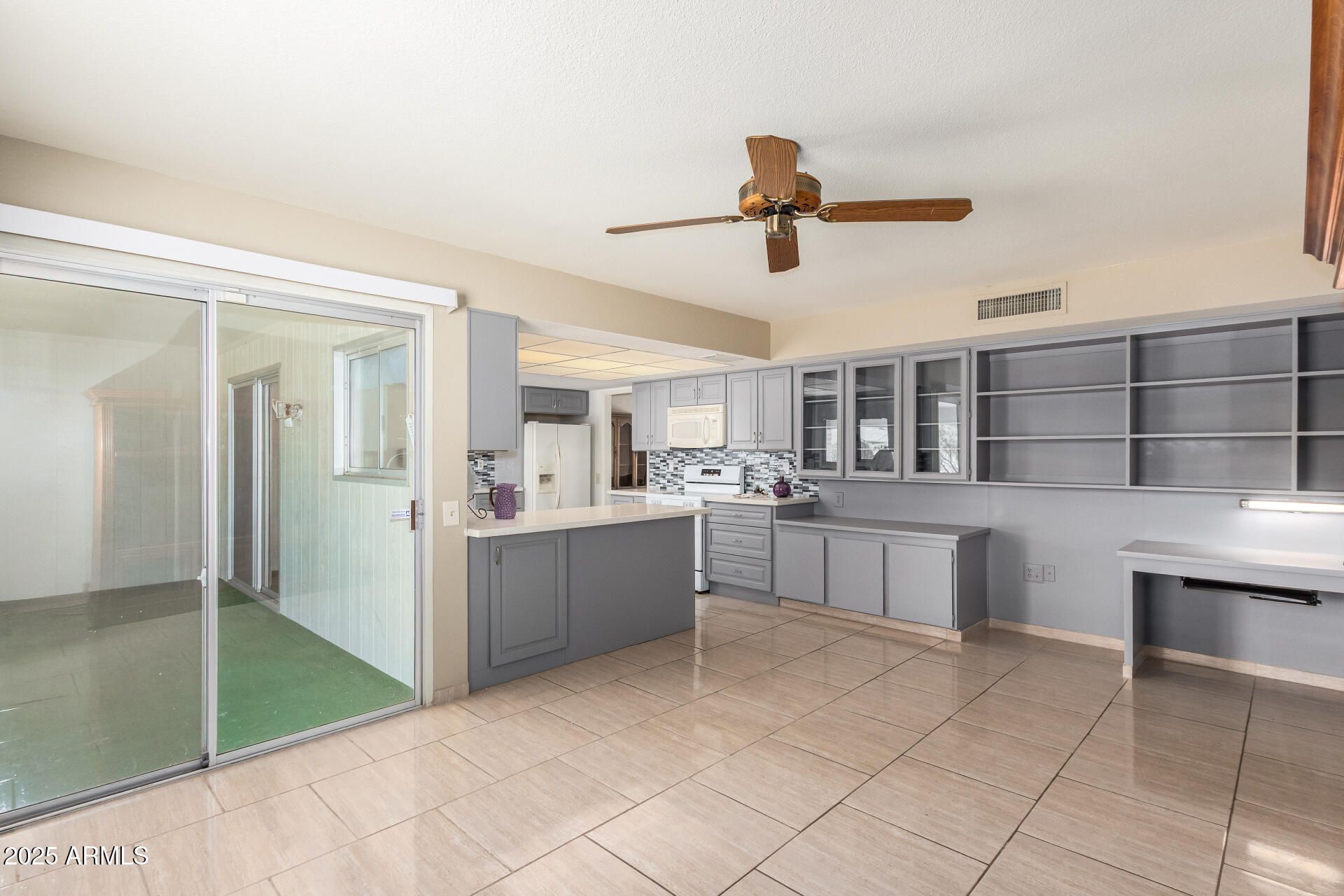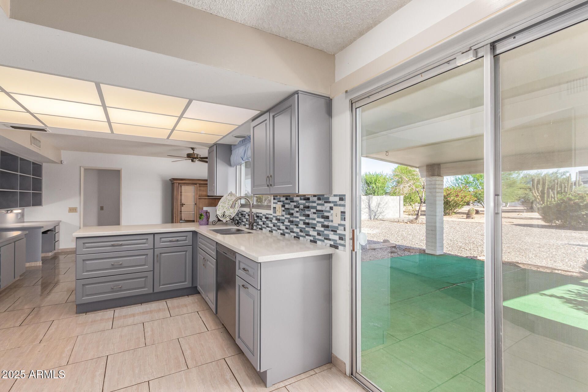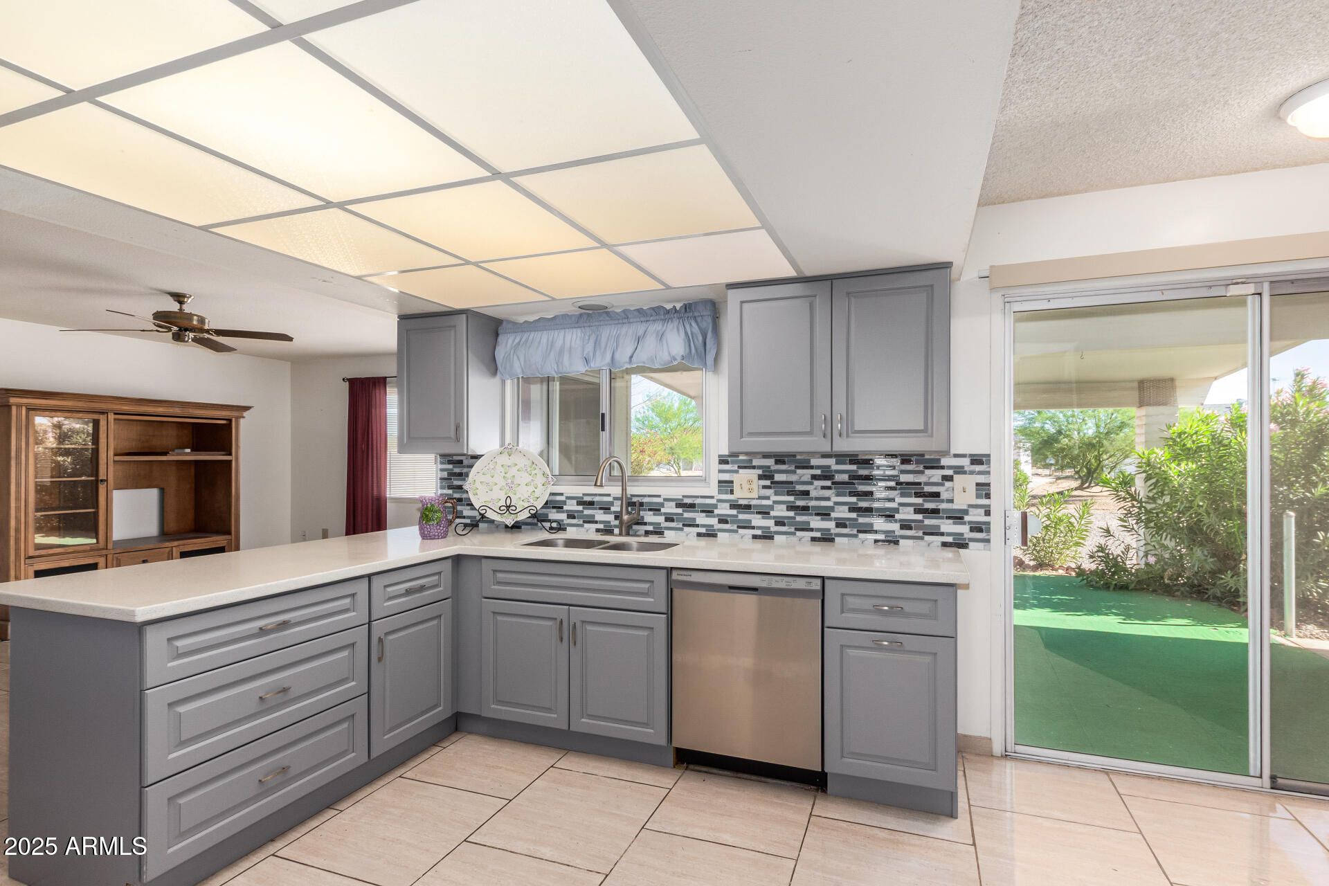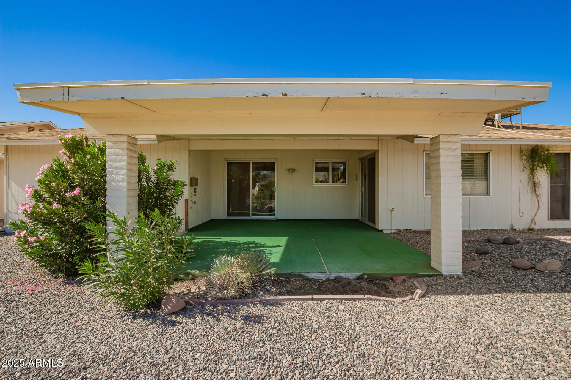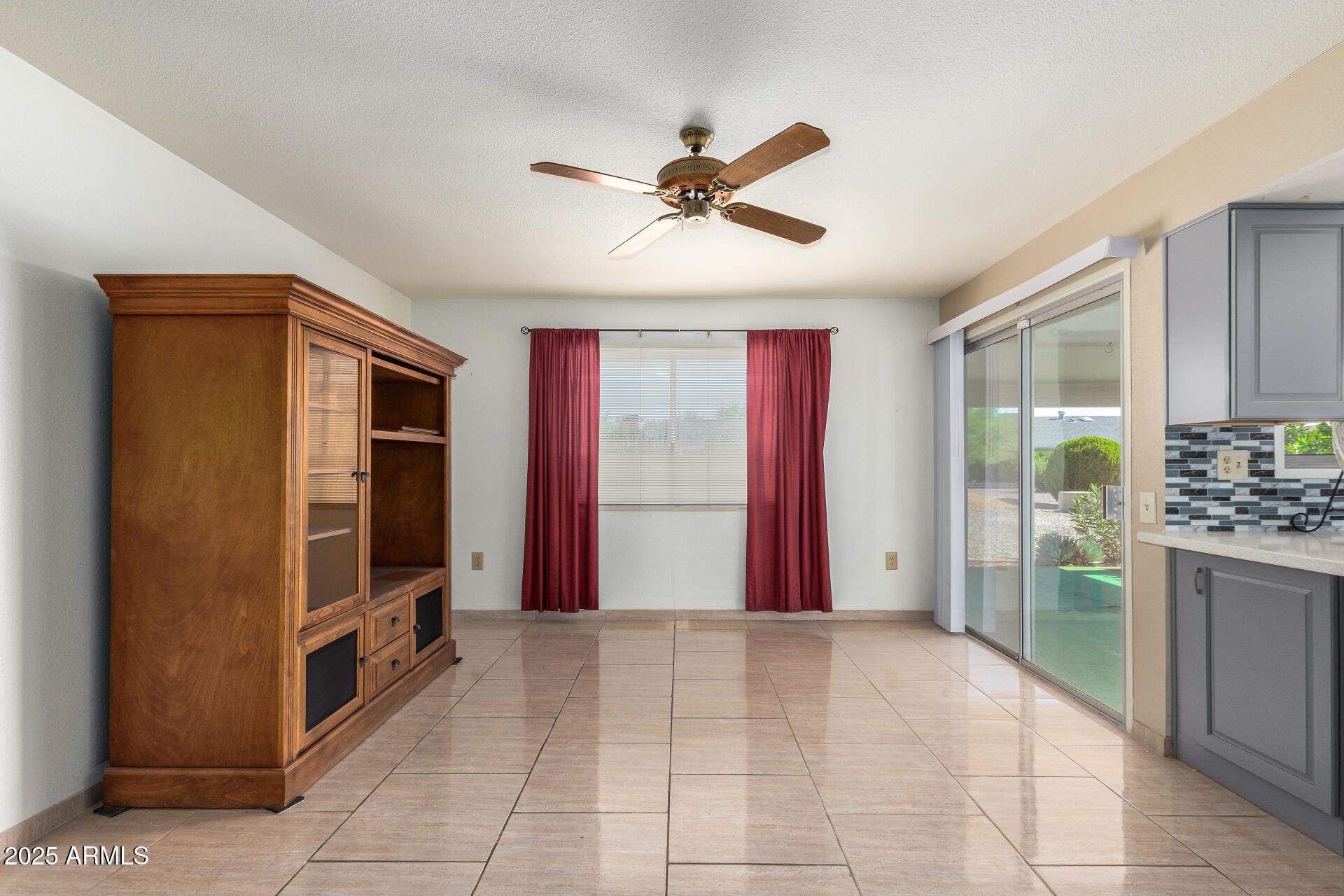 Located in a very quiet area of Sun City, this home has room to spare. Great Entertaining possibilities with Kitchen/Family Room combo having 2 sliders to oversized covered patio. Kitchen recently remodeled with newer appliances, cabinets, counters and backsplash. Roof replaced in 2018, Water Heater 2024. Spacious living/dining combo as you enter. Both Bedrooms are generous size and have Walk-in Closets. Huge Laundry Room can be used for Crafts or Office or even a Butler's Pantry. Annapolis model is very popular as the options are endless. Great location and the last area in Phase II that Del Webb built in Sun City (1979). Don't miss the opportunity to see this home before it's gone. Virtual Staging available soon, stop back in to see the possibilities.