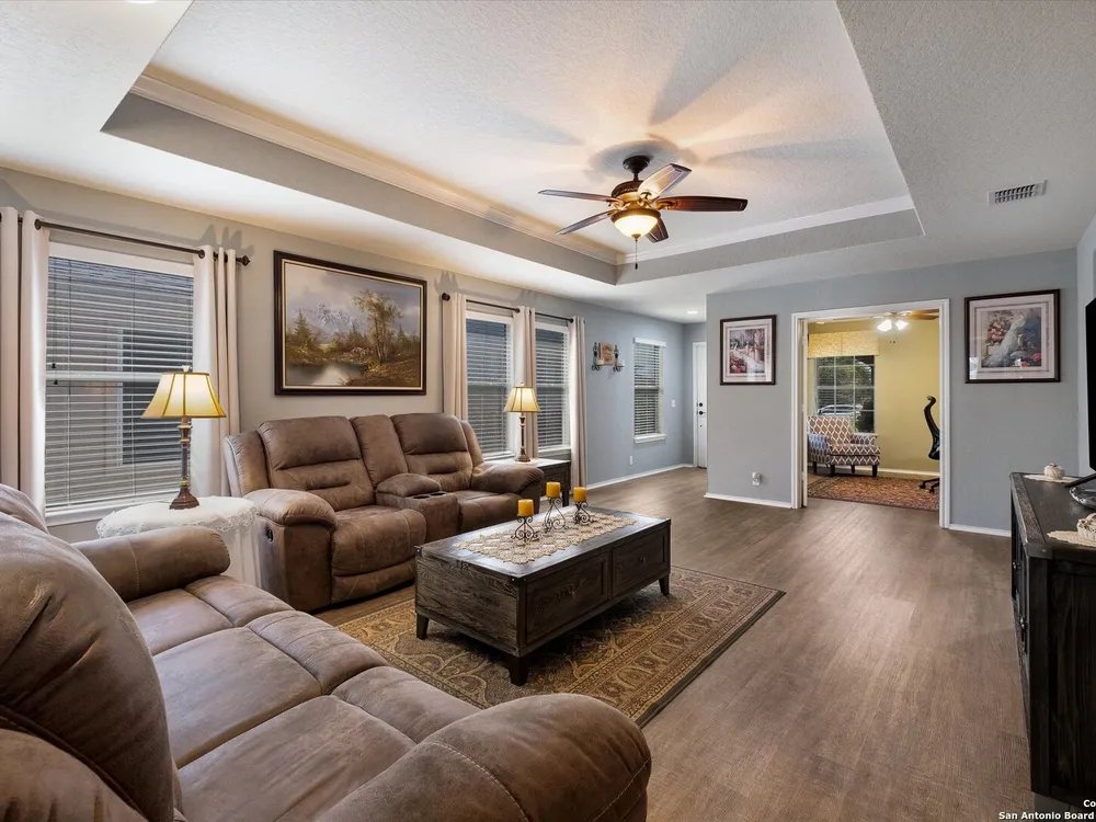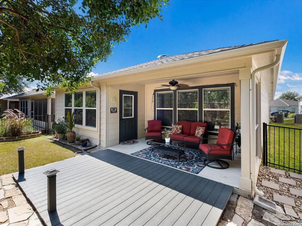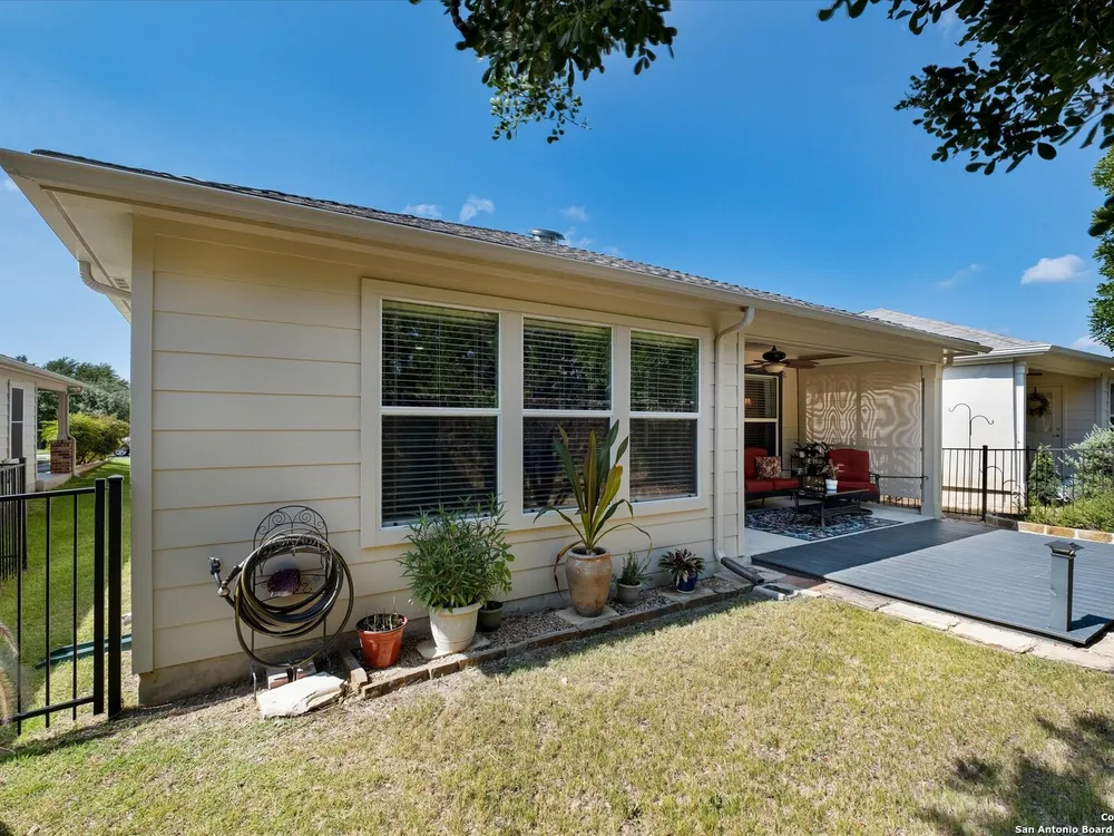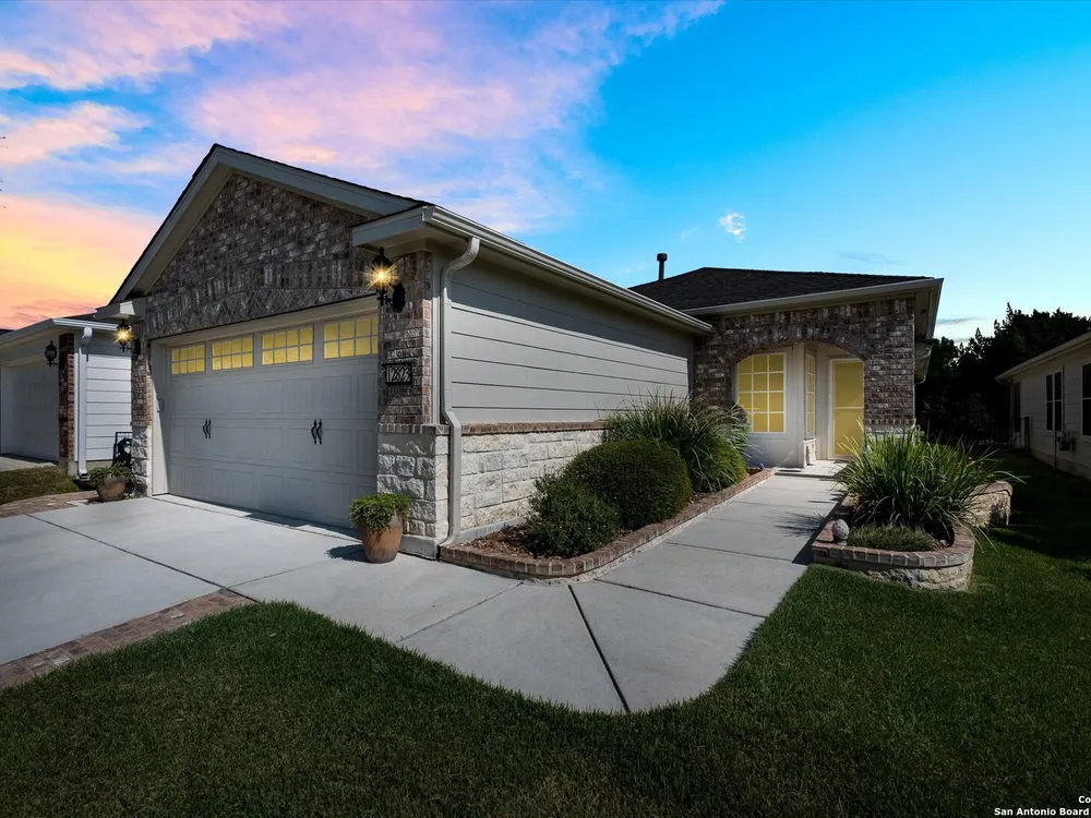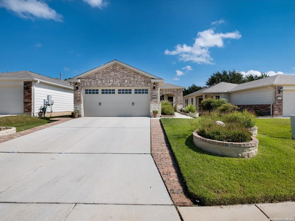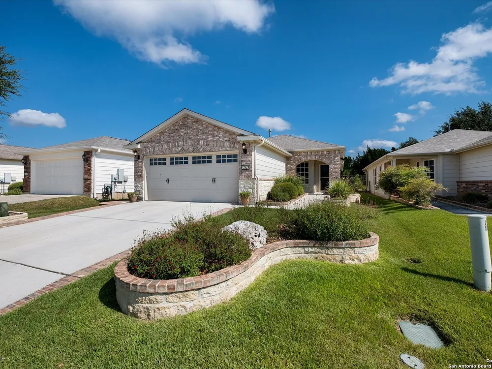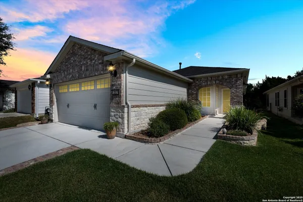 Welcome to Hill Country Retreat, a vibrant 55+ Del Webb community! This thoughtfully designed home features 2BR/2BTH and an additional flex-space currently used as a home office. The open layout is perfect for both relaxing and entertaining, with a spacious living area and elegant tray ceiling, a modern kitchen with gas cooking and granite countertops, and a peaceful primary suite with a walk-in closet and en-suite bath, no carpet throughout! Solar shades offer indoor comfort from the Texas sun. Freshly painted interior and exterior, new roof 2025, newer water heater, all appliances convey! Attached garage has 5 additional feet, with overhead storage and shelving. Enjoy resort-style amenities including a clubhouse, fitness center, indoor and outdoor pools, pickleball and tennis courts, walking trails, and a full calendar of social activities and events. Whether you prefer a quiet morning on the covered patio or lively evenings with new friends, this community offers the perfect balance of comfort, connection, and convenience. Located near shopping, dining, healthcare, and major highways, this home offers everything you need to live your best life!