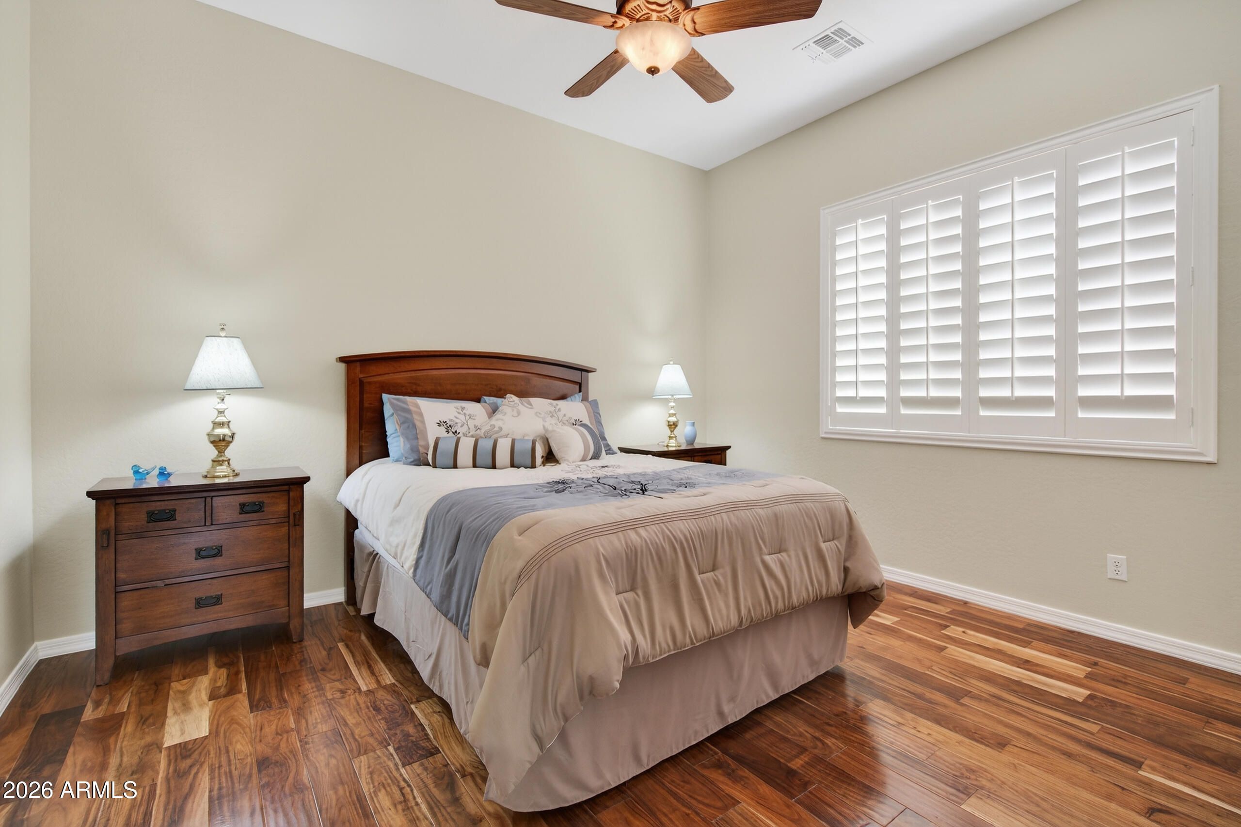 Beautiful Maintained Home is The Highly Sought-After Cambria Model. Features Detached Casita w/ Privacy for Guests. From the Moment You Step Inside, You'll See Elegant Upgrades & Features. Freshly Painted w/ Acacia Hardwood Floor in all Bedrooms. Kitchen has Granite Counters, Sky Light, Above & Under Cabinets Recessed Lights, 2 Ovens, R/O Water System, New Disposal, Seated Breakfast Bar & Pull Out Shelving w/Cabinets. Also Plantation Shutters T/O, Culligan Water Softener, Massive Laundry Room w/ High End Maytag Washer/Dryer w/ Granite Counter, Bar Area, Flex Room. Garage is Extended 8 Feet & has an A/C Mini Split keeping it Cool All Year Long. Plus Work Bench, Overhead Storage & Tons of Cabinets. Outdoors: Solar Heated Pool w/Waterfall. 25X10 Retractable Shade Awning, New Built-in Barbecue