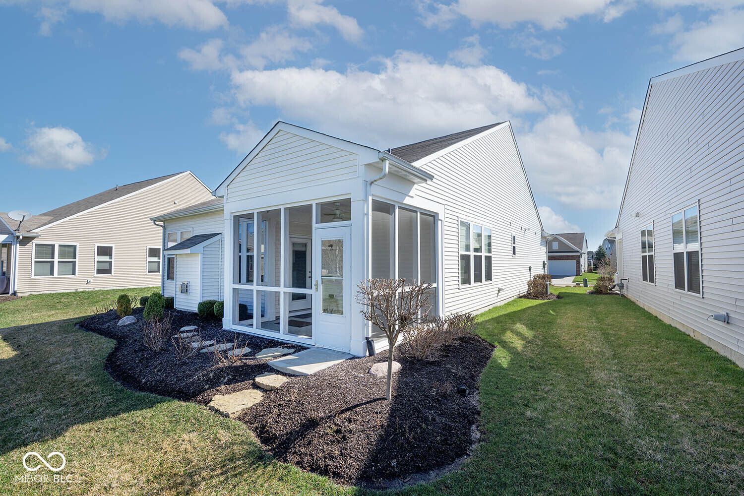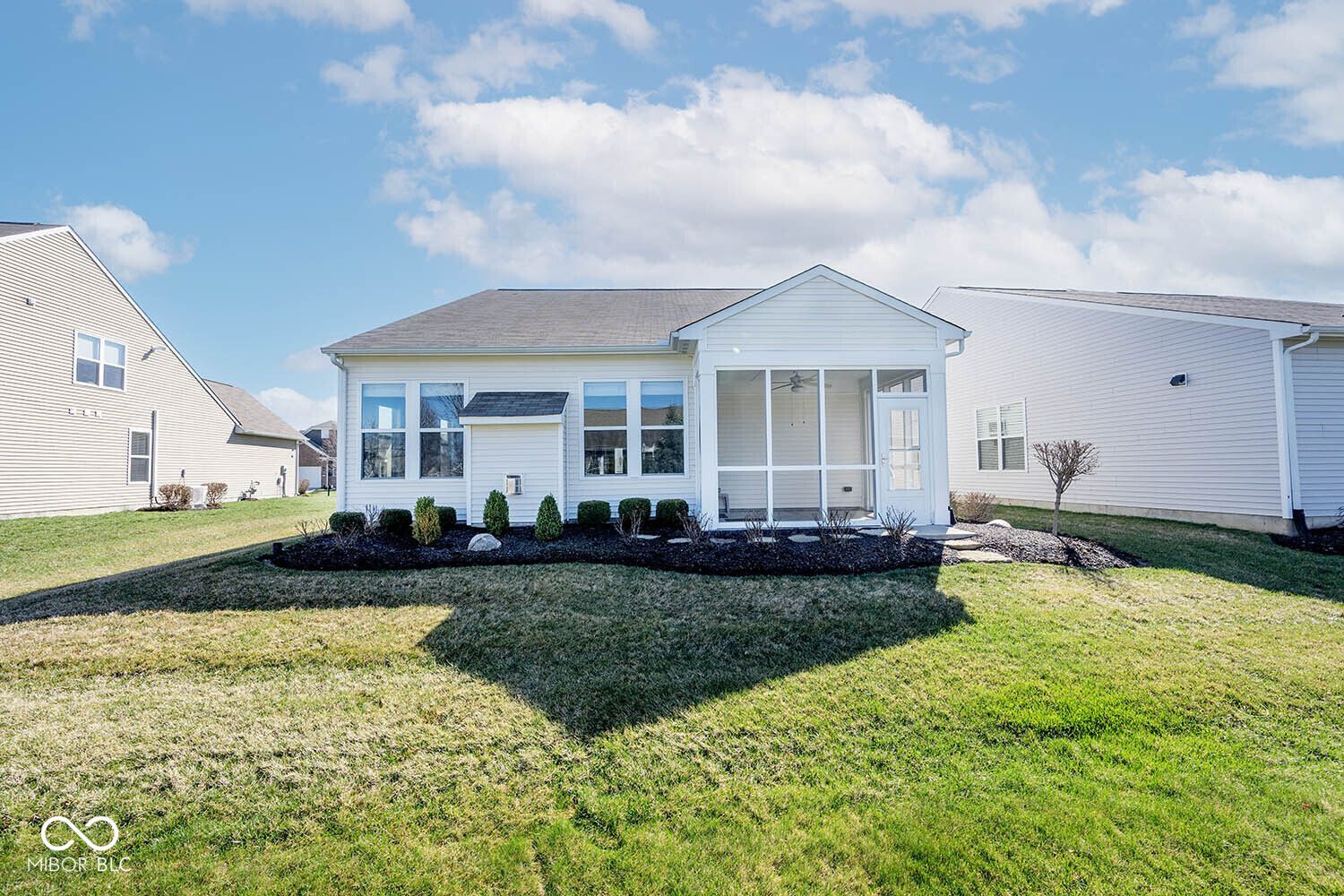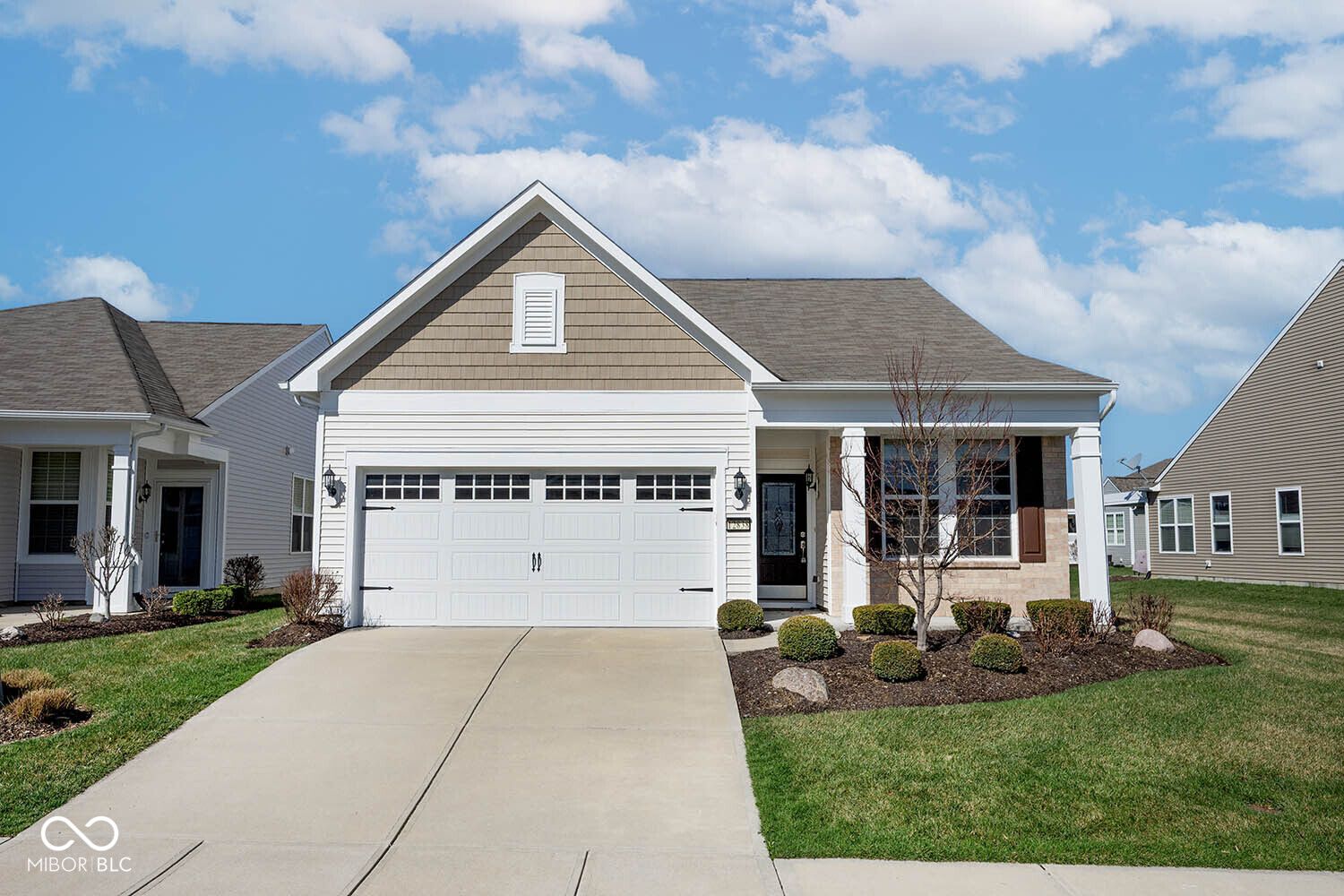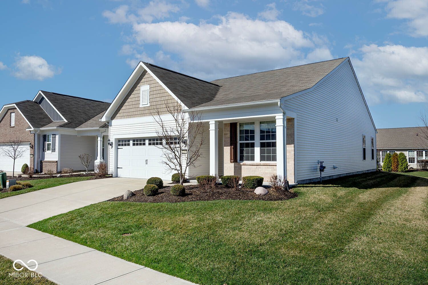Welcome home to Fishers Del Webb 55 and Active Britton Falls Community! This immaculate property boasts a spacious 2 Bedroom, 2 Full Bath, Finished 2 Car Garage Home situated on semi private street which was just freshly painted throughout making this home truly move in ready. The open and airy floor plan is perfect for entertaining guests. The highlight of this home is the chef-inspired kitchen, complete with a beautiful center island, granite counter tops, stainless steel appliances including natural gas stove, french drawer refrigerator, microwave, dishwasher, subway tile backsplash plus creamy white cabinets. The kitchen is open into the great room with convenient gas fireplace and dining room areas, making it the heart of the home. Owners Suite features a tray ceiling, bathroom with double sinks, stand up shower with glass doors. Split bedrooms allowing the 2nd bedroom area next to the full bath/powder room perfect for guests, office or den. This home is full of upgrades that you would expect in a higher-end properties, including a large entryway with wainscoting panels, walk-in closets, low maintenance luxury vinyl plank floors, crown molding, raised ceilings, gas fireplace, water softener and level room which includes washer and dryer, plus enjoy your morning coffee or unwind on the 13x9 screened back porch. All of the amenities Britton Falls has to offer with a wonderful club house which includes: indoor/outdoor pools, fully equipped exercise room, tennis, pickleball and bocce ball courts as well as endless clubs and social activities throughout the year. This one won't last long so schedule your appointment today!