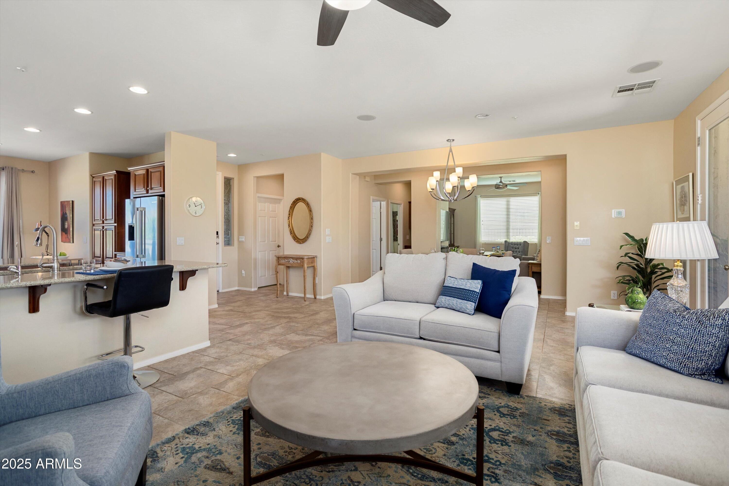 MAGNIFICENT PRIVATE BACKYARD RETREAT plus UPGRADES/UPDATES GALORE! ROOF UNDERLAYMENT BEING REPLACED SOON. Pristine curb appeal & landscaped paver front courtyard. VERY PRIVATE backyard surrounded by lush mature landscaping. HUGE EXTENDED PATIO with large, staggered tile on covered patio & pavers on the extended. BUILT-IN BBQ & GAS FIREPIT. Leased SOLAR + TRANE XR HVAC-2023-HugeSavings! Whole house water filtration. Beautiful UPGRADED KITCHEN--engineered stone counters, staggered raised square panel cherry wood cabinets, stainless GE Profile appliances, Bosch French door refrigerator, sliding glass door to courtyard, CUSTOM BUILT-IN DESK & UPPER CABINETS in eat-in area of kitchen. LARGE STAGGERED TILE throughout except bedrooms w/textured carpet. Great room has BUILT-IN CUSTOM MEDIA CENTER & area for dining. Primary suite--CLOSET ORGANIZING SYSTEM by Classy Closets, bath with newer marble tile shower surround & dual sinks with engineered stone countertop. Guest bath stunning newer tile surround in tub/bath. The den is a multiple use room: 65" TV with a cozy electric fireplace. The coffee table rotates up providing a table. Watch TV and have dinner in front of the fireplace on a chilly winter evening. Coffee table is on wheels and can easily be moved against the wall to open the sleeper couch. The sleeper couch is not an ordinary, uncomfortable bed, but has 3 thick foam pads and makes a comfortable Queen bed. The folding panel can be closed for privacy. GARAGE EXTENDED 4', epoxy floor, lots of storage space with wall of built-in cabinets, pedestrian door, work bench with lots of hand tools, older refrigerator for extra use. TURN-KEY-Furniture & furnishings available for $1.00 at Close of Escrow! Located in award-winning gated, 55+ Trilogy at Vistancia with 5-star-resort style amenities at the 35,000 SF Kiva Club with indoor & outdoor pools, fitness center, day spa, cafe, billiards, meeting rooms, library, tennis courts, pickle ball, bocce ball, events & a plethora of activities to choose from. Outstanding Gary Panks-designed golf course is woven throughout the neighborhood. The Mita Club has additional community amenities. Easy access from Trilogy to the 303, shopping, restaurants, entertainment, Lake Pleasant & Paloma Park.