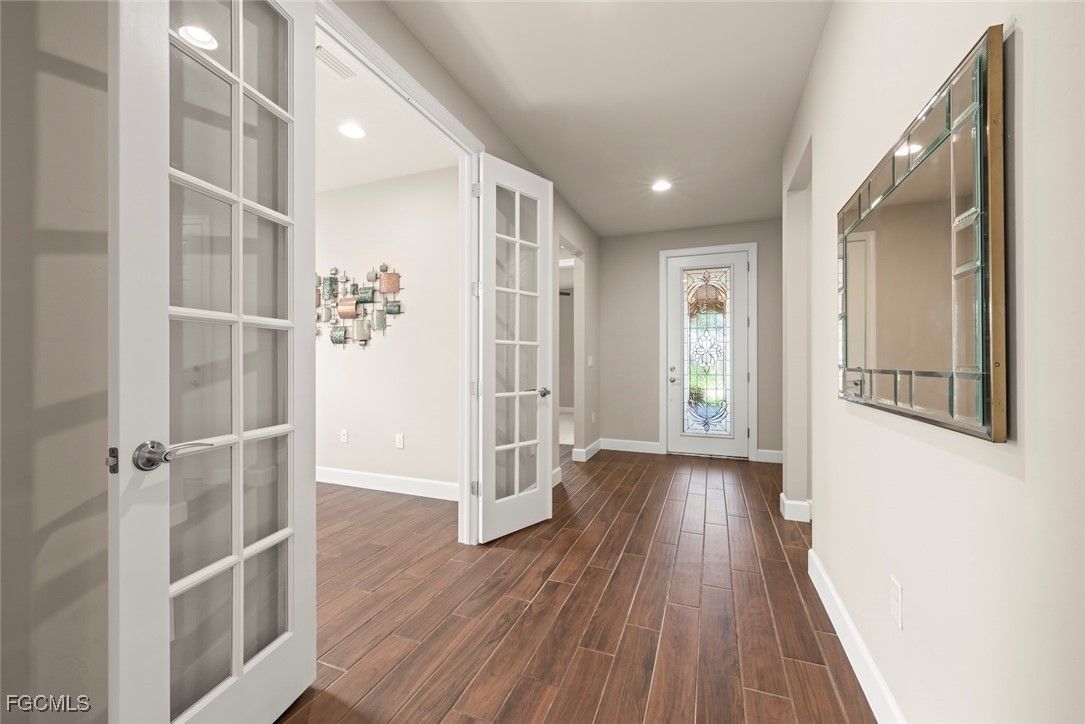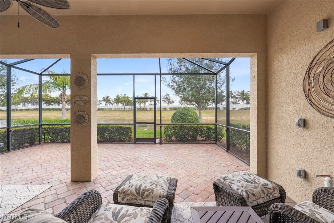 This Immaculate Summerwood home invites comfort, luxury, and presents the Florida lifestyle. The 3+den home has many options. The Summerwood floor plan offers plentiful open floor living space to enjoy a perfect setting for relaxing and entertaining. A large Sunroom with floor to ceiling pocket hurricane slider doors that leads you to your newly screened lanai with a water view. Custom lead glass front entry door, Ceiling trays, Custom lighting. Generous Master suite with an extra-large walk-in closet. Separate Master bath has dual sinks, soaking tub, and separate shower -French glass doors lead into the office/study - Custom wood shutters throughout the home. Tub in utility room and garage -Upgraded 36x6 Porcelain walnut tile floors throughout the main living area & plenty of natural light flow throughout the home's airy layout. Garage has drop down stairs for ample storage. Impact windows throughout the home. Come and enjoy the wonderful neighborhood amenities of THE PLANTATION including optional private membership golf, pool, exercise room, restaurants, tennis & more. Minutes from SW Florida International Airport, quick access to I-75. Schedule your private showing today.