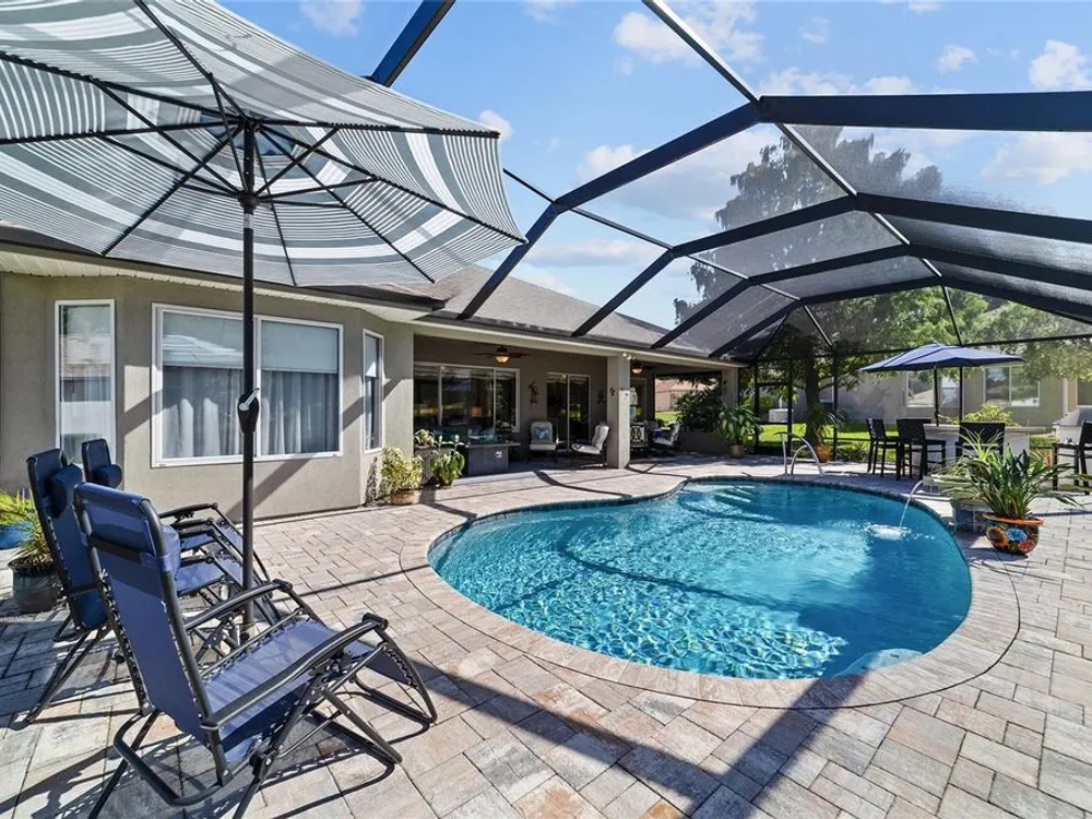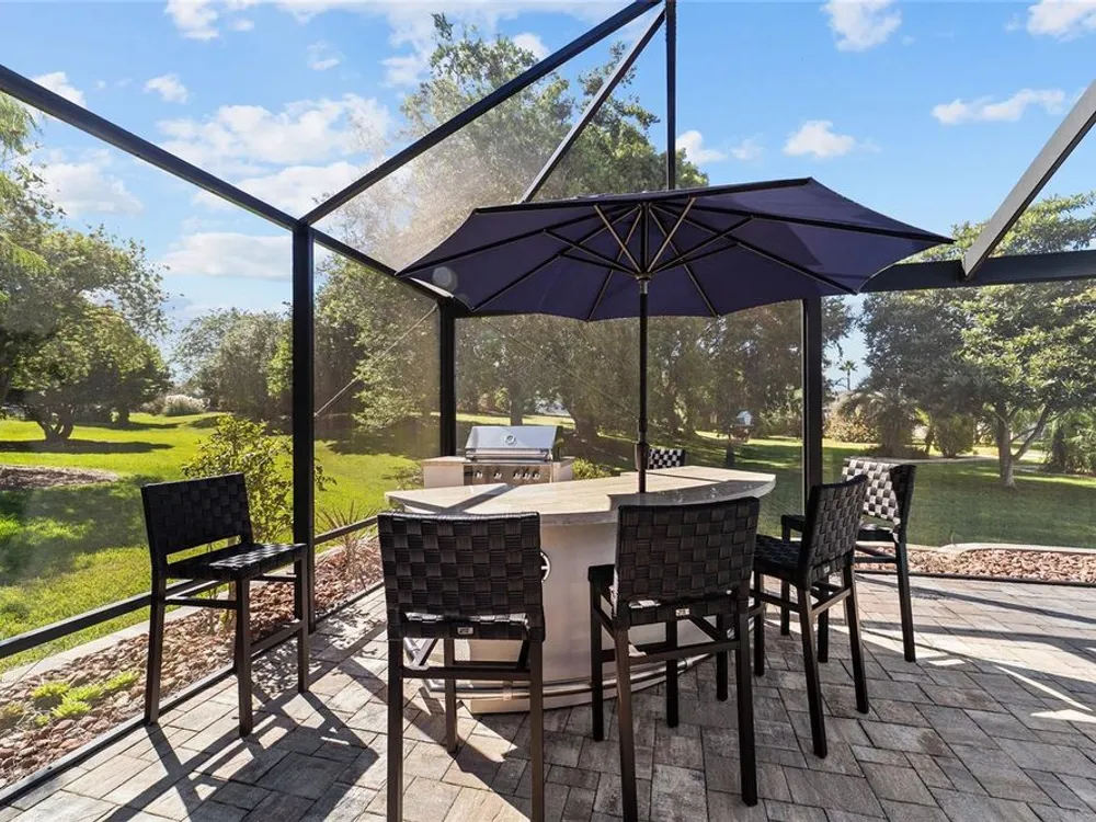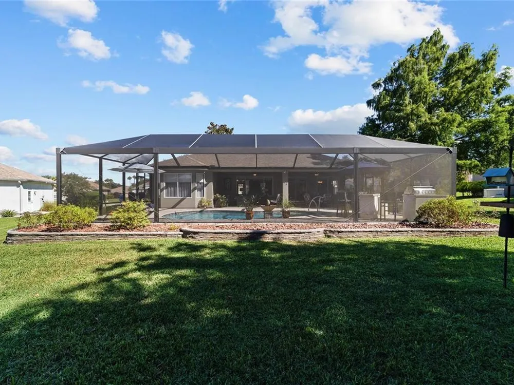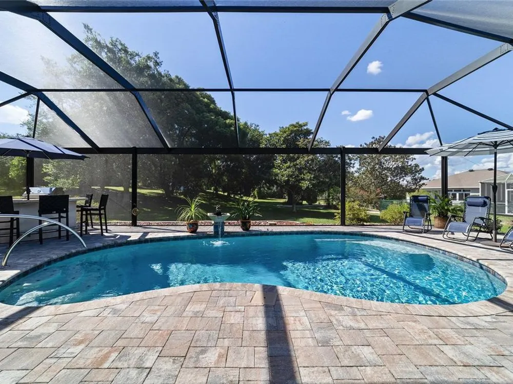 This Madeira Model pool home is located in the heart of Del Webb Spruce Creek Golf & Country Club. Boasting 2 bedrooms, 2 baths, plus a den/office area along with a renovated kitchen that features solid wood painted cabinets, premium granite counter tops, under cabinet lighting, solar tube, a new stainless-steel gas range with range hood, and breakfast bar all adjacent to the dining area. Enhanced touches such as crown molding and powered window shades. The Owner’s Bathroom has dual sinks and a tiled shower with glass enclosure. All floors in the home are tile with bedrooms having a wood grain finish. Ready for your enjoyment is an oversized screened lanai enclosing the pool area giving you an oasis to relax and enjoy the Florida weather. The Southeast facing home allows mornings to be cool to enjoy your coffee and ponder your day’s events while looking at your backyard. The afternoon is the perfect time for floating or swimming in the 6 ft deep kidney shaped saltwater pool. The pool is heated so that you can enjoy swimming even when the weather turns cool. This living space includes an outdoor kitchen and bar area, seating area with fire table, and table with chairs to enjoy eating outside (outdoor furnishing convey). This home combines comfort and style making it an ideal oasis. The 2-car garage with golf cart garage includes extra overhead storage for those holiday decorations, a small workshop, and tub sink. Don't miss this opportunity to own this wonderful piece of Florida. Schedule your private showing today and experience firsthand what makes this home so special.