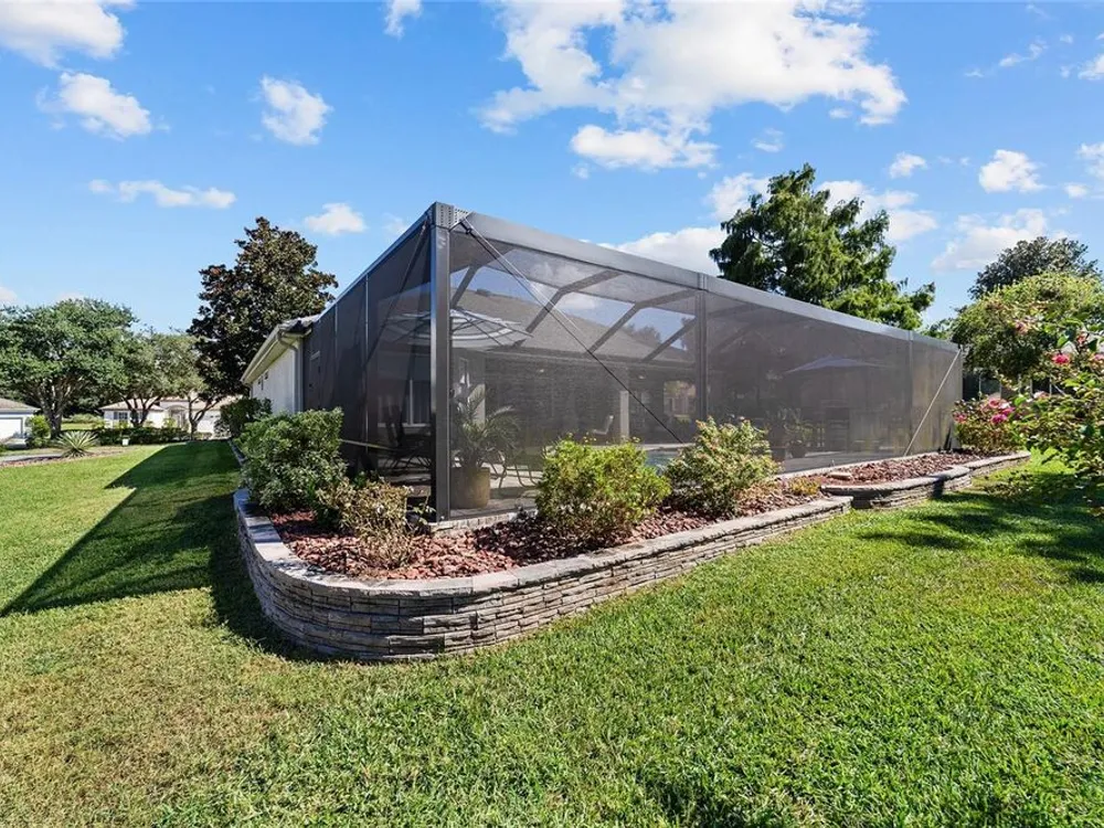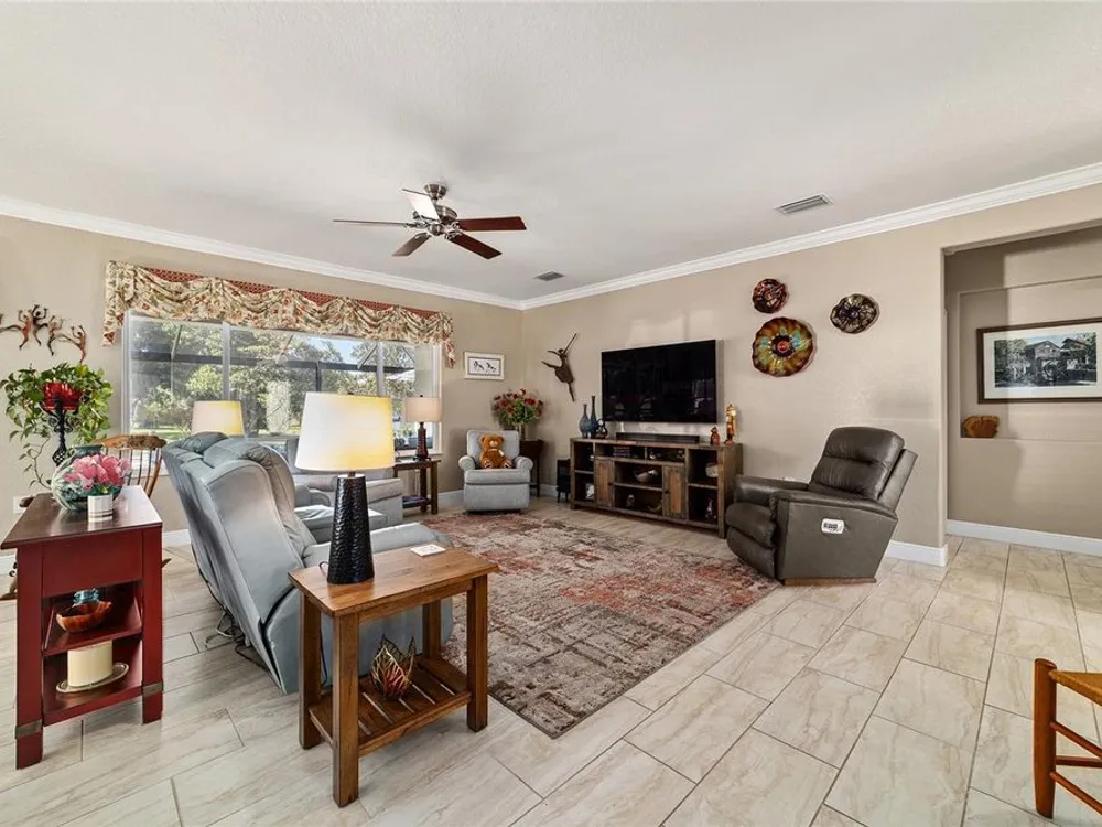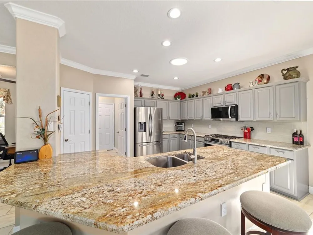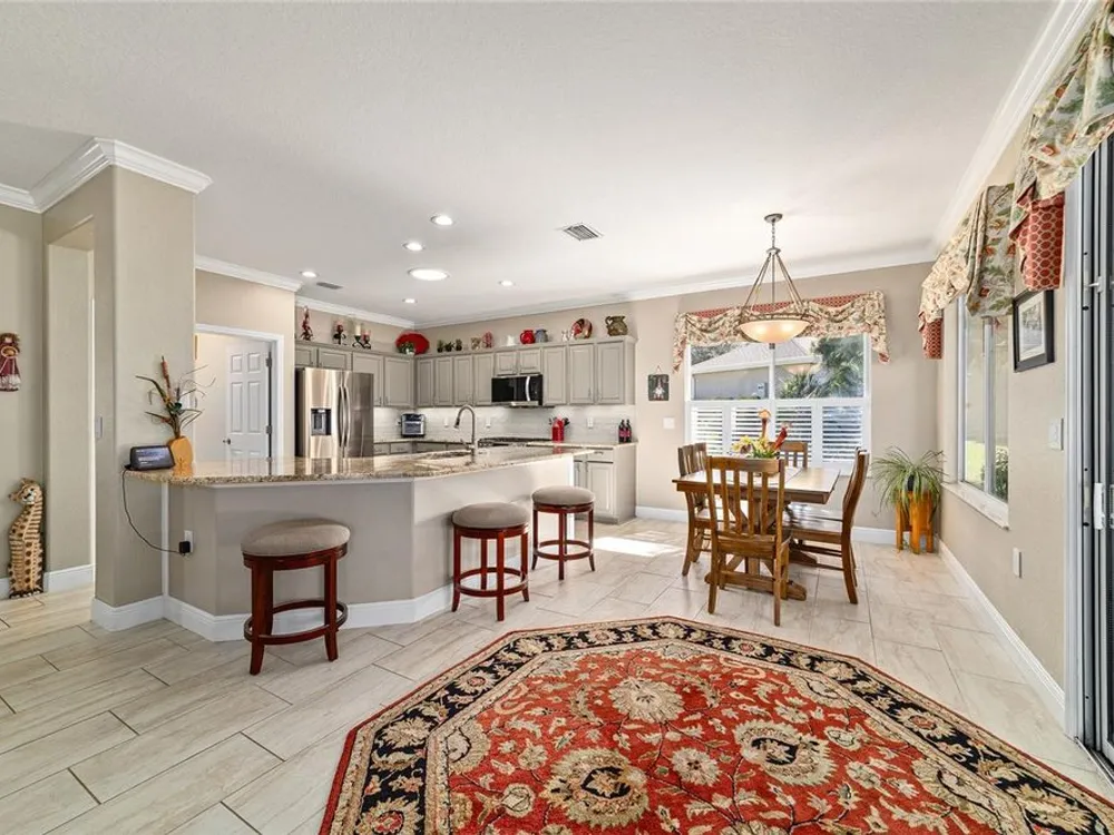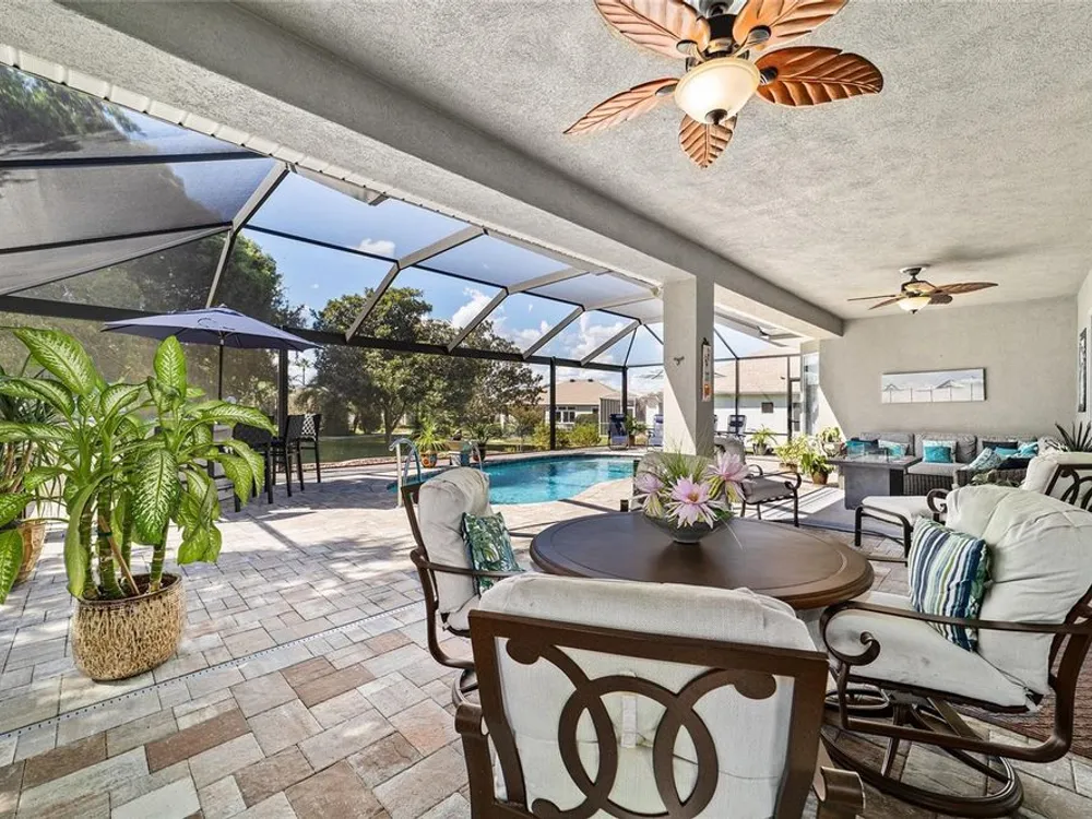 This Madeira Model pool home is located in the heart of Del Webb Spruce Creek Golf & Country Club. Boasting 2 bedrooms, 2 baths, plus a den/office area along with a renovated kitchen that features solid wood painted cabinets, premium granite counter tops, under cabinet lighting, solar tube, a new stainless-steel gas range with range hood, and breakfast bar all adjacent to the dining area. Enhanced touches such as crown molding and powered window shades. The Owner’s Bathroom has dual sinks and a tiled shower with glass enclosure. All floors in the home are tile with bedrooms having a wood grain finish. Ready for your enjoyment is an oversized screened lanai enclosing the pool area giving you an oasis to relax and enjoy the Florida weather. The Southeast facing home allows mornings to be cool to enjoy your coffee and ponder your day’s events while looking at your backyard. The afternoon is the perfect time for floating or swimming in the 6 ft deep kidney shaped saltwater pool. The pool is heated so that you can enjoy swimming even when the weather turns cool. This living space includes an outdoor kitchen and bar area, seating area with fire table, and table with chairs to enjoy eating outside (outdoor furnishing convey). This home combines comfort and style making it an ideal oasis. The 2-car garage with golf cart garage includes extra overhead storage for those holiday decorations, a small workshop, and tub sink. Don't miss this opportunity to own this wonderful piece of Florida. Schedule your private showing today and experience firsthand what makes this home so special.