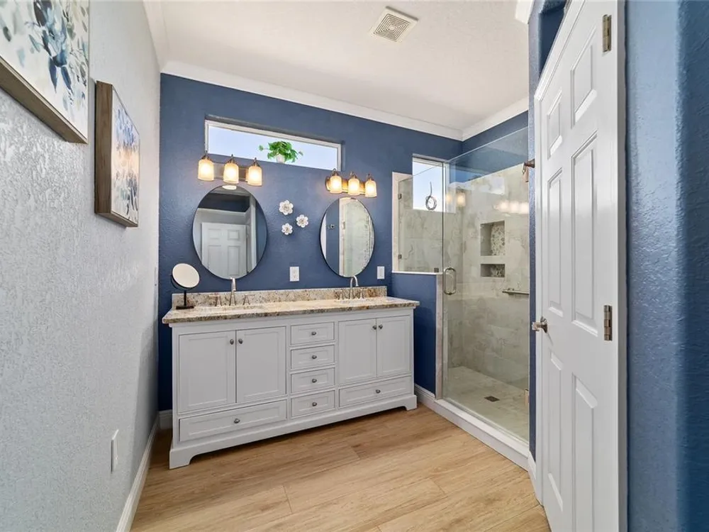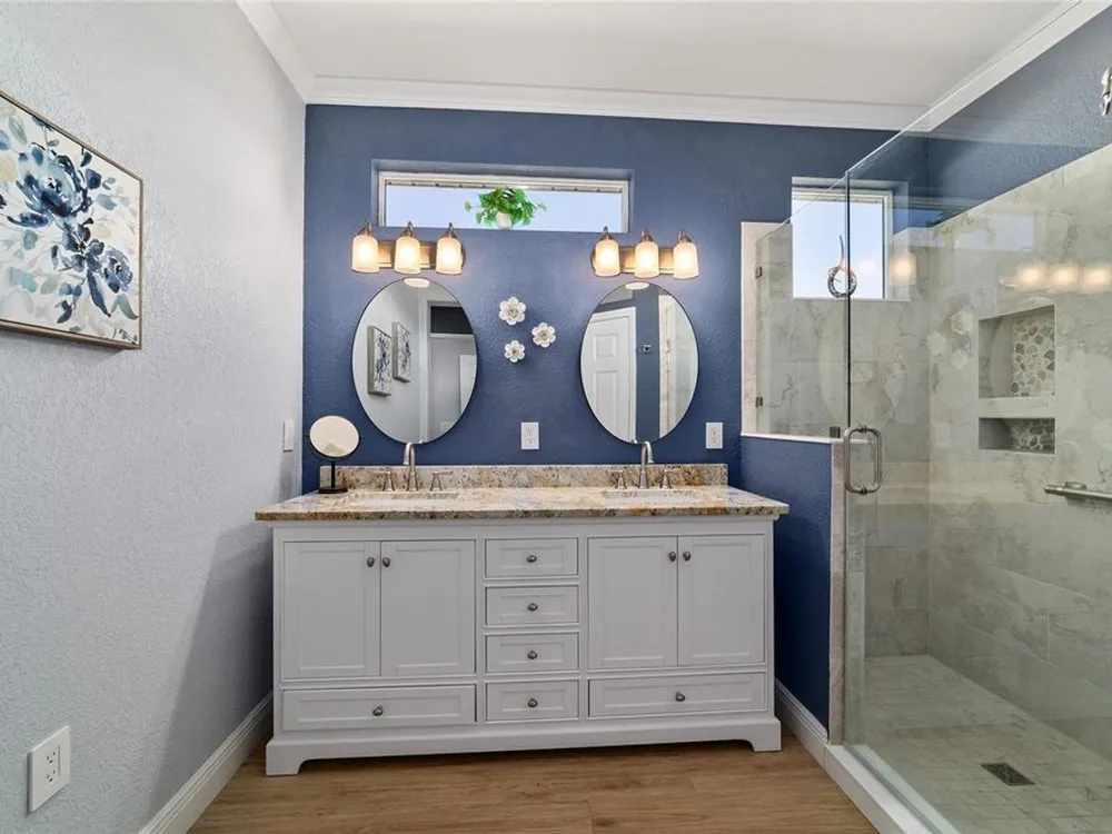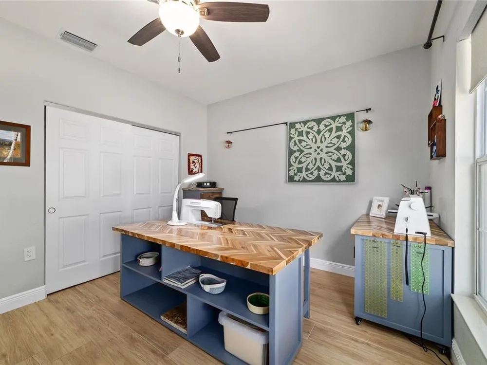 - Ceiling Fan(s), Crown Molding, High Ceilings, Open Floorplan, Main Level Primary, Solid-Wood Cabinets, Stone Counters, Thermostat, Window Treatments