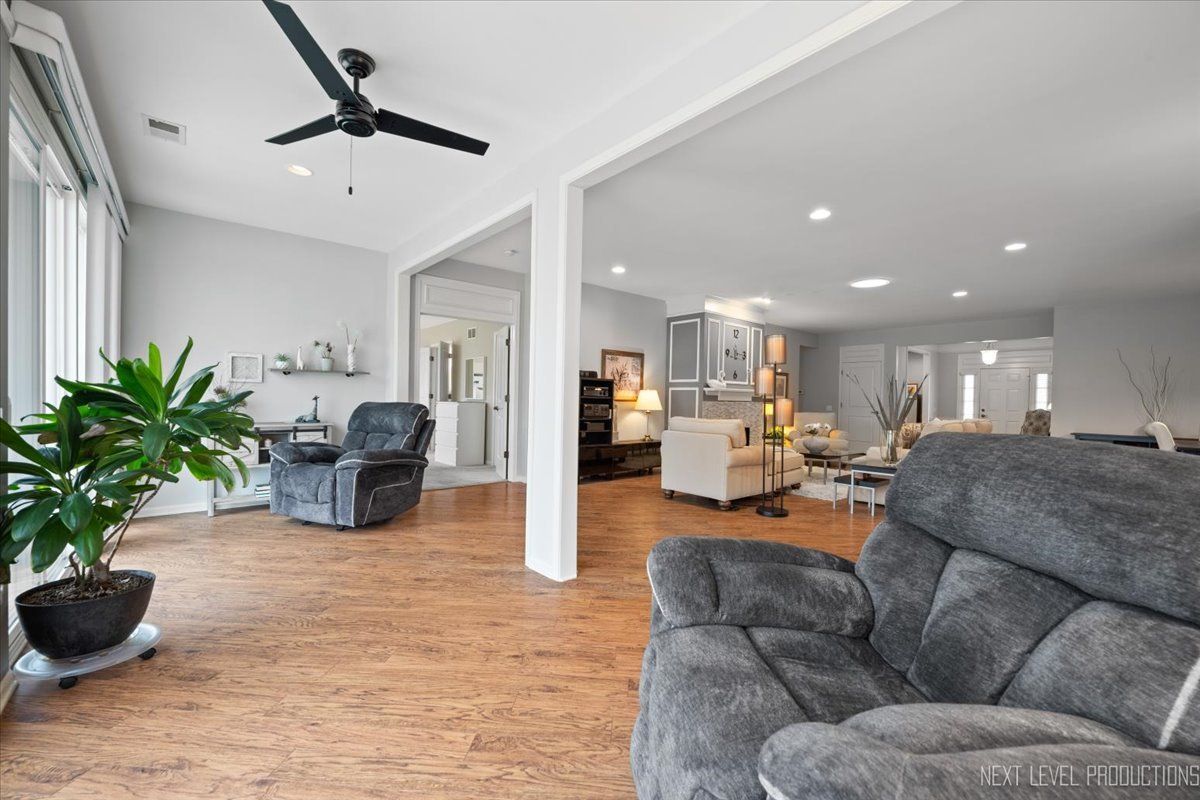 WHAT YOU HAVE BEEN WAITING FOR! The Dearborn Model in Sun City is a 55+ Community with something for everyone - You will be blown away touring this pristine, beautifully updated home on a premium lot. This open concept, sprawling ranch features 2,662 sq. ft. of designed living space. The 3-bedroom, 2-bath, 2 car property combines elegance, comfort, and modern upgrades throughout. Step inside to find LVP flooring through most of the home, tasteful decor, and an abundance of natural light. The spectacular sunroom offers the perfect place for morning coffee or quiet evenings overlooking the peaceful backyard. The spacious family room is at the heart of the home, featuring a centrally located gas-log fireplace, creating an inviting focal point for gathering. The thoughtfully updated and beautifully maintained kitchen is a chef's dream complete with: Double ovens, SS Refrigerator, SS Bosch dishwasher, and gas cooktop. The modern cabinets and sleek tile backsplash elevate this space with warmth and sophistication. The working island and large dining space sets the stage for dinner parties and lingering guests. The butlers pantry is a nice feature that can easily serve multiple duties. At the opposite side of the home, you will find a spacious primary bedroom with large walk in closet. The ensuite is updated with double sinks, soaker tub and step-in shower. There are also 2 additional good sized bedrooms and full updated hall bath. A spacious den/flex room sits at the front of the property just off of the inviting entry. Additional highlights through the home include updated lighting, custom window treatments, fresh paint, an extra-large garage with a workbench area, updated HVAC & water heater. Enjoy outdoor living on the large paver patio overlooking your private fenced-in yard. The property is located on a corner lot backing to open space. Offering privacy and serenity, it is the most perfect spot for entertaining or quiet evenings at home. The 55 + Del Webb Sun City Community has something for everyone: For a low monthly fee take advantage of the Clubhouse, numerous pools, golf, fitness center and pickleball courts. There are activities from gardening to woodworking, and social activities to fill every day of the week. This isn't just a beautiful home, it's a lifestyle. Come and live the GOOD LIFE at 12871 Timber Creek Drive today.