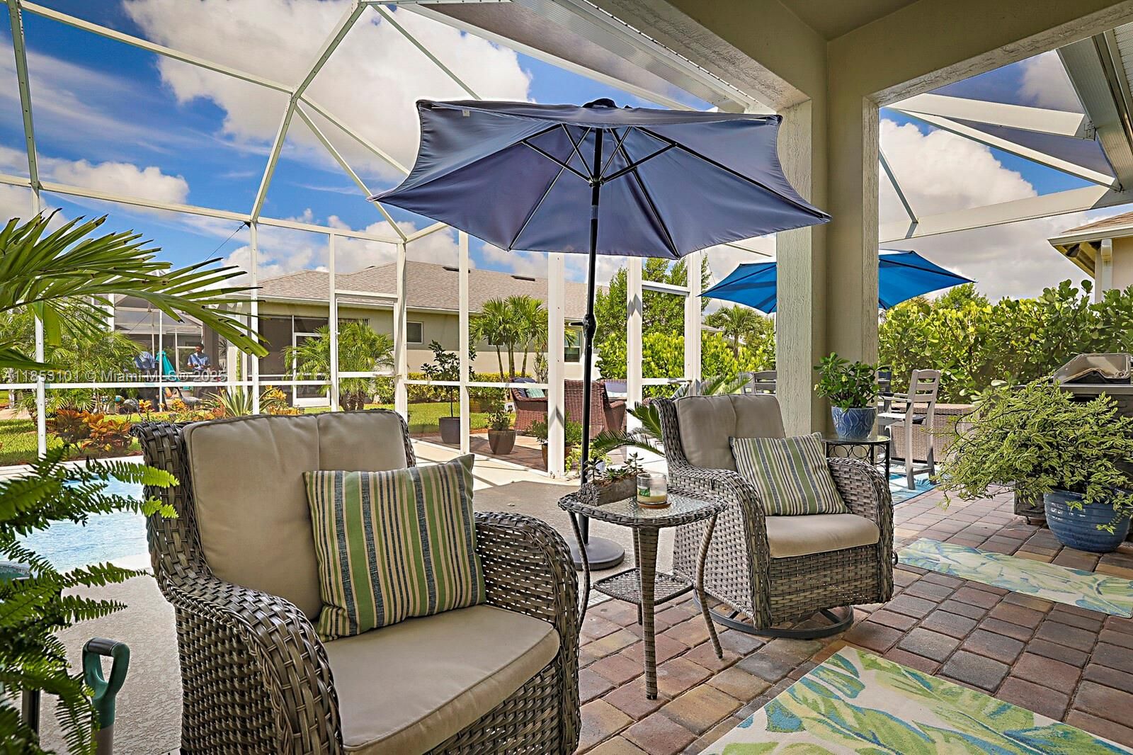 Skip the wait and step into your private resort. This Phase 1 home is loaded with upgrades, featuring a saltwater pool with spa jets, heater, and a screened enclosure—an oasis the builder simply doesn't offer. With mature landscaping, established neighbors, and no construction delays, this residence delivers turnkey comfort and lasting value in one of the community's most desirable phases. This extended layout offers over 2,000 sq ft under air, featuring 2 spacious bedrooms, a den/flex space, and 2 full bathrooms. Step into a light-filled open-concept living area with upgraded tile floors, a gourmet kitchen with a granite center island. WHY WAIT TO BUILD? MOVE IN NOW AND START ENJOYING THE FLORIDA LIFESTYLE YOU'VE EARNED.