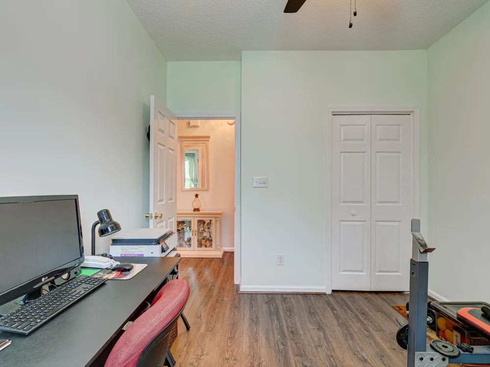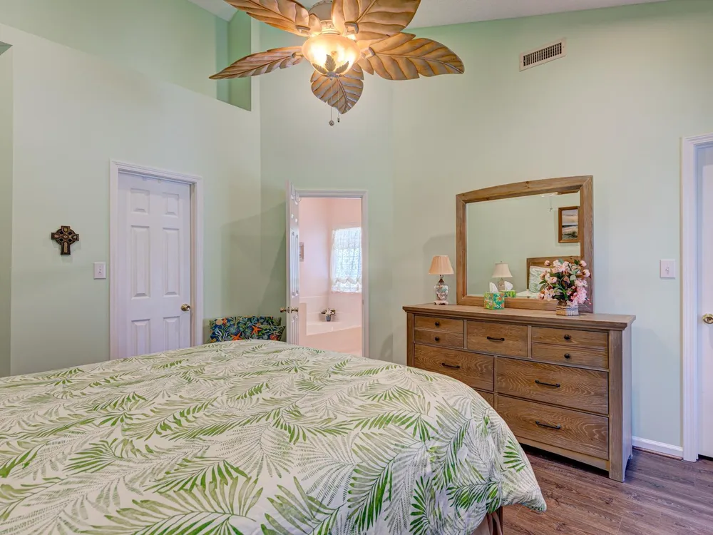 Welcome in to this meticulously maintained single-level home nestled within the golf course community of Indigo Creek! You'll appreciate the instant curb appeal with lush lawn and landscaping in the front as well as the large backyard with golf course and water view. The screened porch access off of the Carolina room and dining room is the perfect spot for enjoying some fresh air. Inviting front entry features a custom door with lead glass window and sidelights and top of the line storm door. Vaulted ceilings in living area, kitchen and primary bedroom afford a spacious feeling. Kitchen features granite counters, glass tile backsplash, breakfast area and appliance upgrades to include a multi-zone refrigerator as well as a double oven that can be used as one large oven. Formal dining room has sliding doors that open to the screened porch. Primary bedroom suite includes 2 walk-in closets, ensuite with glass enclosed shower, separate garden tub and spacious vanity area. This is a MUST SEE!