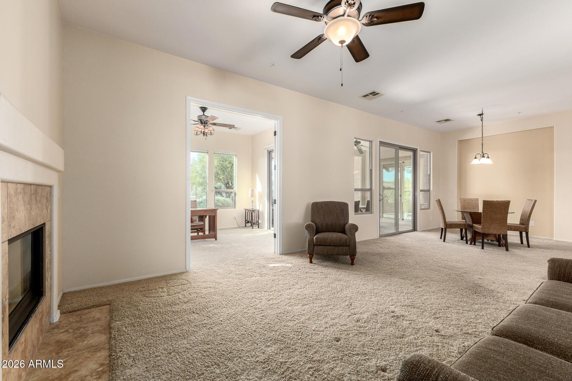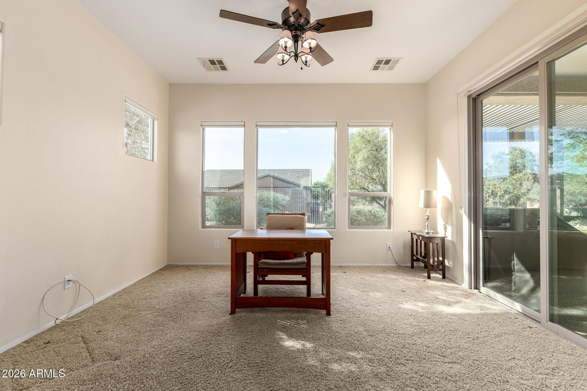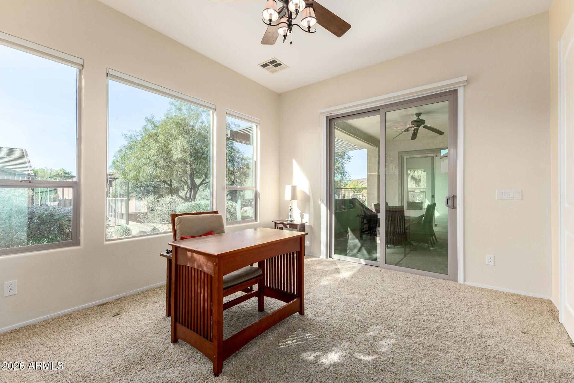 Beautiful home with detached casita and private courtyard located in the desirable 55+ active adult community of Trilogy at Vistancia! Designed for easy living and low maintenance, this home offers an open and inviting floor plan perfect for both everyday comfort and entertaining. The spacious kitchen features ample cabinetry and generous counter space, flowing seamlessly into the bright living and dining areas. The primary bedroom provides a peaceful retreat with an ensuite bathroom with walk in shower and closet. A secondary bedroom with direct access to guest bath offers flexibility. The bonus den/office off living area is flooded with natural light. Step outside to enjoy your private patio -- ideal for morning coffee, evening sunsets, and Arizona's year-round outdoor lifestyle.