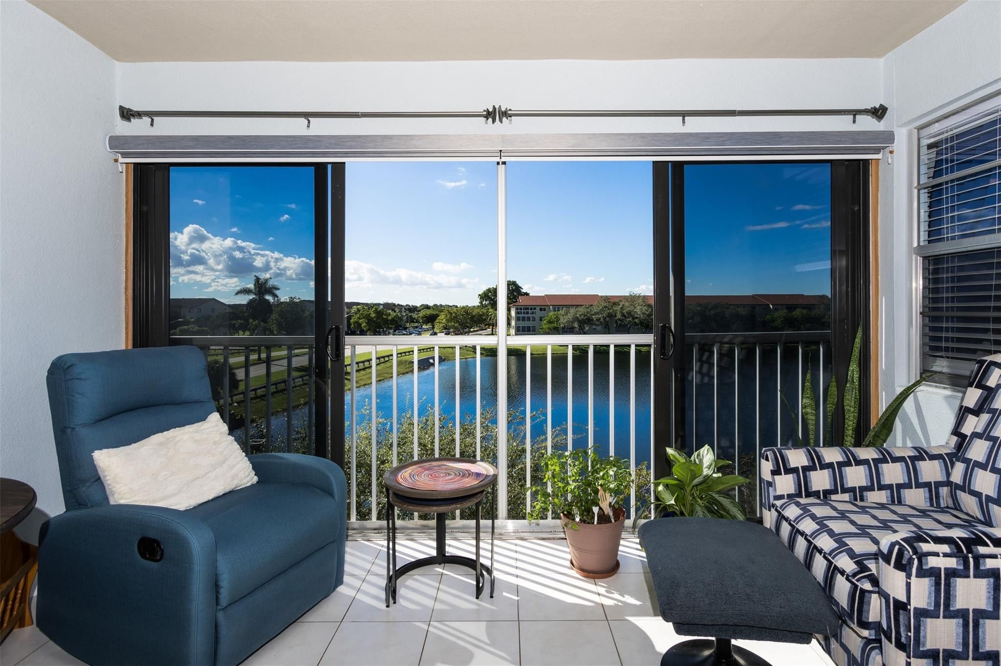 Experience stunning wide lakefront views from this beautifully upgraded 2 BR/2BA residence! The extended, glass-enclosed balcony is a standout feature, offering sweeping water views, added living space, and year-round enjoyment. Outfitted with hurricane-impact windows and motorized shades, it is ideal for relaxing or entertaining in comfort and style. The condo features substantial upgrades throughout, including a modern kitchen with stainless steel appliances, a convection oven with air fryer function & elegant finishes. Additional conveniences include an in-unit washer and dryer. Enjoy an active 55+ lifestyle with resort-style amenities including a clubhouse, heated pools, fitness center, tennis, and a full social calendar.