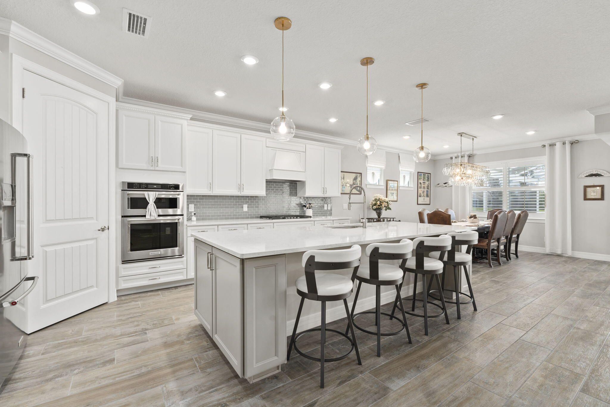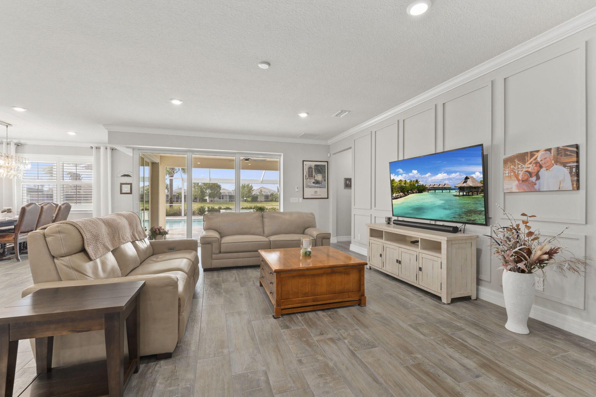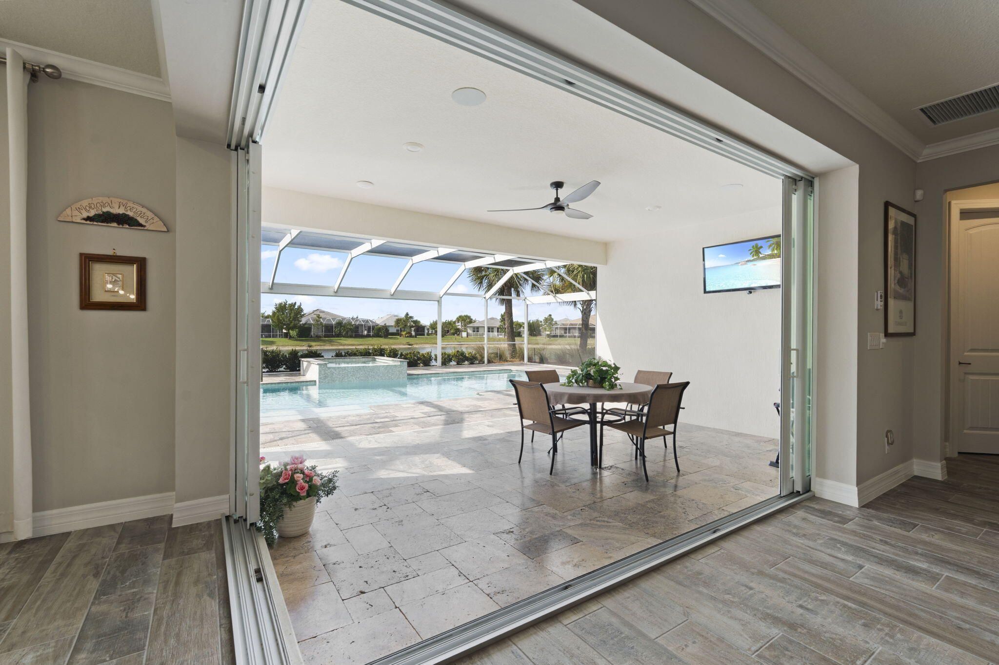 Discover this Magnificent Waterfront Pool Home in Del Webb at Tradition. Experience Elevated Florida Living in this exceptional 2019 CBS-Built Luxury Residence, perfectly situated on a premium- Waterfront Lot. Designed for both Elegance and Functionality, this Home has it ALL! Offering 3 Bedrooms, plus a private office/den, 3 full Bathrooms (including en-suite), and a 3-Car Garage. From the moment you arrive, the Paver driveway and entry set the tone for the quality and attention to detail found throughout. No expense was spared! Step inside this open and spacious layout, enhanced by Wood-Plank Tile flooring, all 8-foot doors, and custom Wainscoting in the main Living Area and Primary Suite, creating a refined yet inviting atmosphere. The Chef's Kitchen is a true showpiece, featuring 42-inch custom Cabinetry with organizers, Quartz Countertops, S/S KitchenAid Appliances on Natural Gas, a custom Hood vent, expansive Island with Bar seating, built-in Pantry, and a custom Wet Bar, perfect for entertaining. A separate Formal Dining Area provides an elegant setting for gatherings. Seamless indoor-outdoor living is achieved through a Zero Corner- sliding glass door that opens to your own private oasis, featuring a screened-in pool, and spa with a Travertine deck, overlooking tranquil Lake Views and breathtaking sunsets. The Spa and Pool features are app-controlled, including lighting and settings, Electric Roll Down shades and a New Pool heater and Pump for peace of mind. The Primary Suite offers a luxurious retreat with a custom built-in walk-in closet, Dual Vanities, and a walk-in Shower. Additional highlights include surround sound throughout the home, plantation shutters, a whole-home Generac Generator, epoxy-coated garage floors with custom cabinet storage, and a well-appointed laundry room. Del Webb at Tradition offers a resort-style, 55+ gated lifestyle with a private clubhouse, state-of-the-art fitness center, pickleball, tennis, bocce, swimming pools, and a full calendar of clubs and social activities. Located within Tradition, Residents enjoy access to a vibrant town center with shopping, dining, entertainment, medical facilities, walking trails, and year-round community events, all just minutes from home. This Waterfront Luxury Home delivers timeless design, modern convenience, and an unmatched lifestyle. Schedule your private showing today.