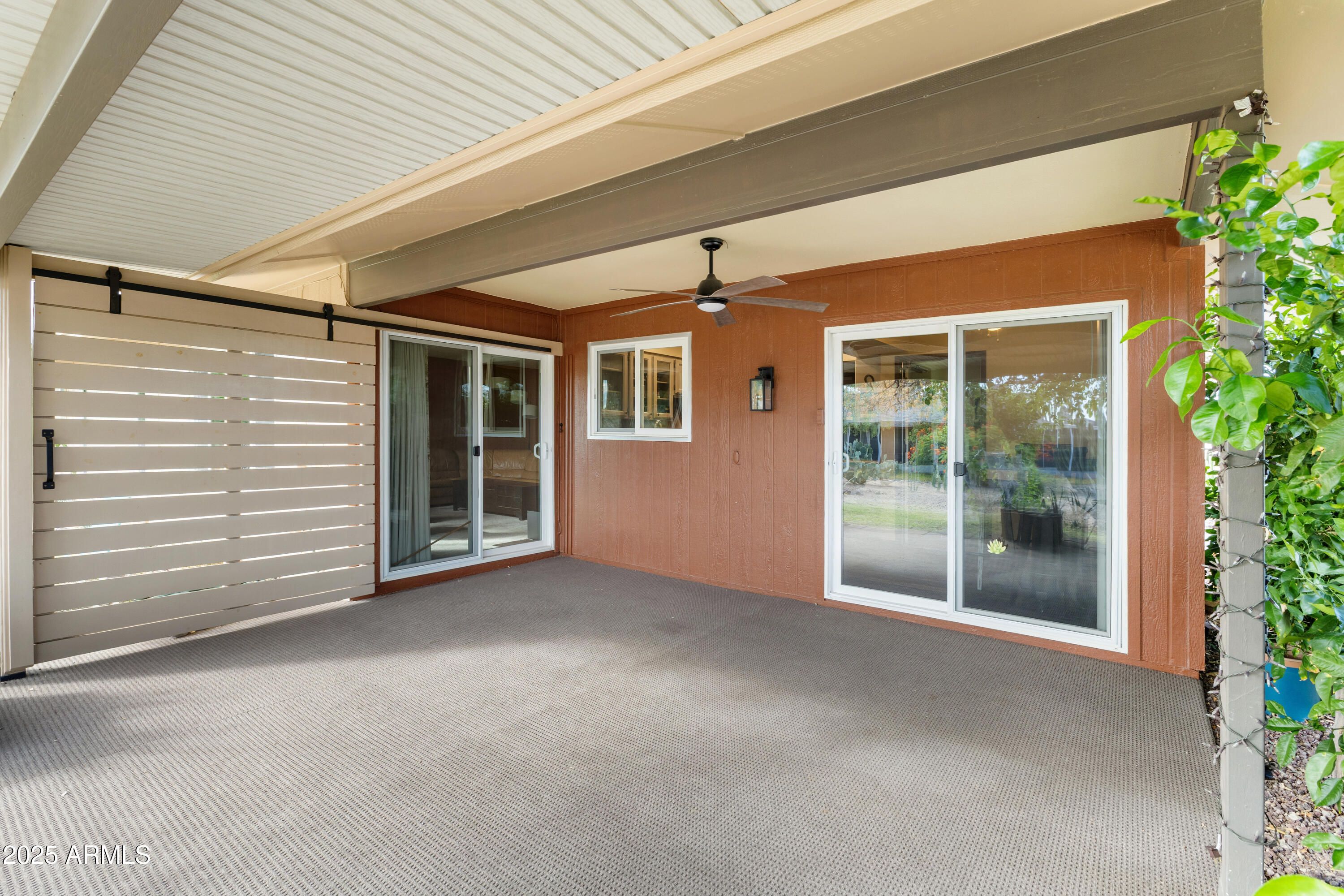 Lovely corner lot in the heart of Sun City West. Enjoy updated landscaping in the front courtyard with porcelain tiles, updated fencing and carpeted entry. There are new vinyl dual pane windows installed throughout. All popcorn ceilings have been removed except for the laundry room and garage. The kitchen features glass front cabinets, undermount sink, non laminate counters, new sink faucet, new lighting over sink, and wall oven. The old ceiling with fluorescent lights was replaced with canned lighting. New interior paint throughout. The extended back patio offers updated landscaping, carpeting, and a privacy rolling door. Enjoy your very own lemon tree right outside your back door. The garage features built-in cabinets and the oversized laundry room can be used for crafts or golf cart storage. This home offers north/south exposure, perfect when relaxing and entertaining in either front courtyard or private back patio. New vinyl flooring in the dinette and kitchen. Newer exterior paint. Solar Hot Water and Solar is owned.
