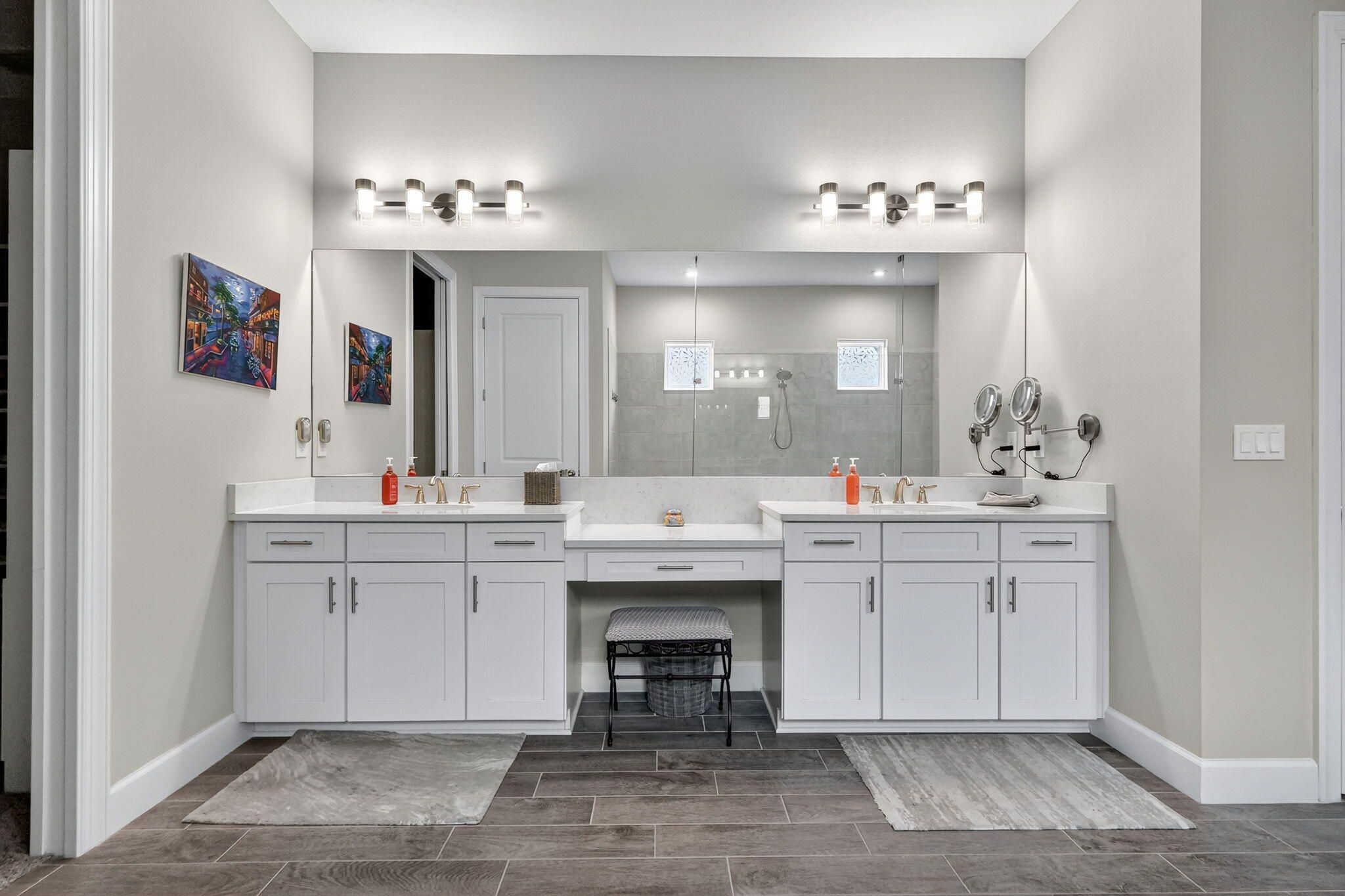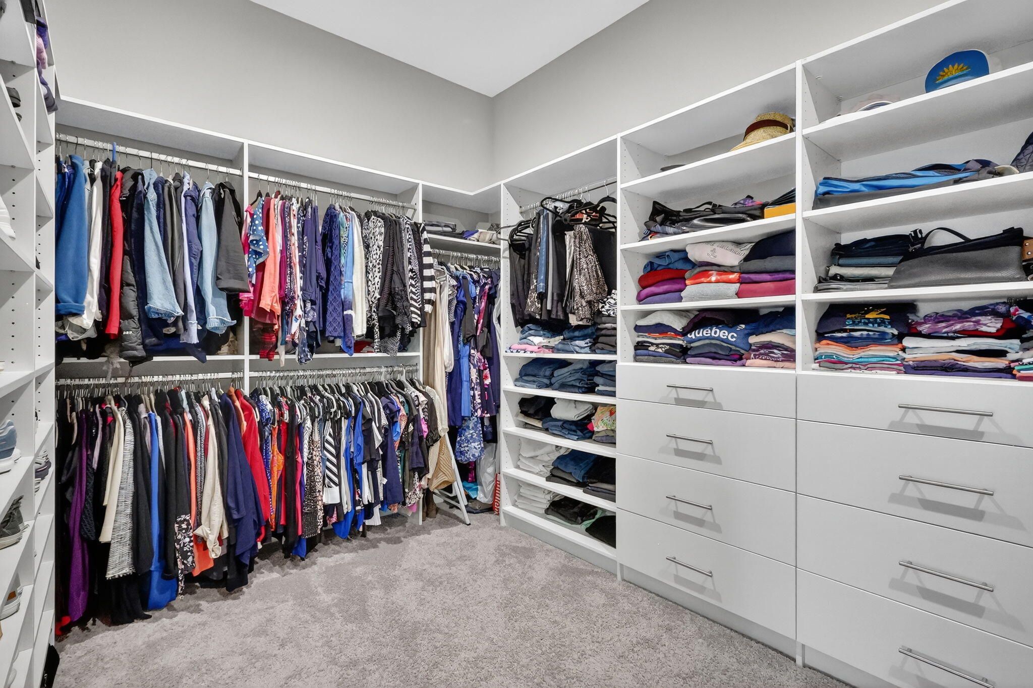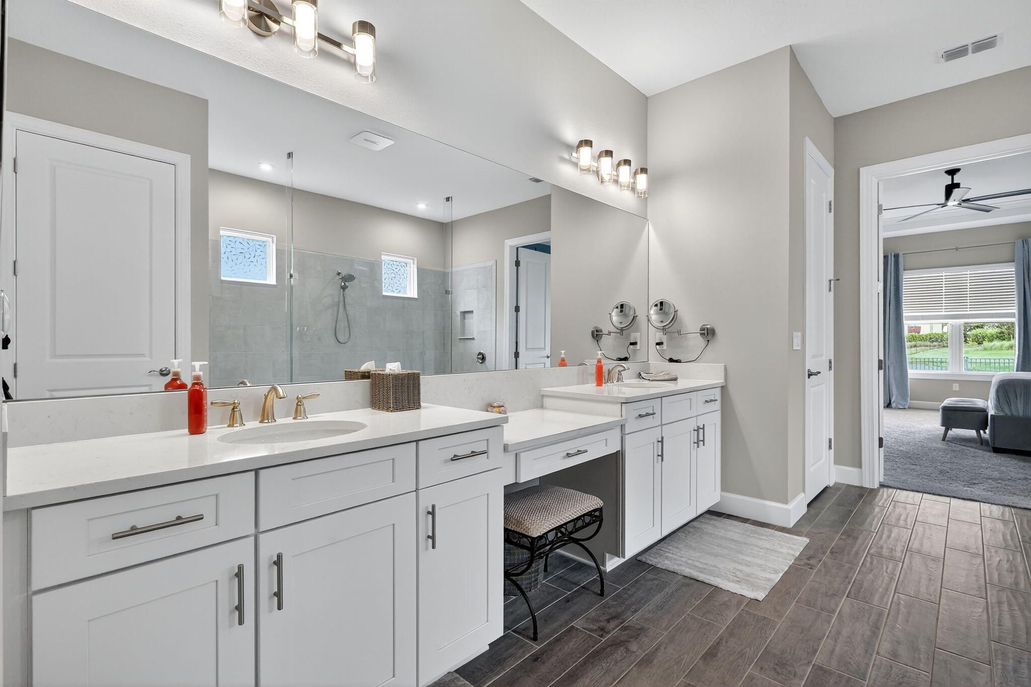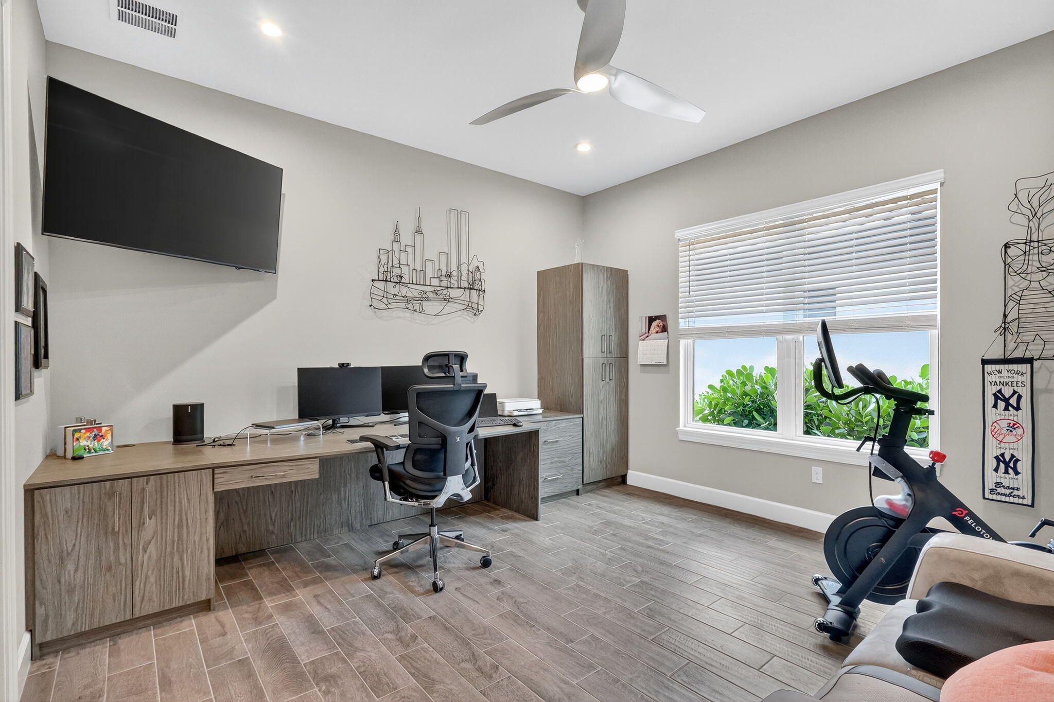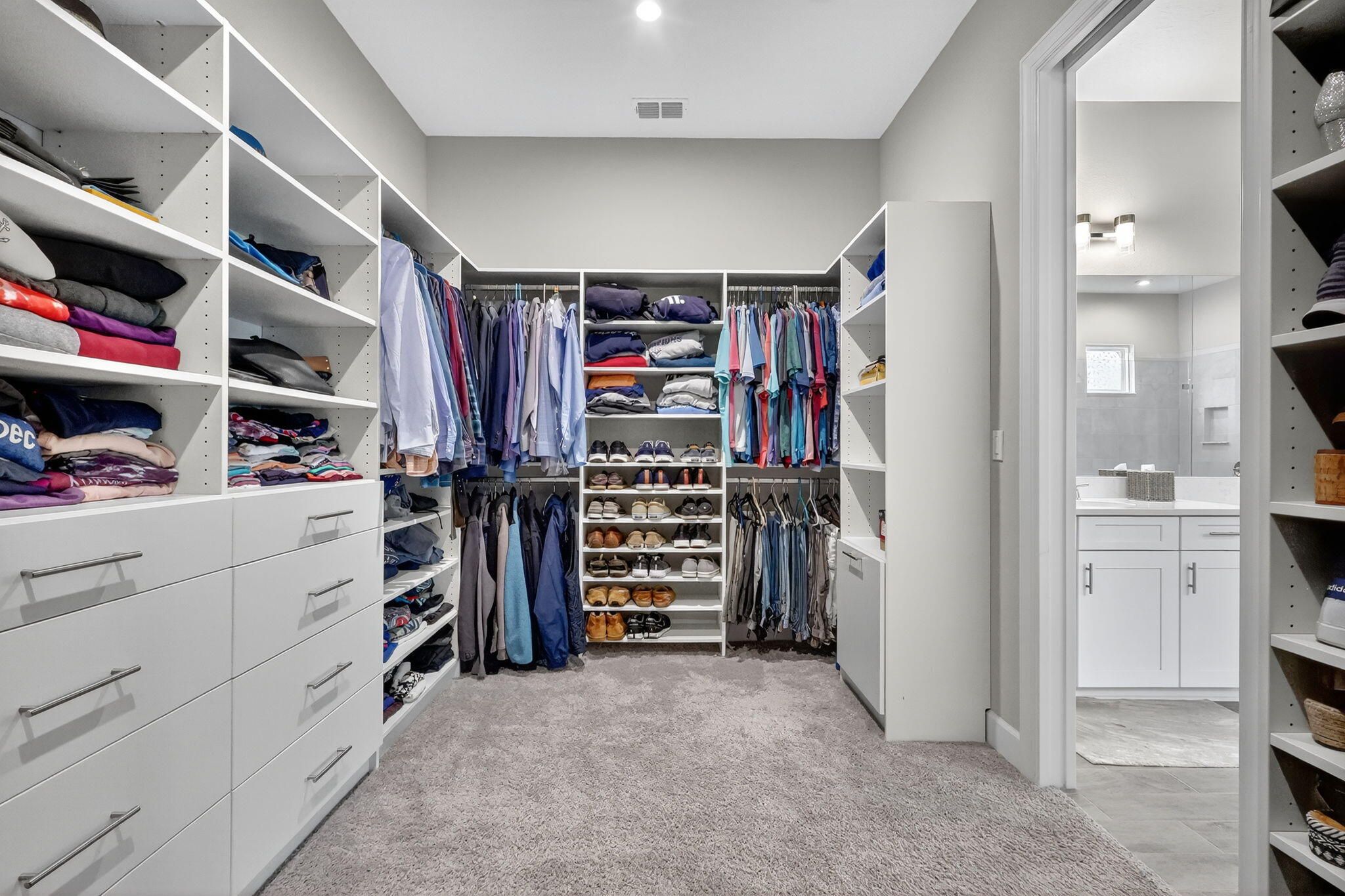 - Built-in Shelving, Closet Cabinetry, Entry Level Living Area, Entrance Foyer, Kitchen Island, Pantry, Split Bedrooms, High Ceilings, Walk-In Closet(s), Home Office, Family Room, Storage, Breakfast Area, Living/Dining Room, Separate/Formal Dining Room, Blinds, Drapes, Electric Shutters, Storm Window(s), Dual Sinks, Primary Downstairs, Separate Shower, Storm Shutters