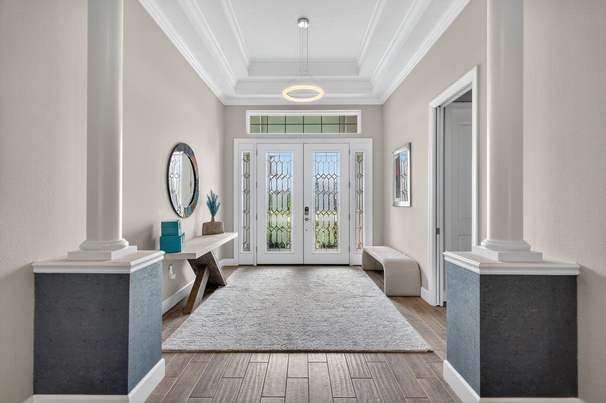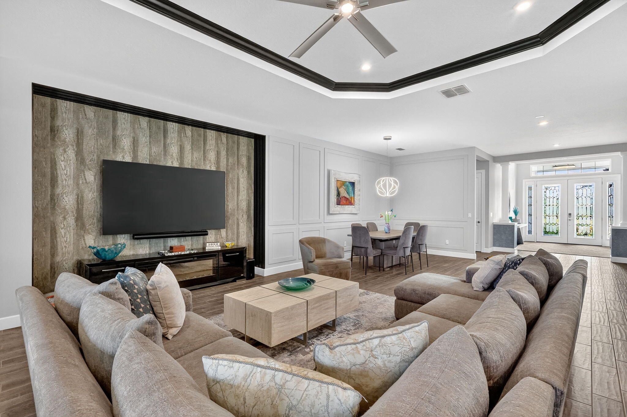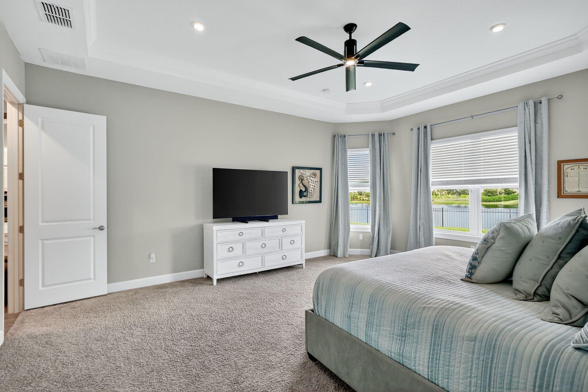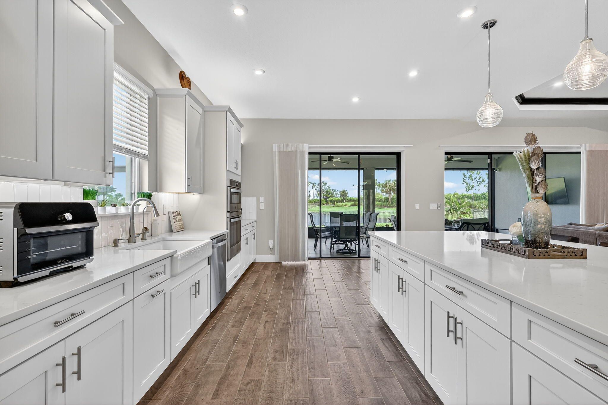 This home is a must see. Located toward the end of the cul-de-sac, this is one of the best waterfront lots in the community. Very private with no homes on opposite side of lake. This 3 year old extended Palazio model offers open concept. Owner added over $200,000 in upgrades and it shows. Gourmet extended kitchen, custom lighting, built-ins in office & laundry room, electric sliding door treatments & custom garage floor. Step out on the screened in Lanai with summer kitchen for entertaining. Rear yard is fenced for you & your pets enjoyment. Full list of upgrades available on request.Esplanade is a 55 plus community like no other. Concierge services for residents and a lifestyle coordinator for the activities. Enjoy the clubhouse, pool, spa, fitness center, tennis, pickle ball,