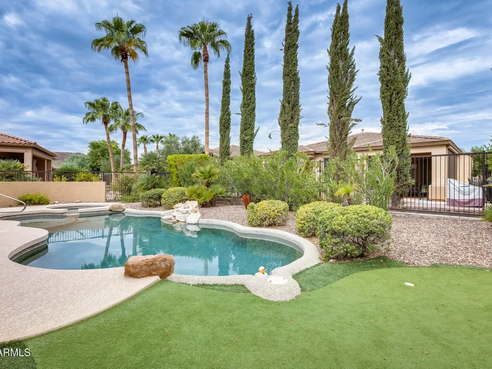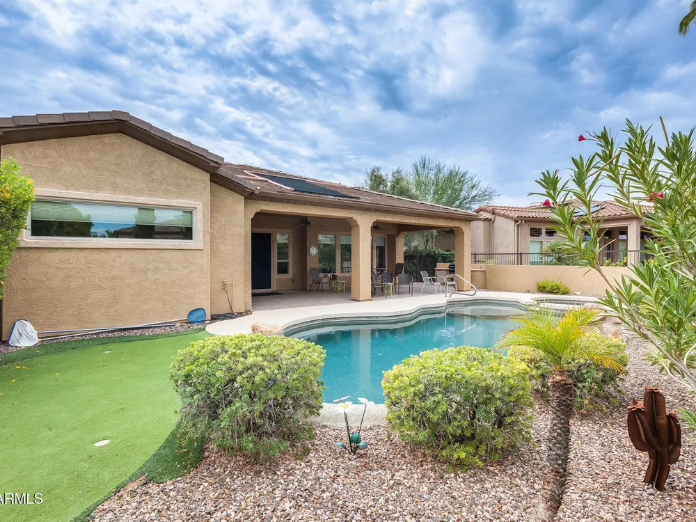 Resort-Style Living in a Vibrant Golf Community! This lovely Tuscan-style home offers 2,336 sqft of beautifully designed space, featuring 3 bedrooms, 2 bathrooms, a den, a great room, and even a guest house! Perfect for entertaining, the backyard is a true oasis with a sparkling pool, water feature, built-in BBQ, golf green, and covered patio for outdoor enjoyment. The gourmet kitchen includes a pantry, large island with breakfast bar, and non-laminate counters, ideal for both everyday living and gatherings. Located in a gated, resort-like adult golf community with endless amenities—clubhouse, pool and spa, workout facility, golf, playgrounds, and more—this home combines luxury, comfort, and convenience. A 2-car garage completes this exceptional property!