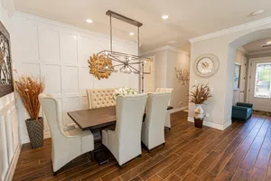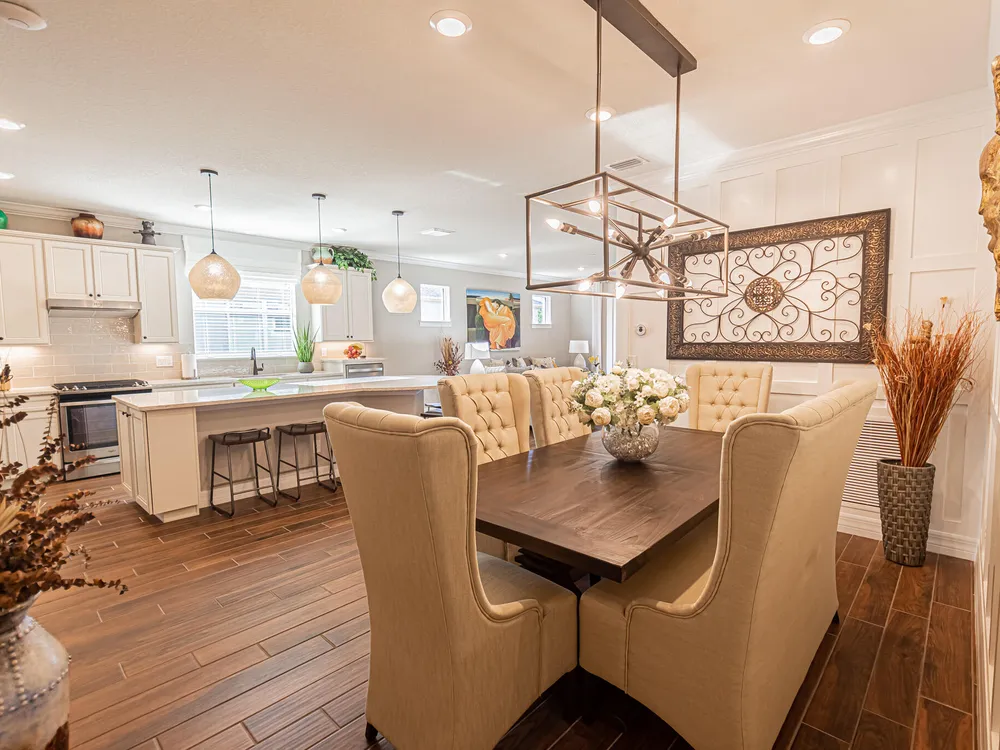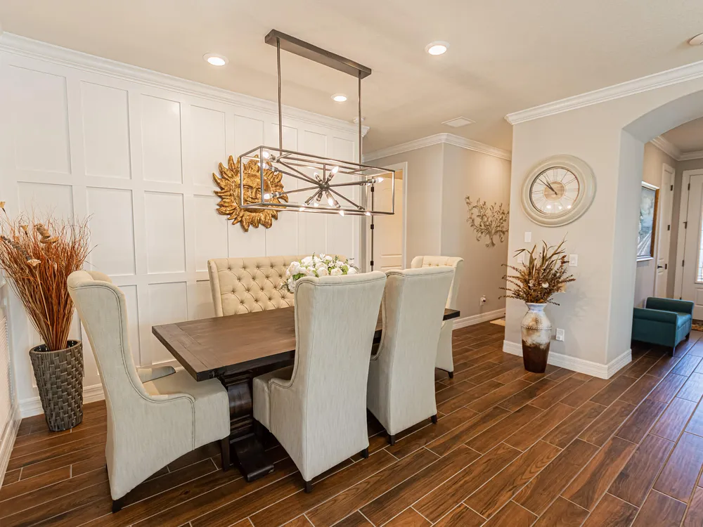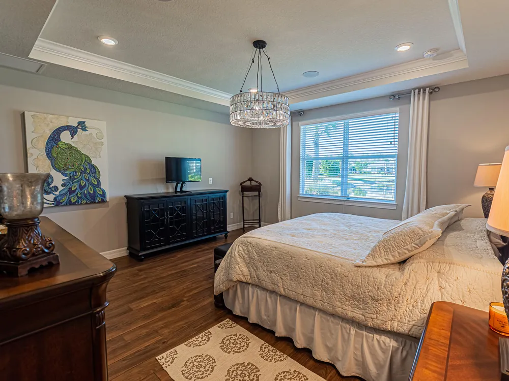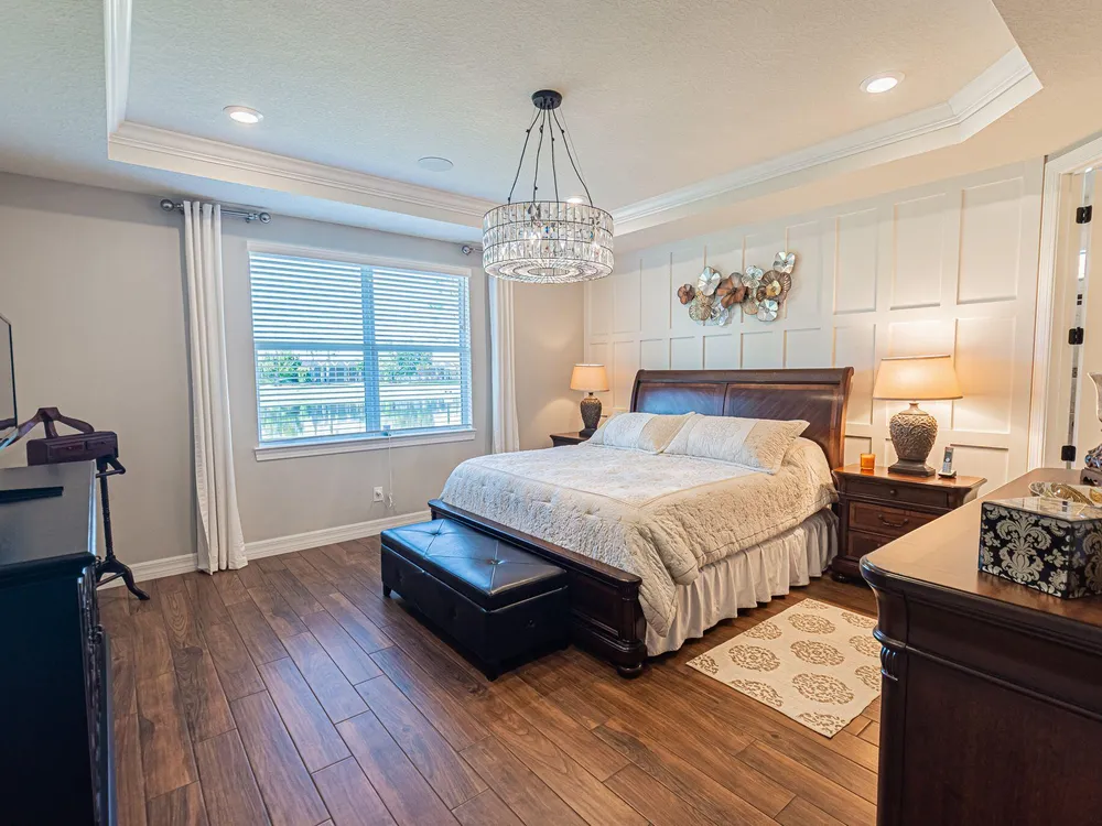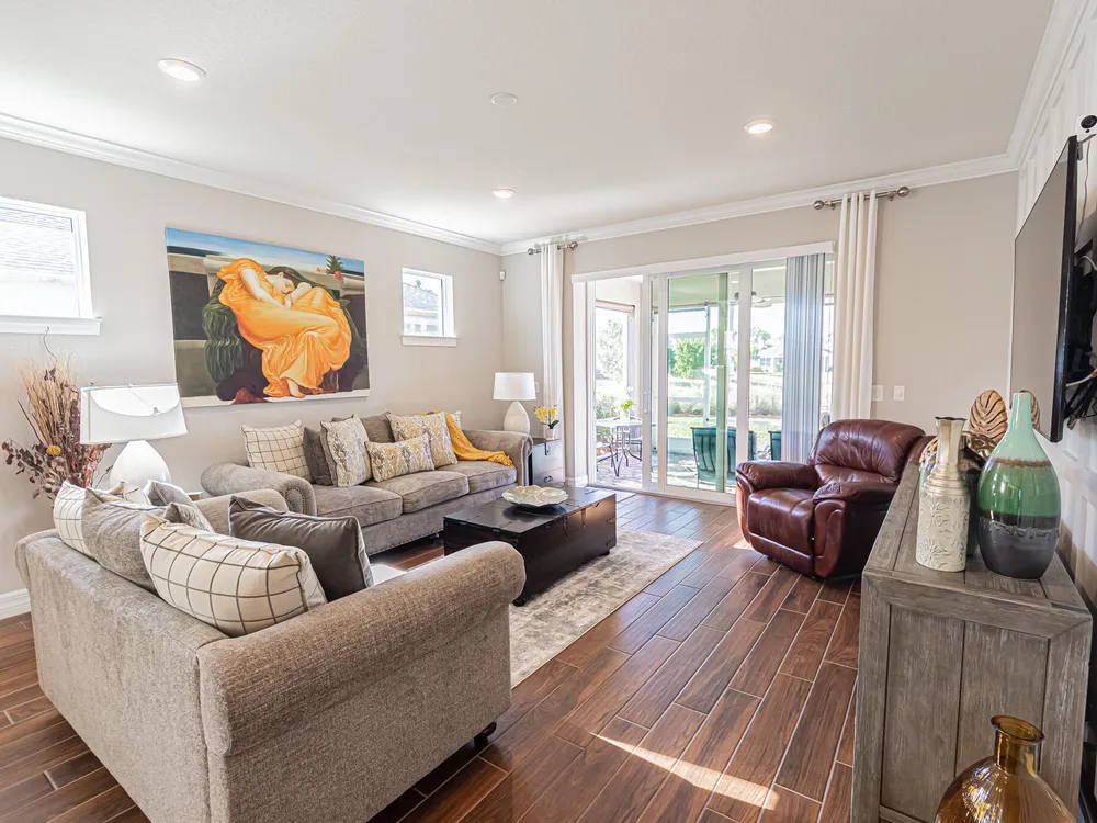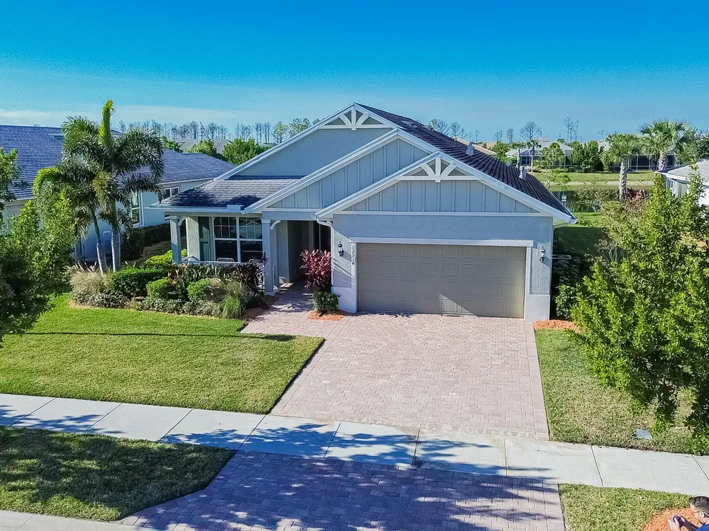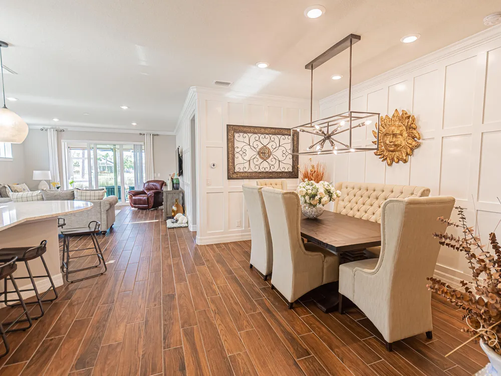 Welcome to this exquisite former model home, lakefront 2/2/2 w/flex room in DelWebb 55+ gated community. Every corner of this home is graced with over $100k in luxurious upgrades and finishes, from the crown molding, tray ceiling and custom wood trim to the rich wood-look plank tile floors that flow seamlessly throughout. The gourmet kitchen is a chef's dream, showcasing quartz countertops, huge island, ample 42'' wood cabinetry with pullouts, stainless appliances, gas cooking, raised dishwasher. A walk-in butler's pantry, complete with a wine cooler. Step outside into the covered paver lanai for year-round enjoyment. The picture frame screen and sunshades create a tranquil oasis. High impact glass. State of the art amenities including 2 Clubhouses, pools, fitness centers, pickleball, mo